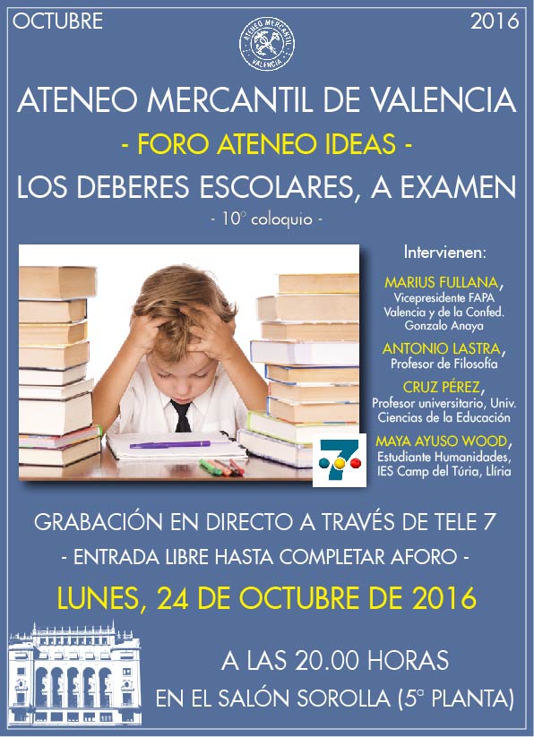 10º Debate: "Los deberes escolares, a examen" Grabación del décimo debate del Foro AteneoIDEAS: “Los deberes escolares, a examen” Resumen escrito de la 10ª grabación Cartel de la presentación del debate Ateneo Mercantil de Valencia2018-02-22T11:56:46+01:0024 octubre 2016|Debates 2016| Comparte esta historia FacebookTwitterRedditLinkedInTumblrPinterestCorreo electrónico Artículos relacionados