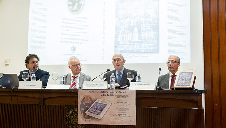 El Ateneo Mercantil de Valencia acogió este viernes, la presentación del libro “Fray Vicente Ferrer, hombre de Estado y de Iglesia”, obra del escritor, periodista y teólogo Baltasar Bueno, que ha sido prologado por el cardenal arzobispo de Valencia, Antonio Cañizares. La presentación tuvo lugar a las 12 horas y contó con la intervención de Jaime Lamo de Espinosa, Catedrático emérito de la Universidad Politécnica de Madrid, miembro de la Real Academia de Doctores de España y Cófrade de la Real Hermandad de la Celda del Glorioso Padre San Vicente Ferrer.