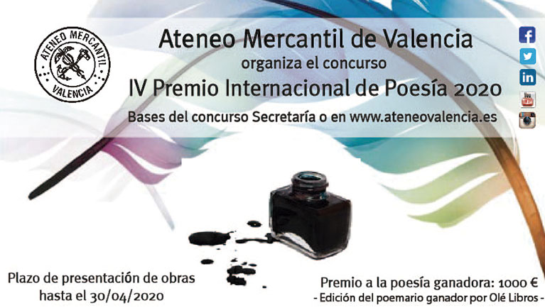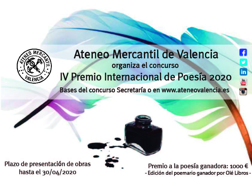 El Ateneo Mercantil convoca el IV PREMIO INTERNACIONAL DE POESÍA "ATENEO MERCANTIL DE VALENCIA 2020" en colaboración con la editorial Olé Libros. Un certamen que sigue ganando en importancia año tras año y cuyo premio es de 1000 euros para el ganador. Además, se editará un libro con el poema ganador y la Revista del Ateneo Mercantil hará una entrevista al vencedor o vencedora. El galardón el pasado año se quedó en Valencia, ya que se premió "Actos sucesivos" de José Antonio Olmedo López-Amor.