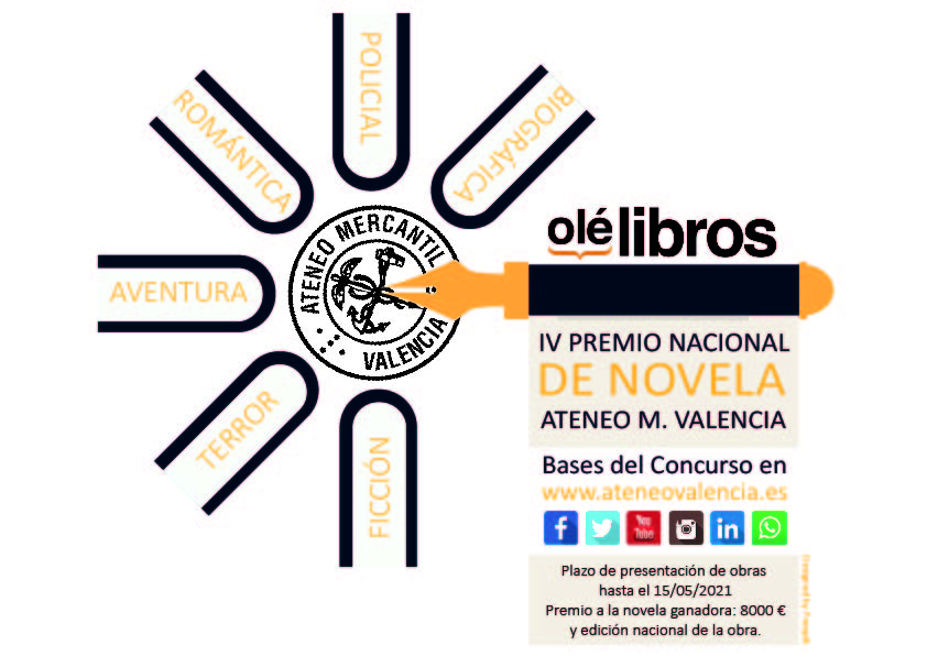 El Ateneo Mercantil de Valencia y la editorial Olé Libros convocan el IV Premio Nacional de Novela "Ateneo Mercantil de Valencia”, dotado con un premio de 8.000 euros, además de la publicación a nivel nacional de la obra ganadora y de la finalista. Un galardón que está creciendo en importancia muy rápidamente ya que en sus cuatro años de vida ha visto como se ha duplicado el premio cada año. El objetivo del concurso es promover la cultura y la creación literaria, con el propósito de descubrir a nuevos autores y tratar de difundir sus obras.