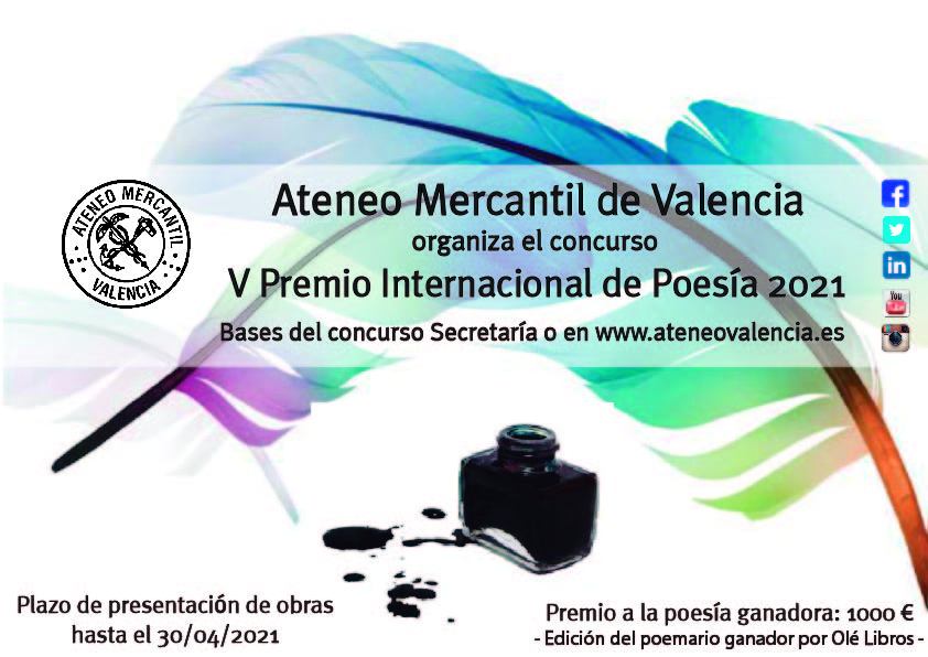 El Ateneo Mercantil de Valencia convoca el V Premio Internacional de Poesía "Ateneo Mercantil de Valencia 2021" en colaboración con la editorial Olé Libros. Un certamen que sigue ganando en importancia año tras año y cuyo premio es de 1000 euros para el ganador. Además, se editará un libro con el poema ganador y la Revista del Ateneo Mercantil hará una entrevista al vencedor o vencedora. El galardón del pasado año se fue a Nueva York, ya que se premió "De vidrio la Manzana" de la poeta argentina Ana Diz.