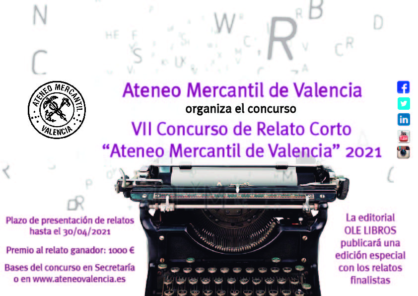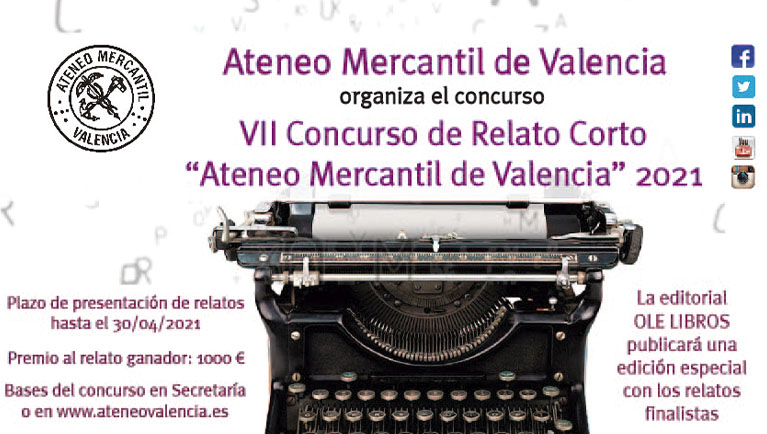 El Ateneo Mercantil de Valencia convoca el VI Concurso Nacional de Relato Corto "Ateneo Mercantil de Valencia" 2021 en colaboración con la editorial Olé Libros. Un concurso que ha ido creciendo en importancia y cuyo premio ha ido en las ediciones anteriores por toda España, el pasado año se marchó a Madrid, ya que se premió 'Cuando la tarde declina' de David Robisco, mientras que años anteriores se marchó a Barcelona, a Sevilla, a Valencia y a Torrejón de Ardoz.