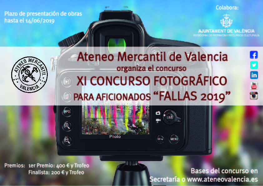Ya está aquí el XI Concurso Fotográfico para Aficionados Ateneo Mercantil de Valencia 'Fallas 2019' en el que podrán participar todos los socios o sus familiares directos (cónyuge, ascendientes y descendientes) que no sean profesionales de la fotografía, siempre que sus trabajos se ajusten a las presentes bases que se detallan en el siguiente enlace: