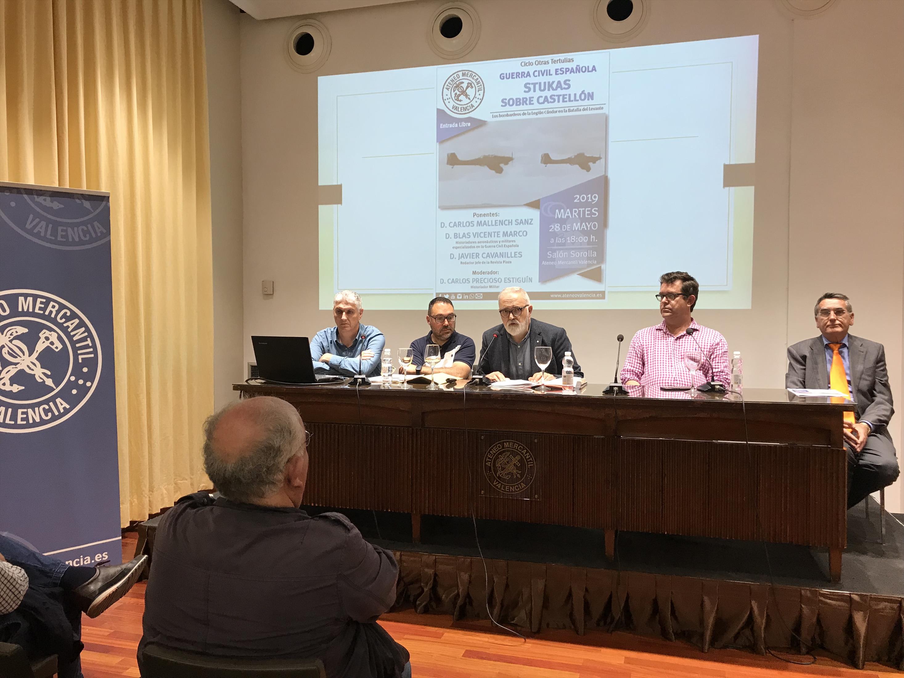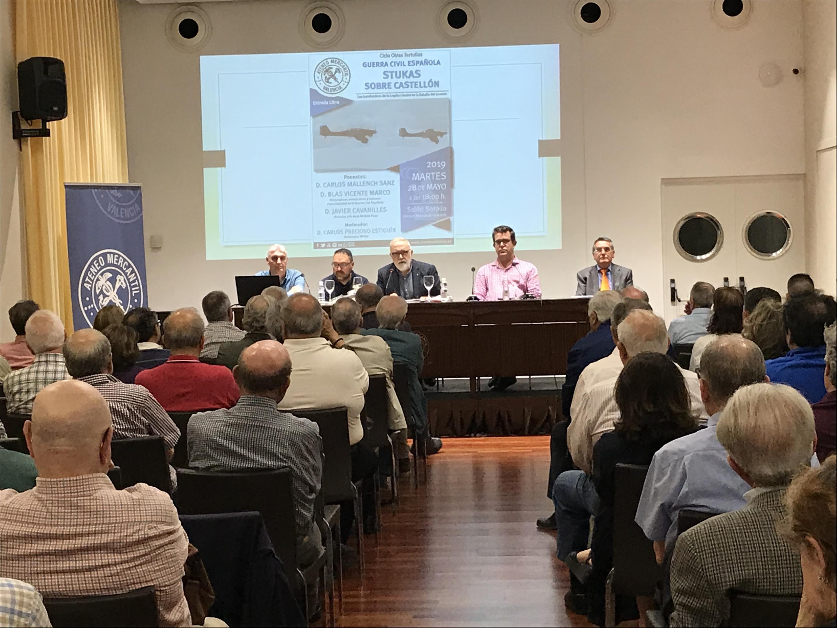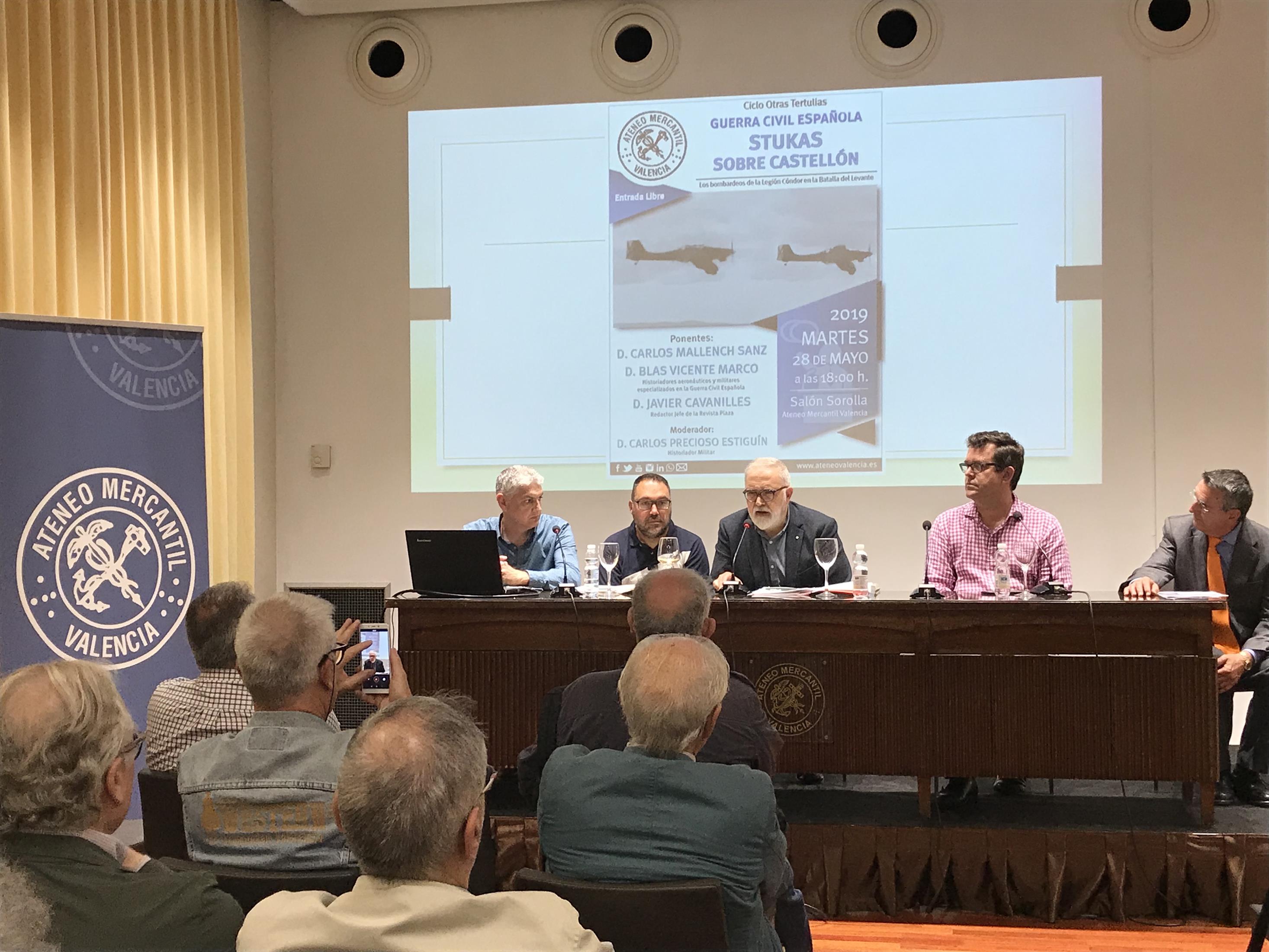 El ciclo Otras Tertulias del Ateneo Mercantil acogió la mesa redonda "Guerra Civil: Stukas sobre Castellón". En ella los investigadores Blas Vicente y Carlos Mallench explicaron que según sus investigaciones, la comarca de El Maestrazgo (Castellón) no fue objeto de una serie de bombardeos secretos organizados por Hitler a espaldas de Franco como se ha apuntado en algunos reportajes, ni la participación de la Legión Cóndor llevó al Führer a ordenar la producción en masa de bombardeos de precisión JU 87 (los míticos ‘stukas’ de ataque en picado), ni la participación de la aviación nazi en esa operación afectó en lo más mínimo el rumbo de la II Guerra Mundial.