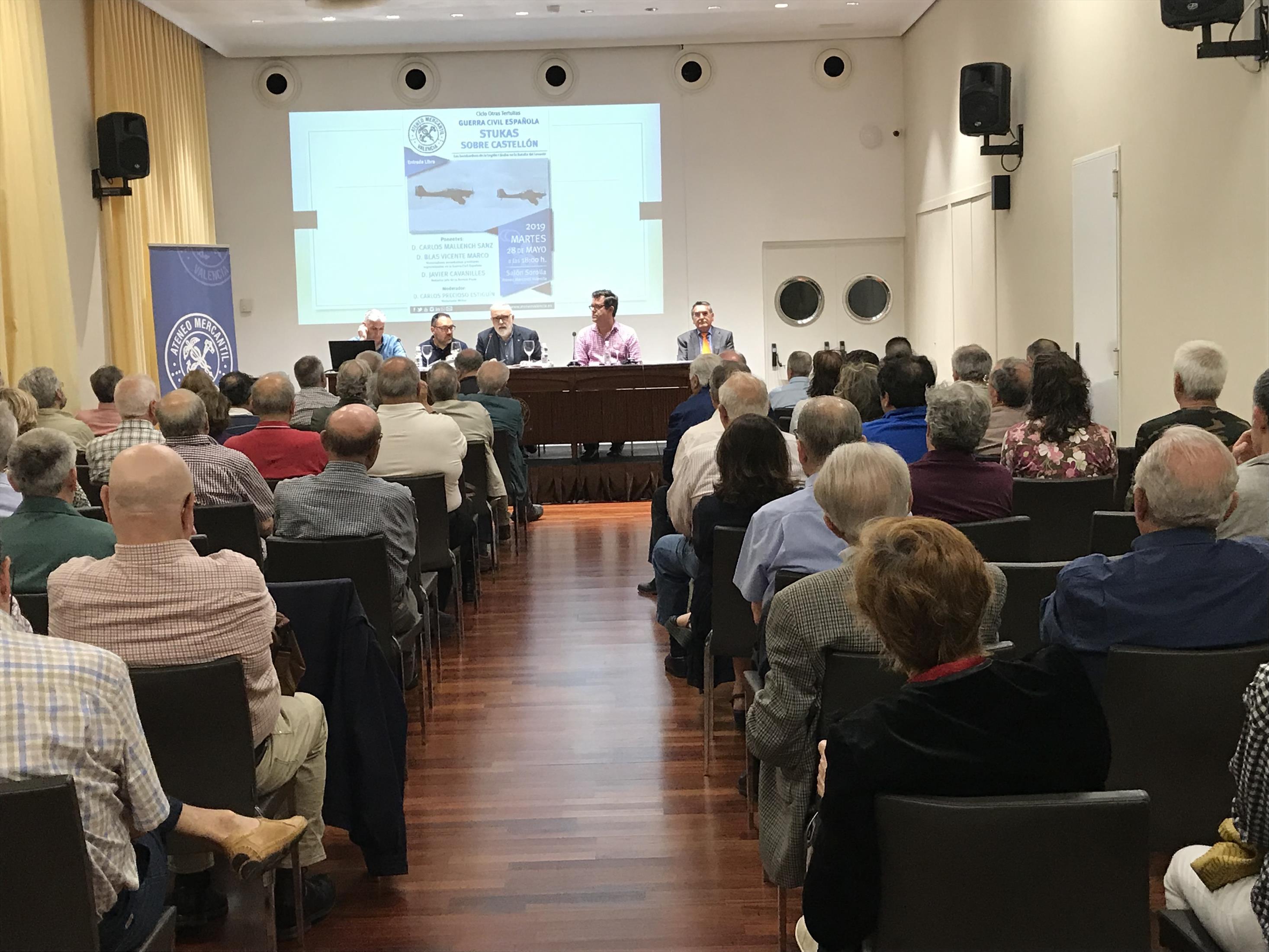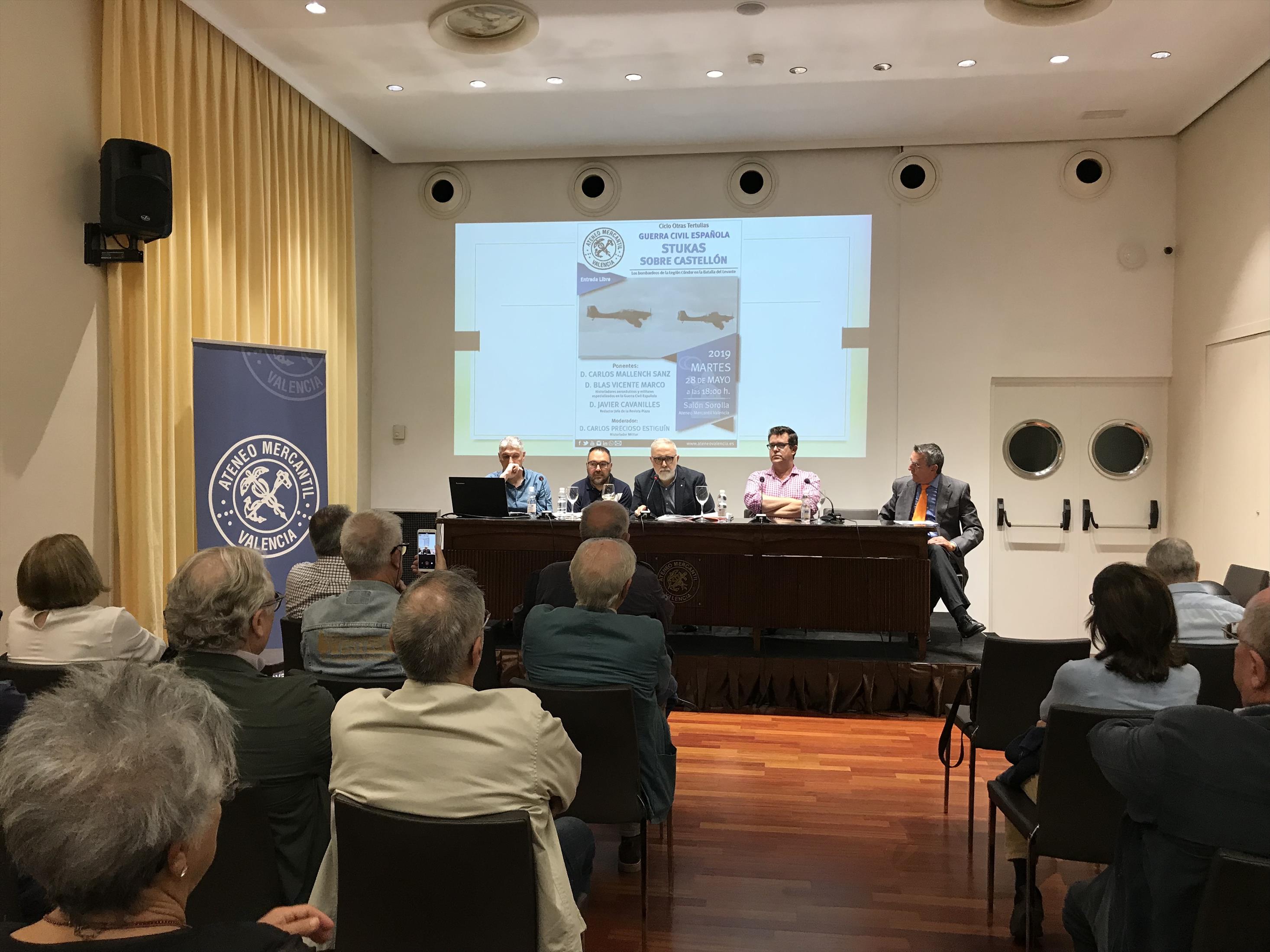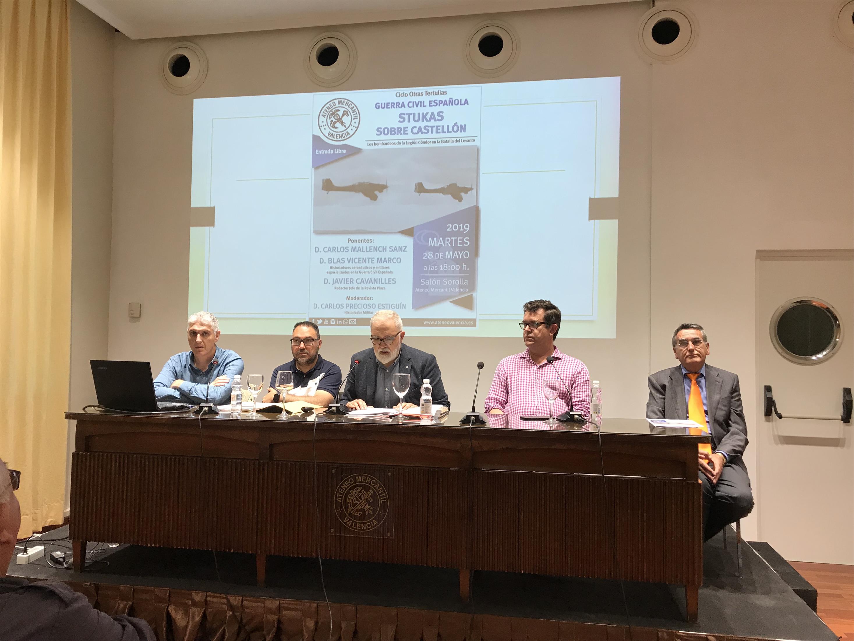 El ciclo Otras Tertulias del Ateneo Mercantil acogió la mesa redonda "Guerra Civil: Stukas sobre Castellón". En ella los investigadores Blas Vicente y Carlos Mallench explicaron que según sus investigaciones, la comarca de El Maestrazgo (Castellón) no fue objeto de una serie de bombardeos secretos organizados por Hitler a espaldas de Franco como se ha apuntado en algunos reportajes, ni la participación de la Legión Cóndor llevó al Führer a ordenar la producción en masa de bombardeos de precisión JU 87 (los míticos ‘stukas’ de ataque en picado), ni la participación de la aviación nazi en esa operación afectó en lo más mínimo el rumbo de la II Guerra Mundial.