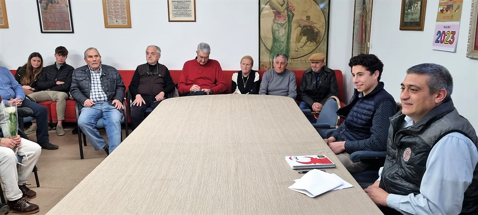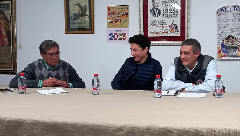Nicasio Jiménez tomó la palabra para saludar a los asistentes, excusar la ausencia de Paco Roger por circunstancias personales, presentar brevemente al invitado y dar paso a Salvador Chapa, que leyó un dossier de prensa sobre la trayectoria taurina de Bruno desde abril de 2021 hasta enero de 2023.
