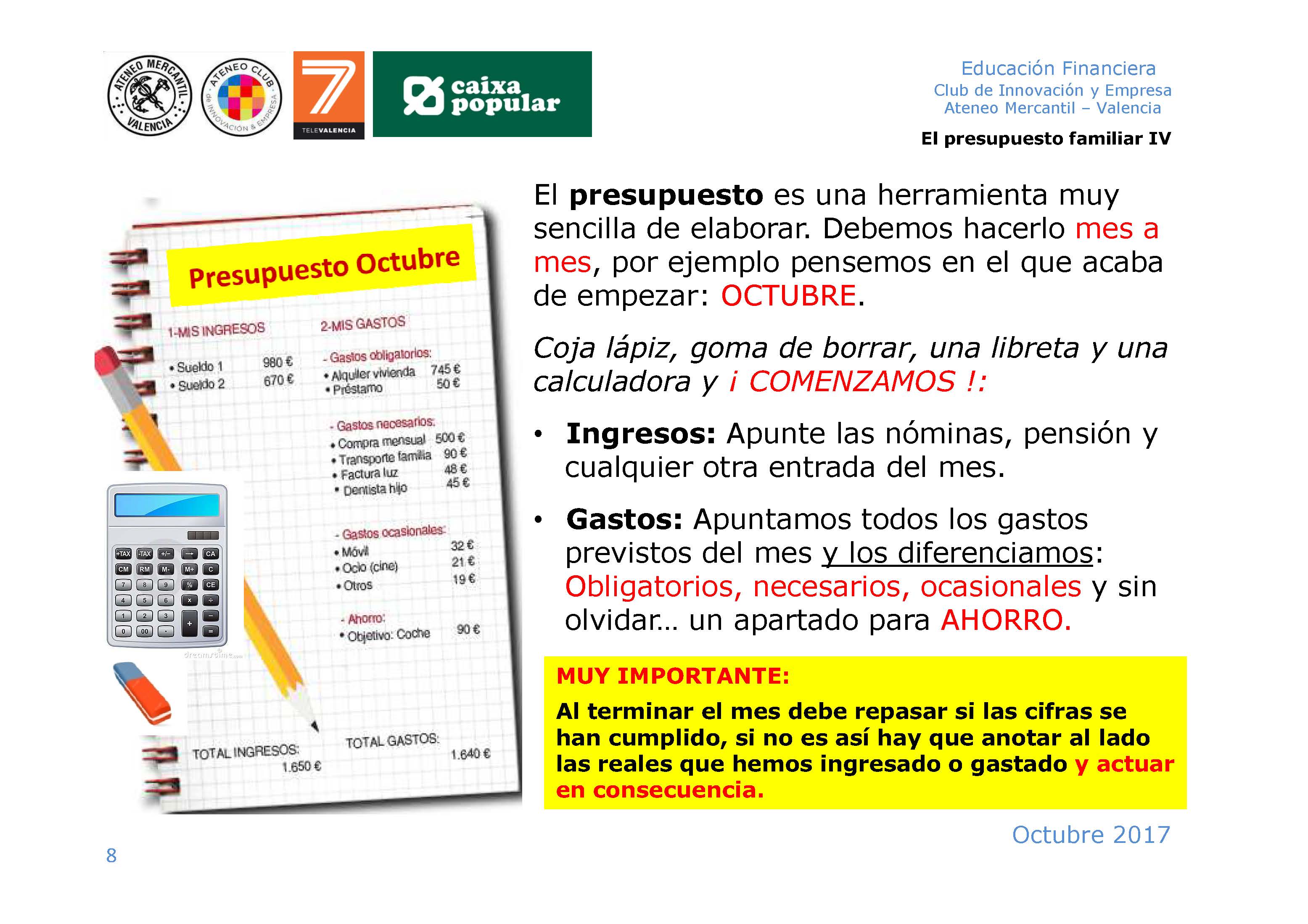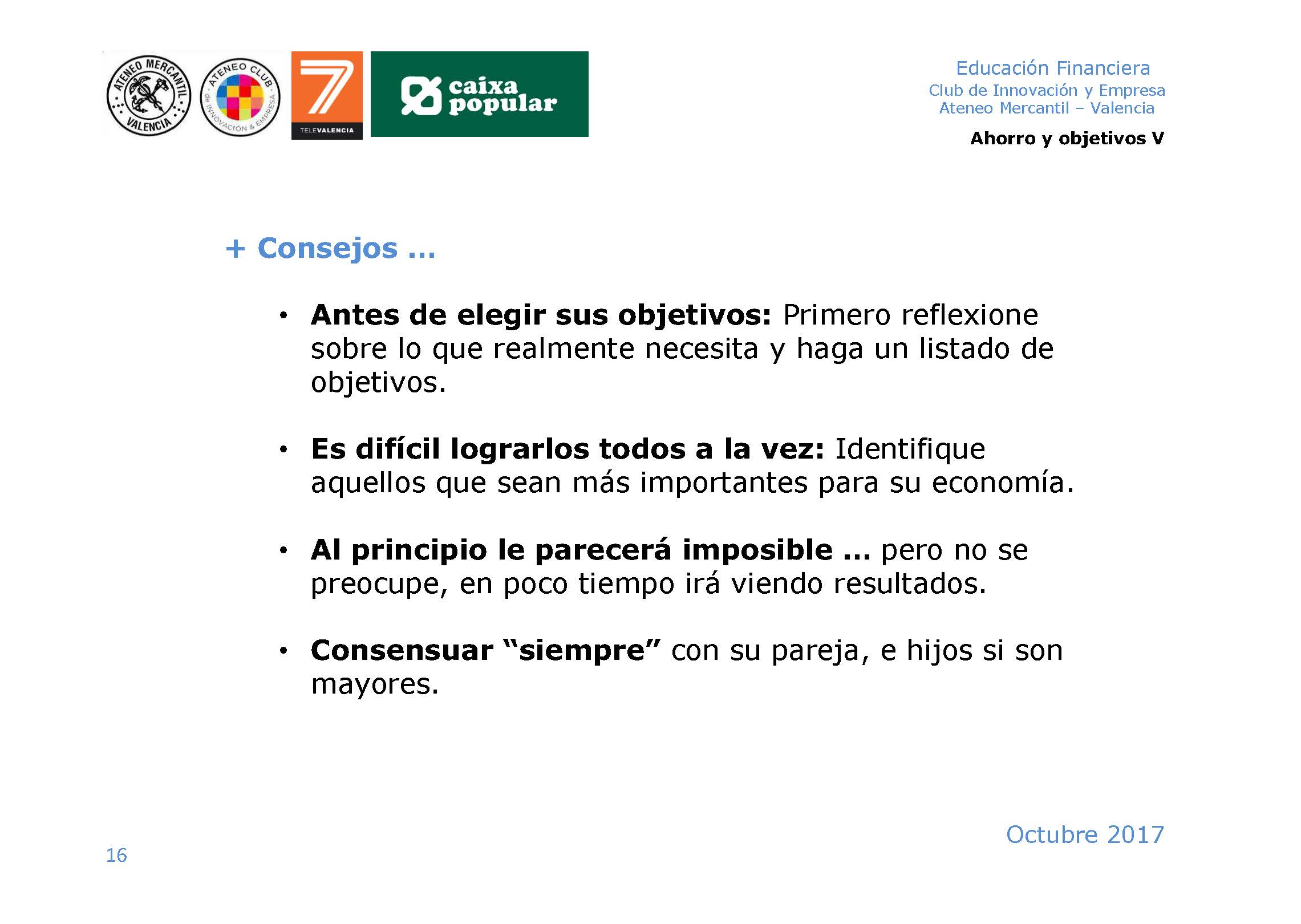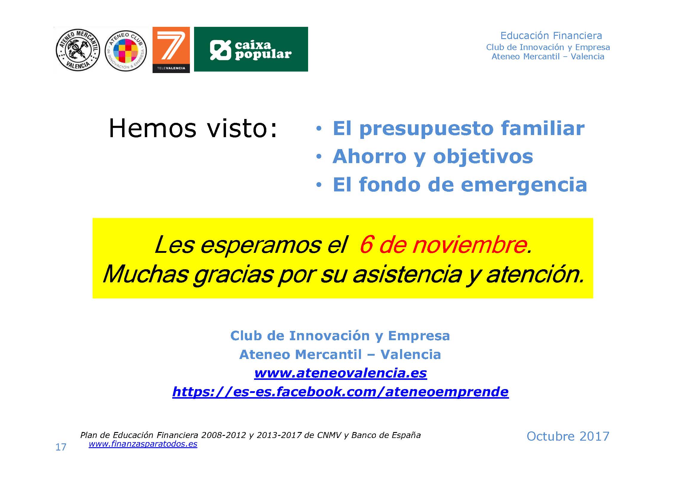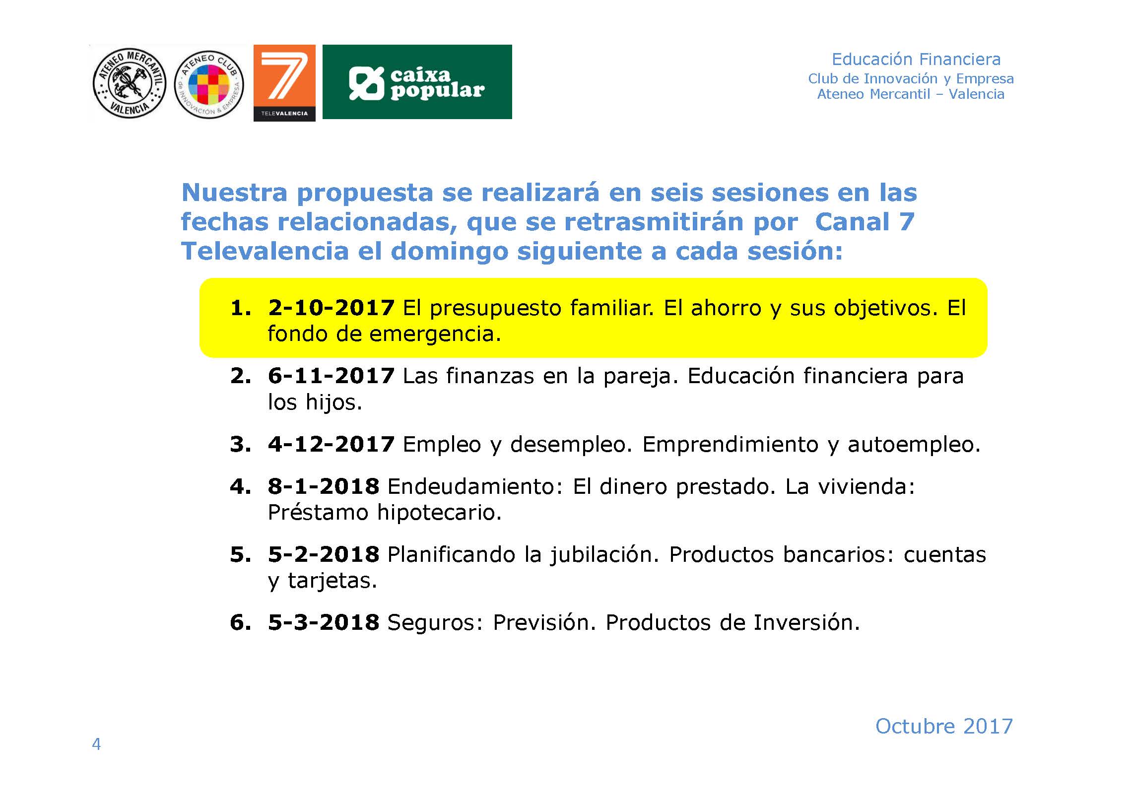 El pasado 2 de octubre “Día de la Educación Financiera” tuvo lugar en el Salón Exposiciones de Ateneo Valencia, la primera de las charlas-coloquio del ciclo “Educación Financiera para el entorno familiar” que organiza el Ateneo Club de Innovación y Empresa con el patrocinio de Caixa Popular. Esta primera sesión en la que se presentaban los temas “El presupuesto familiar y el ahorro y sus objetivos” fue grabada por las cámaras de Canal 7 Televalencia y posteriormente emitida por esta cadena valenciana.
