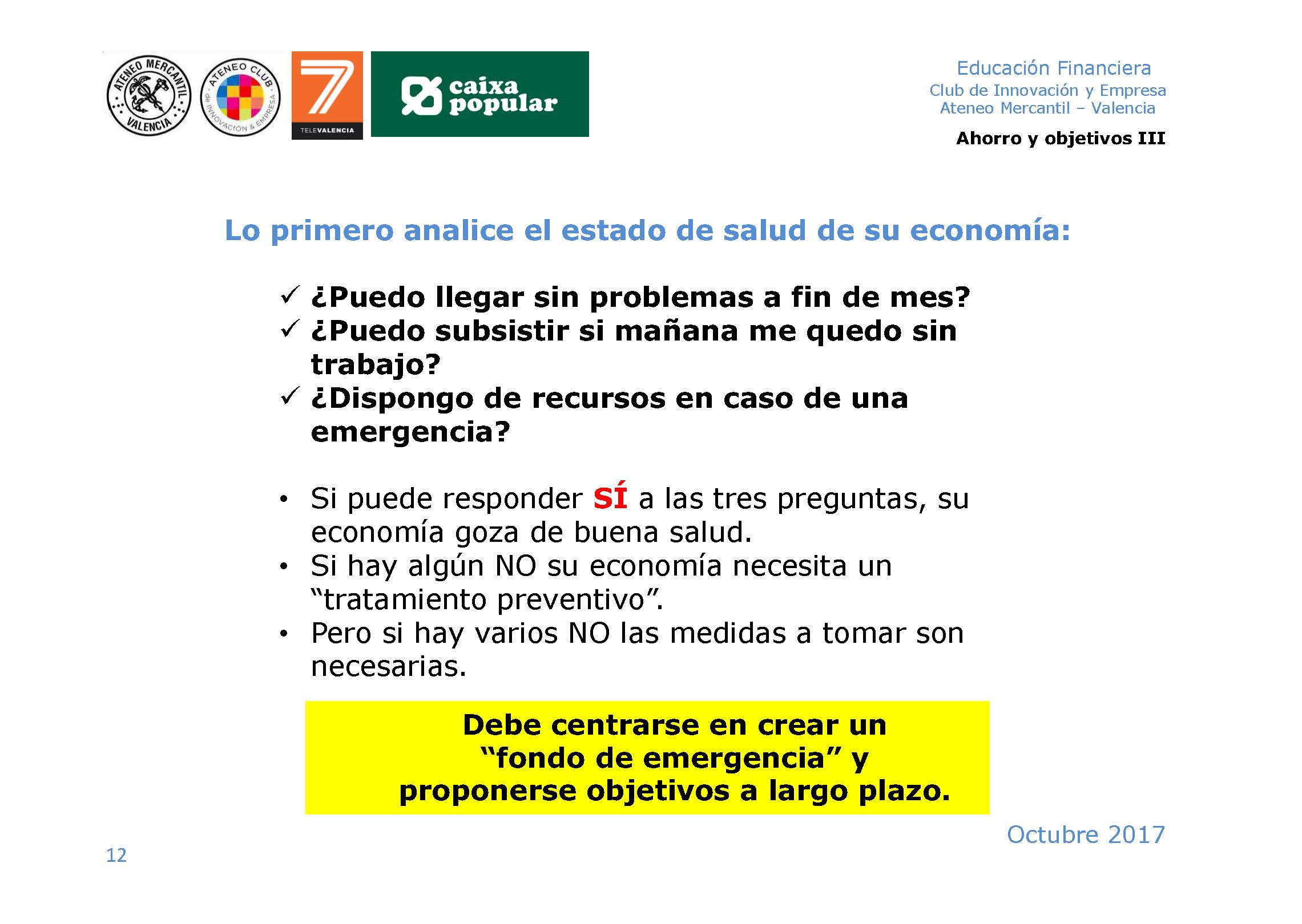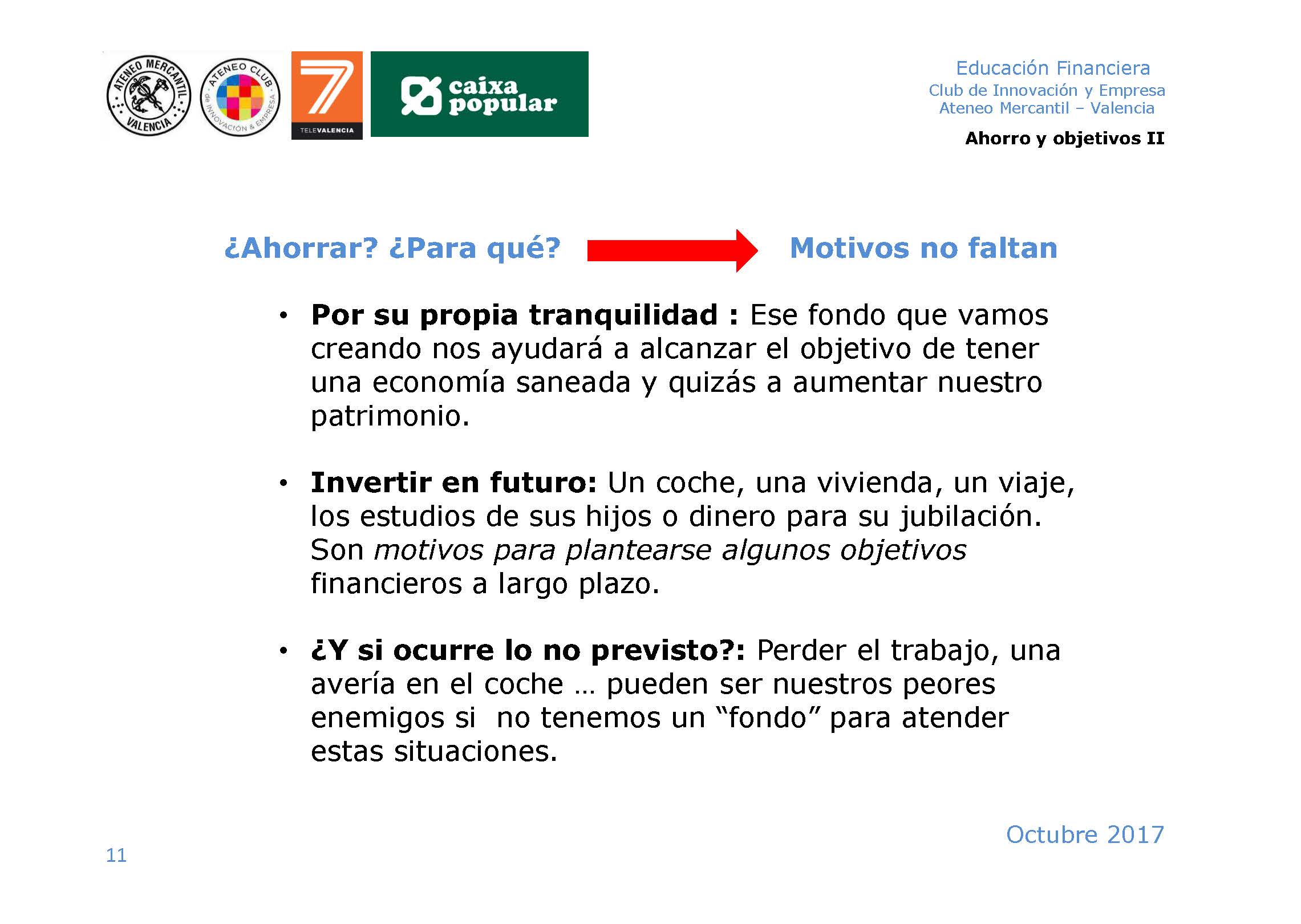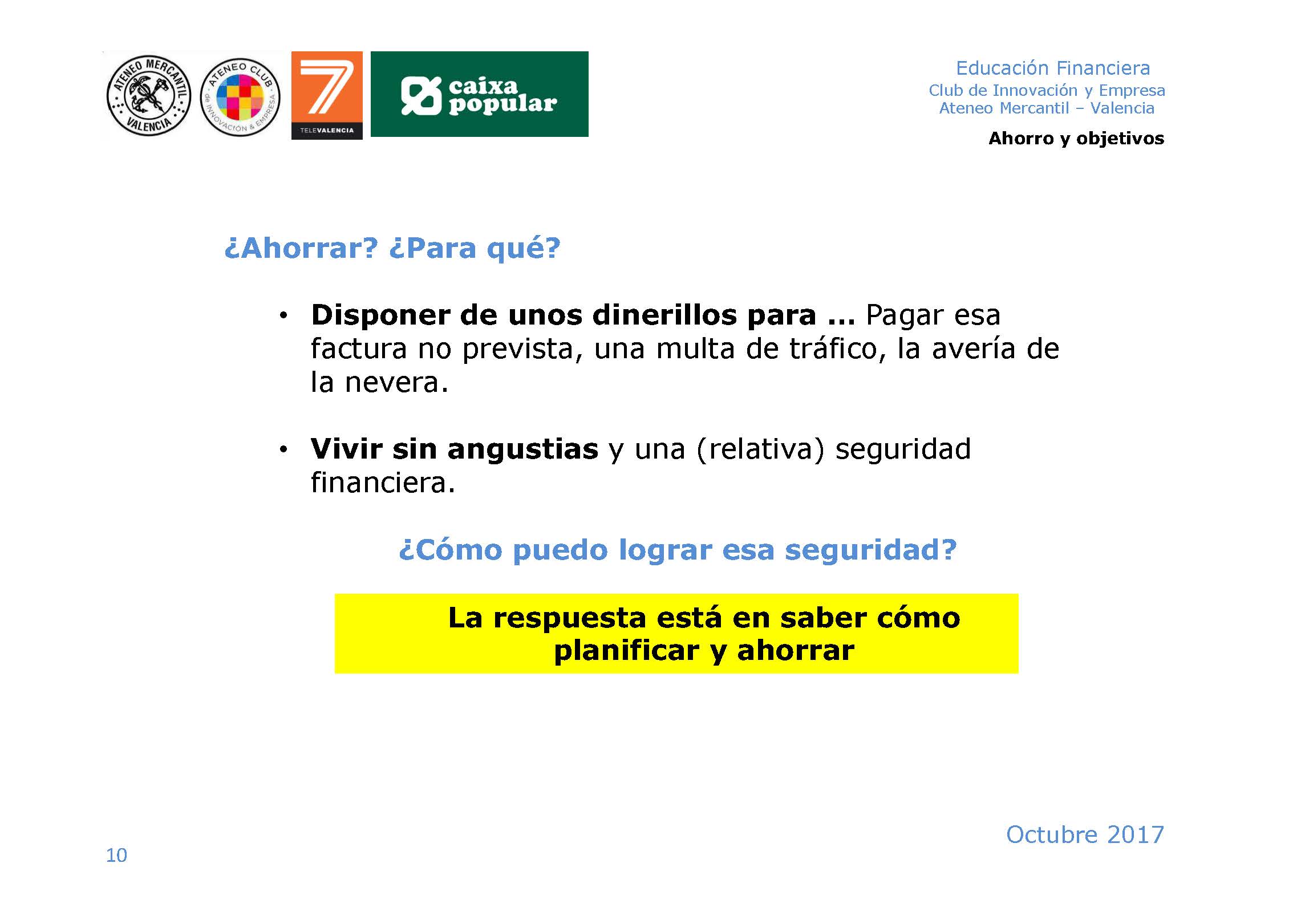 El pasado 2 de octubre “Día de la Educación Financiera” tuvo lugar en el Salón Exposiciones de Ateneo Valencia, la primera de las charlas-coloquio del ciclo “Educación Financiera para el entorno familiar” que organiza el Ateneo Club de Innovación y Empresa con el patrocinio de Caixa Popular. Esta primera sesión en la que se presentaban los temas “El presupuesto familiar y el ahorro y sus objetivos” fue grabada por las cámaras de Canal 7 Televalencia y posteriormente emitida por esta cadena valenciana.