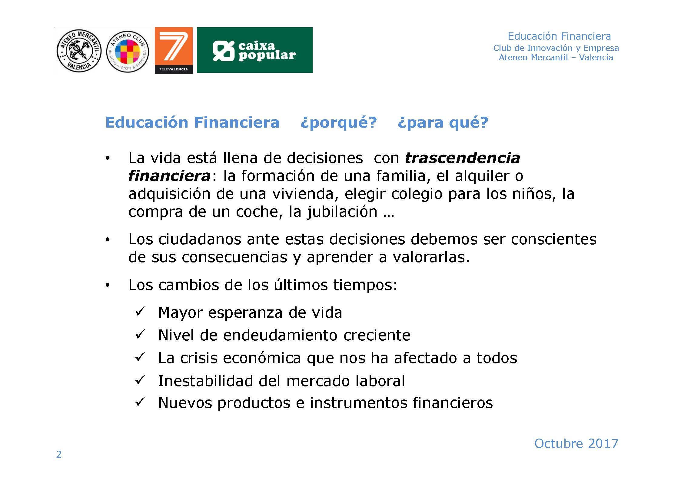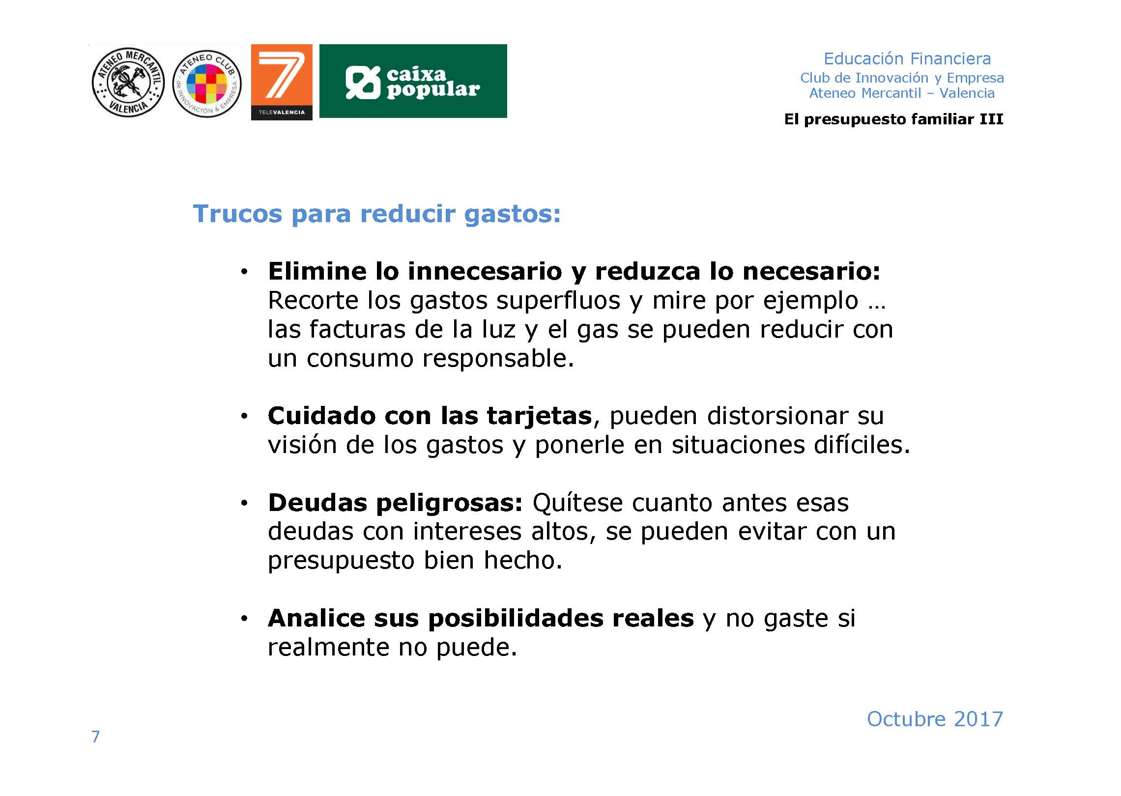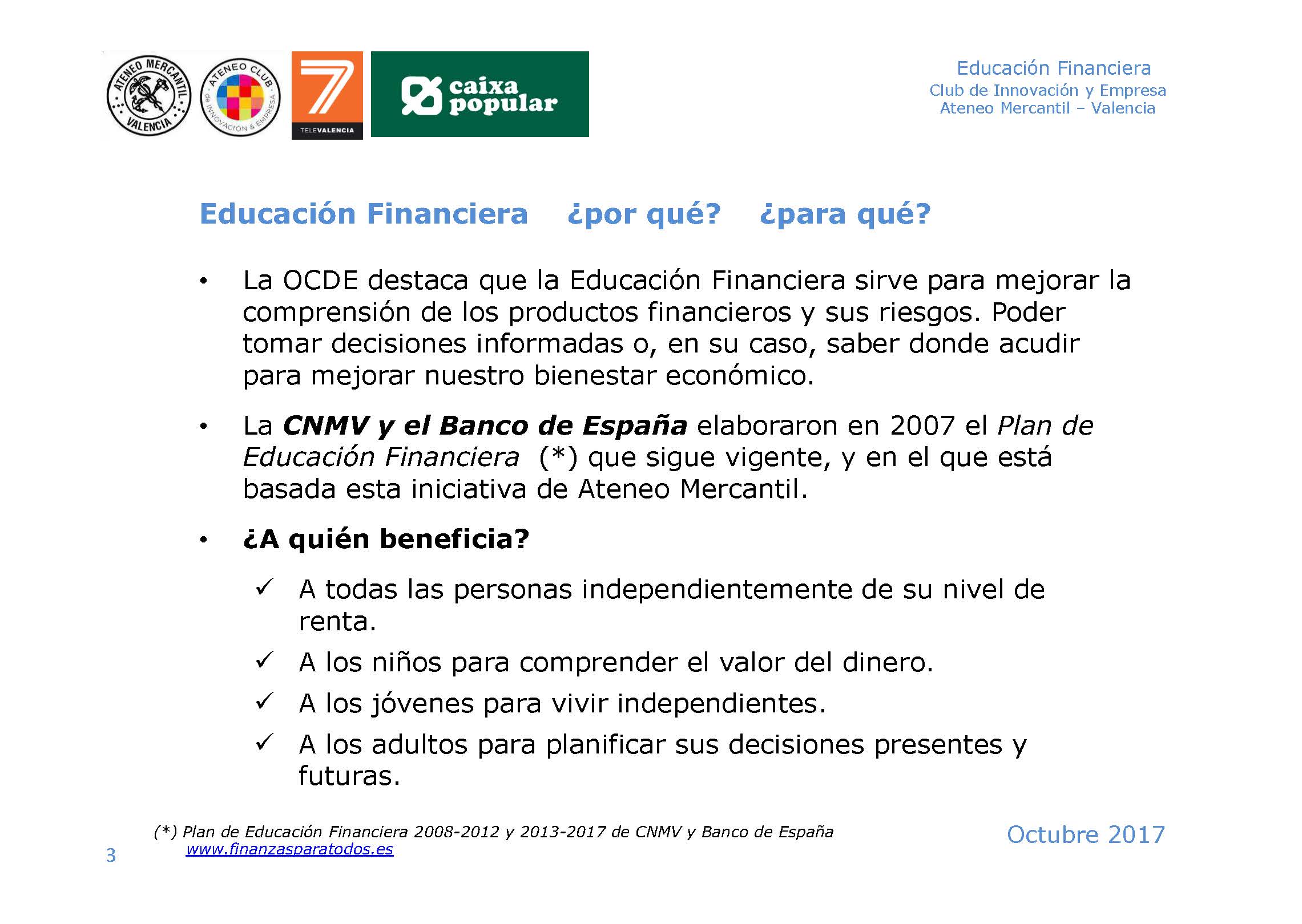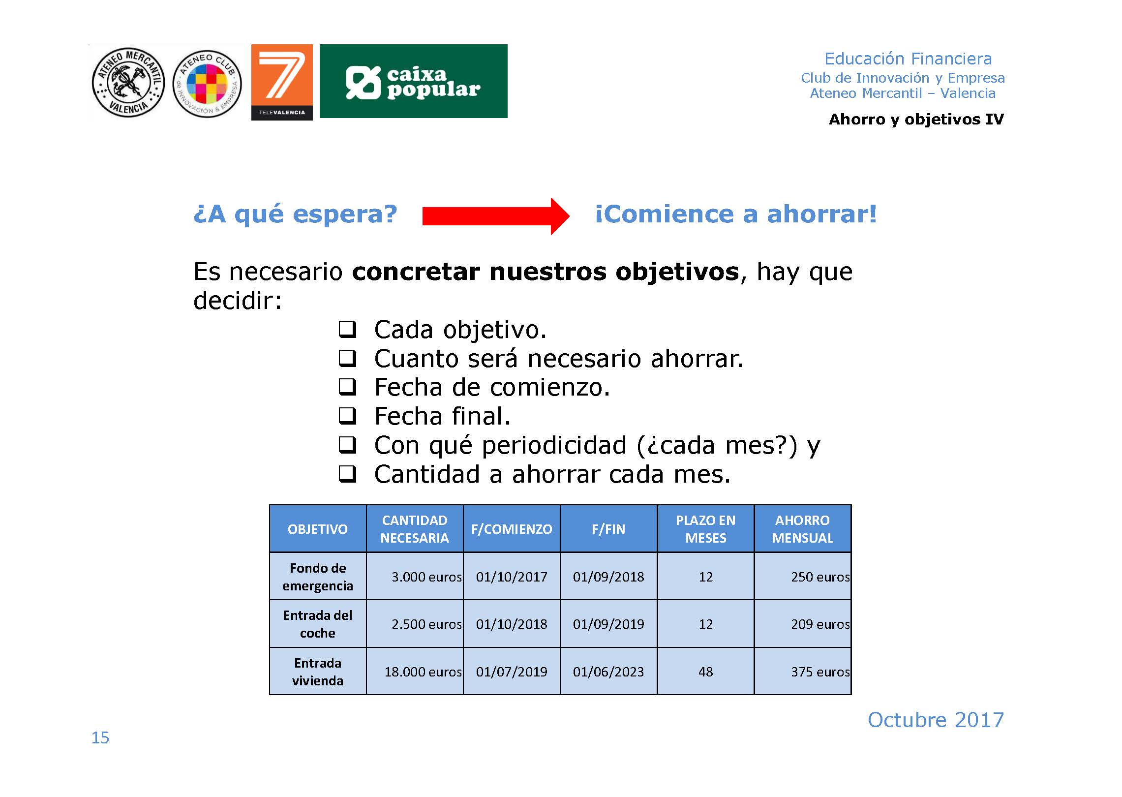 El pasado 2 de octubre “Día de la Educación Financiera” tuvo lugar en el Salón Exposiciones de Ateneo Valencia, la primera de las charlas-coloquio del ciclo “Educación Financiera para el entorno familiar” que organiza el Ateneo Club de Innovación y Empresa con el patrocinio de Caixa Popular. Esta primera sesión en la que se presentaban los temas “El presupuesto familiar y el ahorro y sus objetivos” fue grabada por las cámaras de Canal 7 Televalencia y posteriormente emitida por esta cadena valenciana.