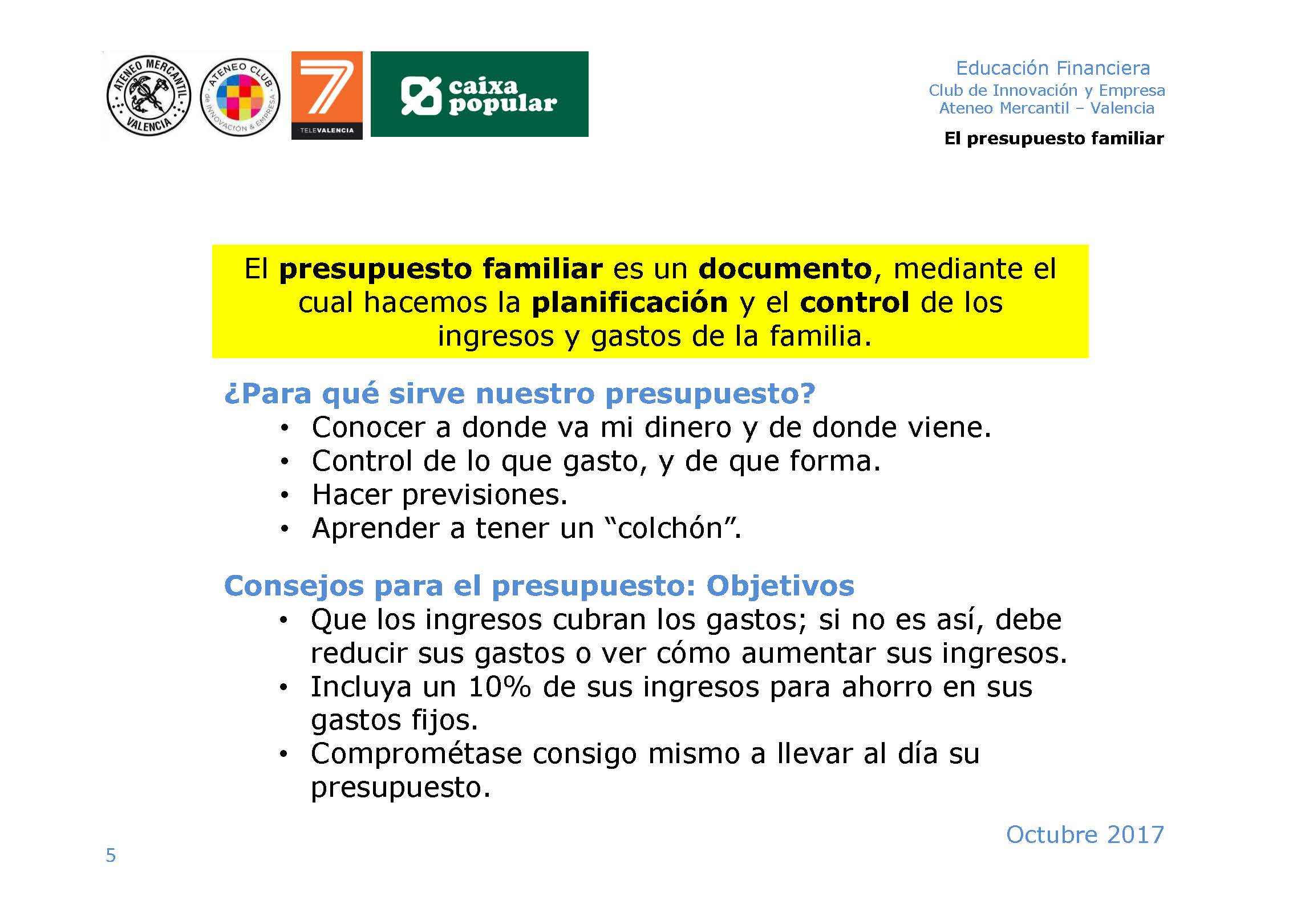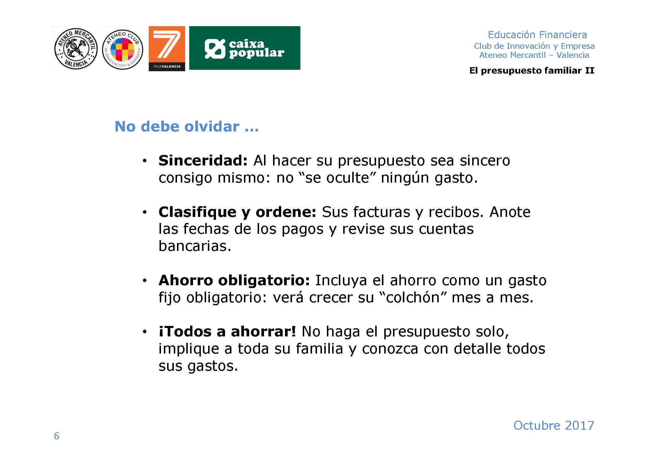 En la misma se plantearon la forma de realizar el presupuesto familiar, la importancia del ahorro como objetivo de futuro y la creación de un fondo de emergencia y sus beneficios. Si no pudo asistir a esta interesante sesión, aquí tienes la grabación completa y a las diapositivas que se pasaron en la sesión: