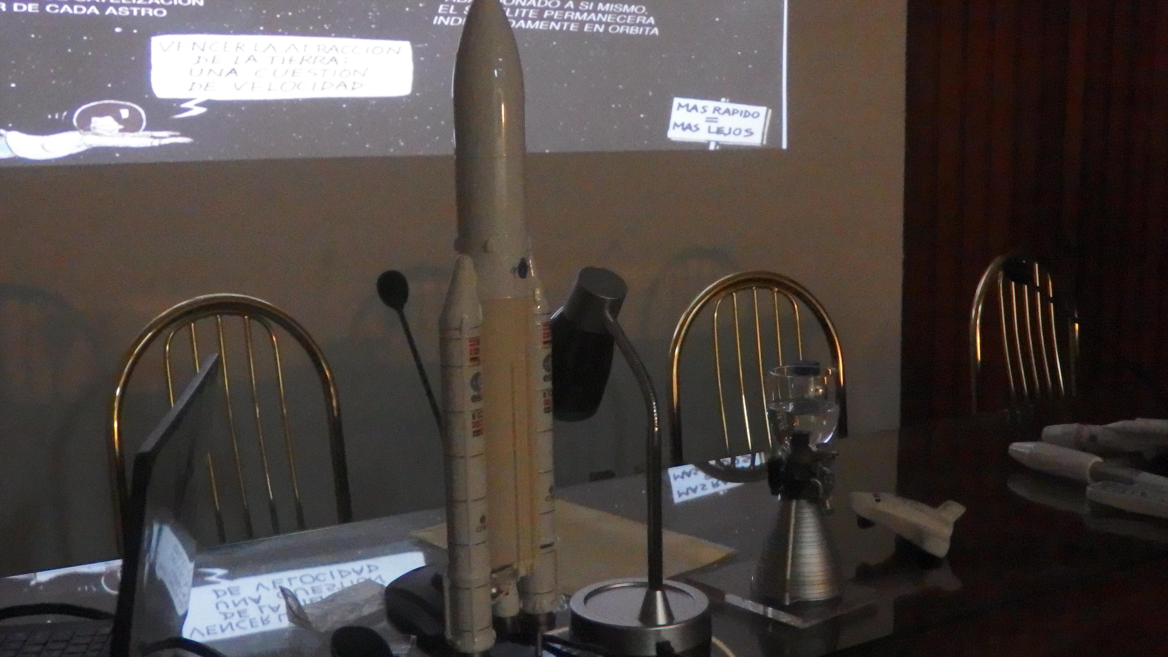 Durante la tertulia nos explicó los principios por los cuales el cohete ARIANE puede ir al espacio y lanzar satélites en órbita.