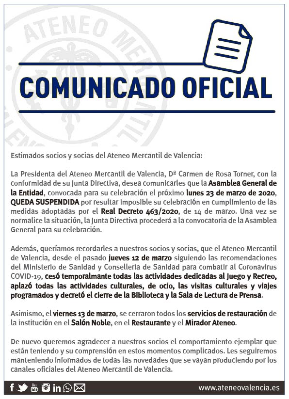Estimados socios y socias del Ateneo Mercantil de Valencia. La Presidenta del Ateneo Mercantil de Valencia, Dª Carmen de Rosa Torner, con la conformidad de su Junta Directiva, desea comunicarles que la Asamblea General de la Entidad, convocada para su celebración el próximo lunes 23 de marzo de 2020, QUEDA SUSPENDIDA por resultar imposible su celebración en cumplimiento de las medidas adoptadas por el Real Decreto 463/2020, de 14 de marzo. Una vez se normalice la situación, la Junta Directiva procederá a la convocatoria de la Asamblea General para su celebración.