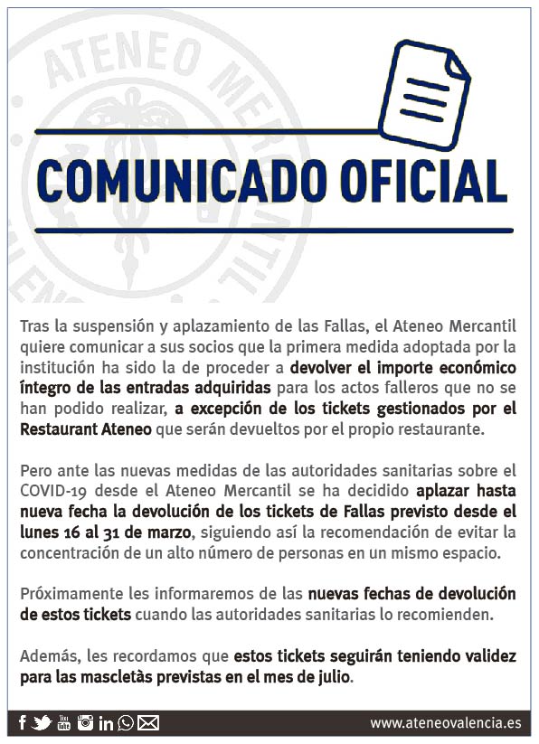 Tras la suspensión y aplazamiento de las Fallas, el Ateneo Mercantil de Valencia quiere comunicar a sus socios y socias que la primera medida adoptada por la institución ha sido la de proceder a devolver el importe económico íntegro de las entradas adquiridas para todos los actos falleros que no se han podido realizar en nuestra casa, a excepción de los tickets gestionados por el Restaurant Ateneo que serán devueltos por el propio restaurante.