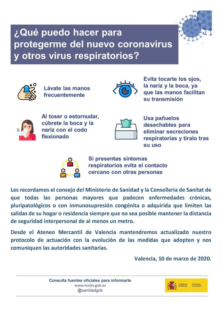 Queridos socios y socias del Ateneo Mercantil de Valencia ponemos en vuestro conocimiento las medidas que estamos adoptando desde hace una semana respecto al coronavirus siguiendo las recomendaciones de las autoridades a nivel autonómico y nacional.