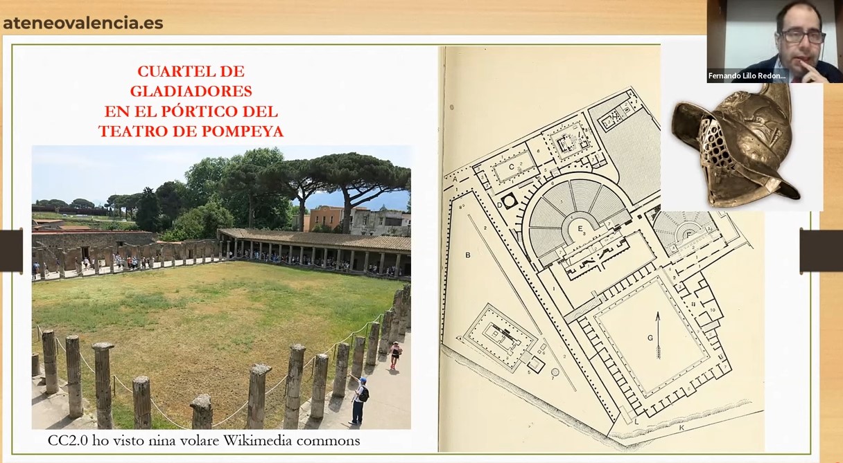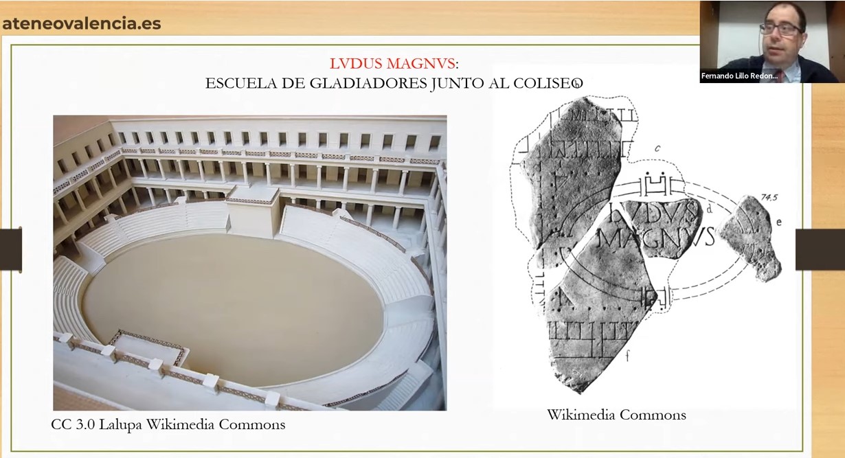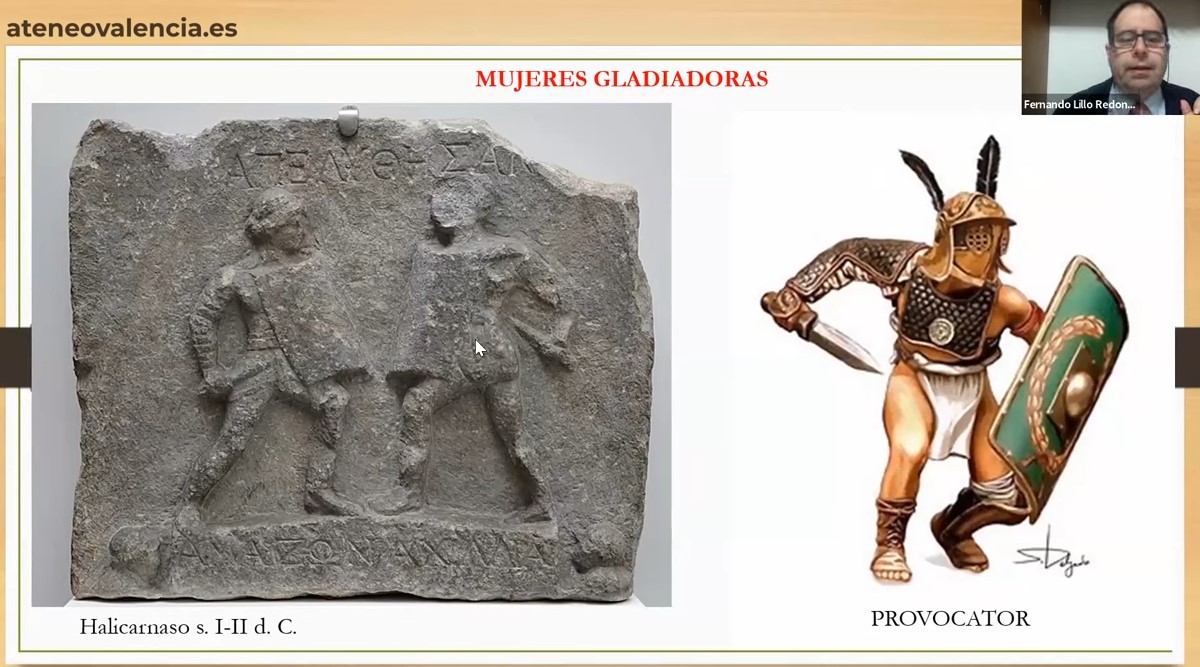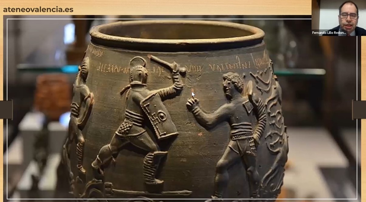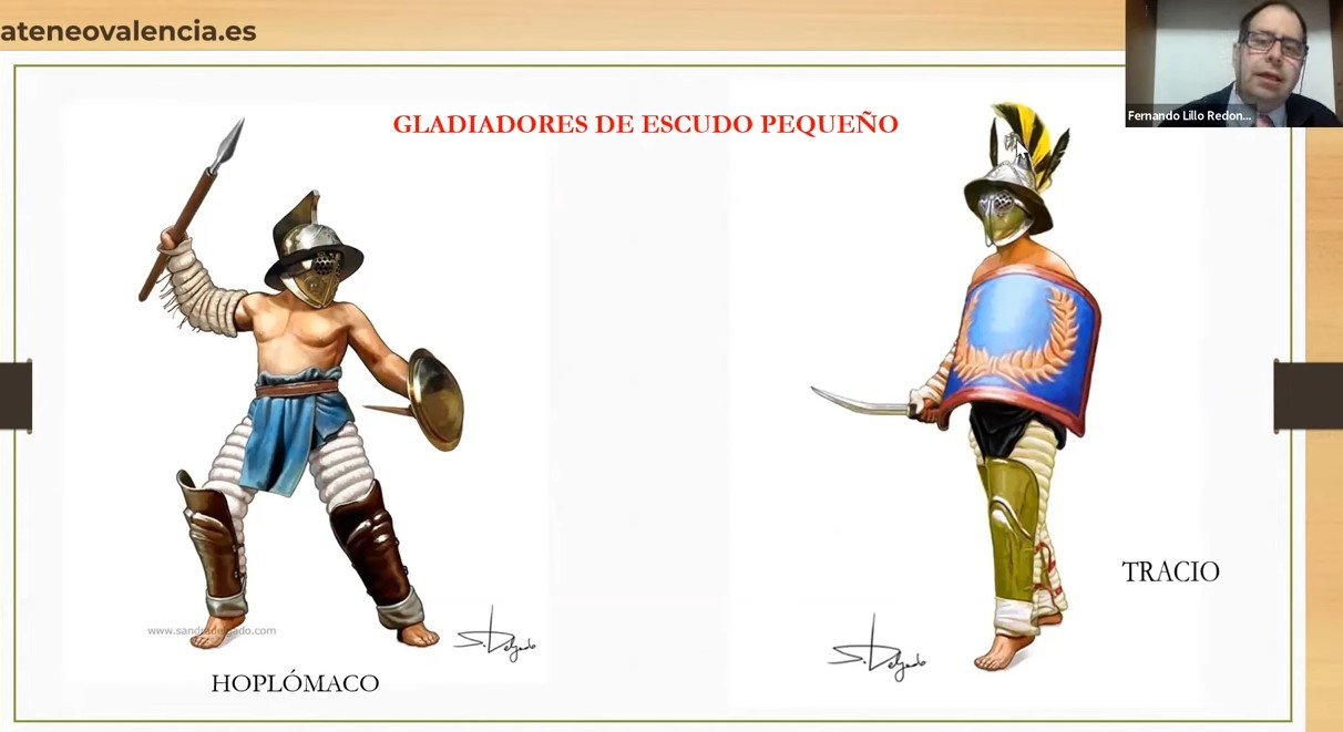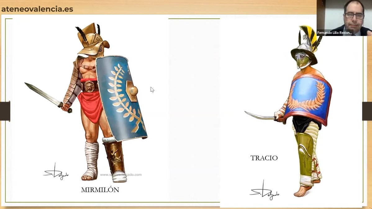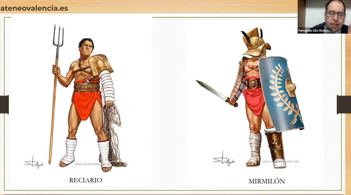 Fernando Lillo Redonet, Doctor en Filología Clásica por la Universidad de Salamanca, escritor y colaborador en Historia National Geographic y Arqueología e Historia nos ofreció una conferencia en la que nos acercó la figura de los gladiadores antes y durante el espectáculo, así como el impacto de estos combates en el público. Antes del espectáculo vimos los orígenes funerarios y rituales de este tipo de luchas, además, nos adentramos en una escuela de gladiadores para saber cómo eran reclutados, cómo entrenaban y de qué se alimentaban, cuáles eran las relaciones dentro de la familia gladiatoria y qué tipos de gladiadores había con sus principales características.