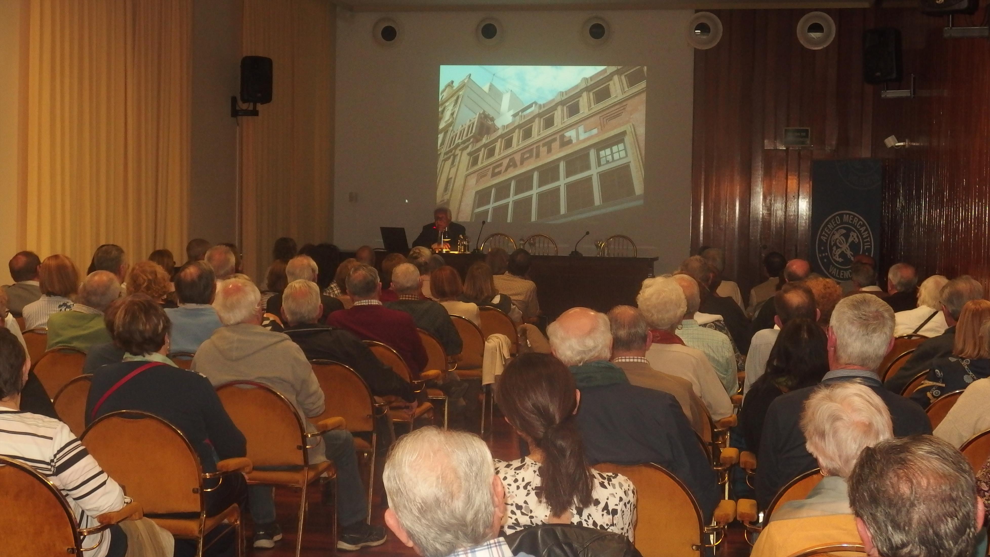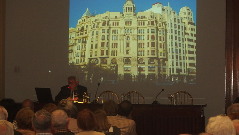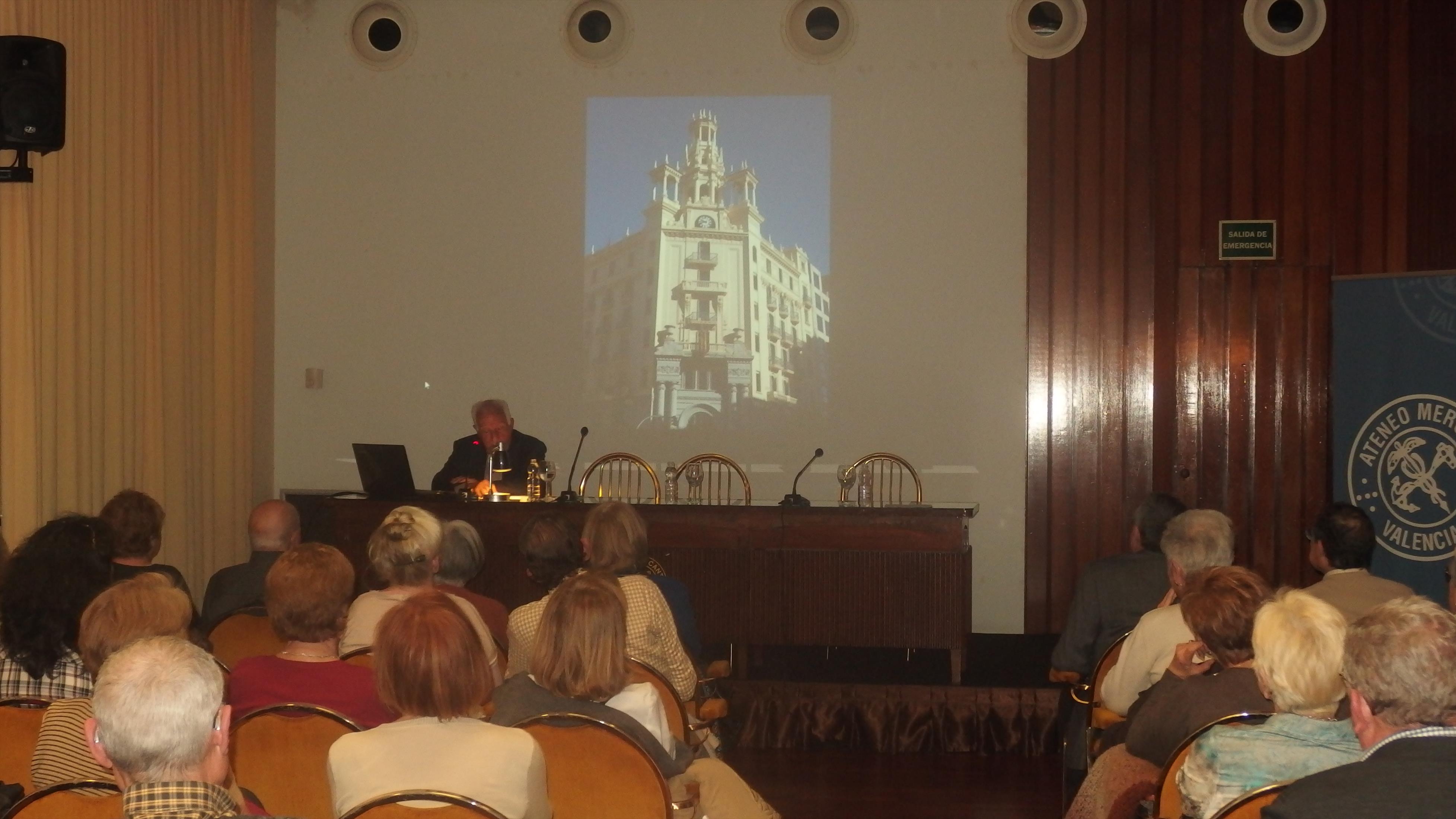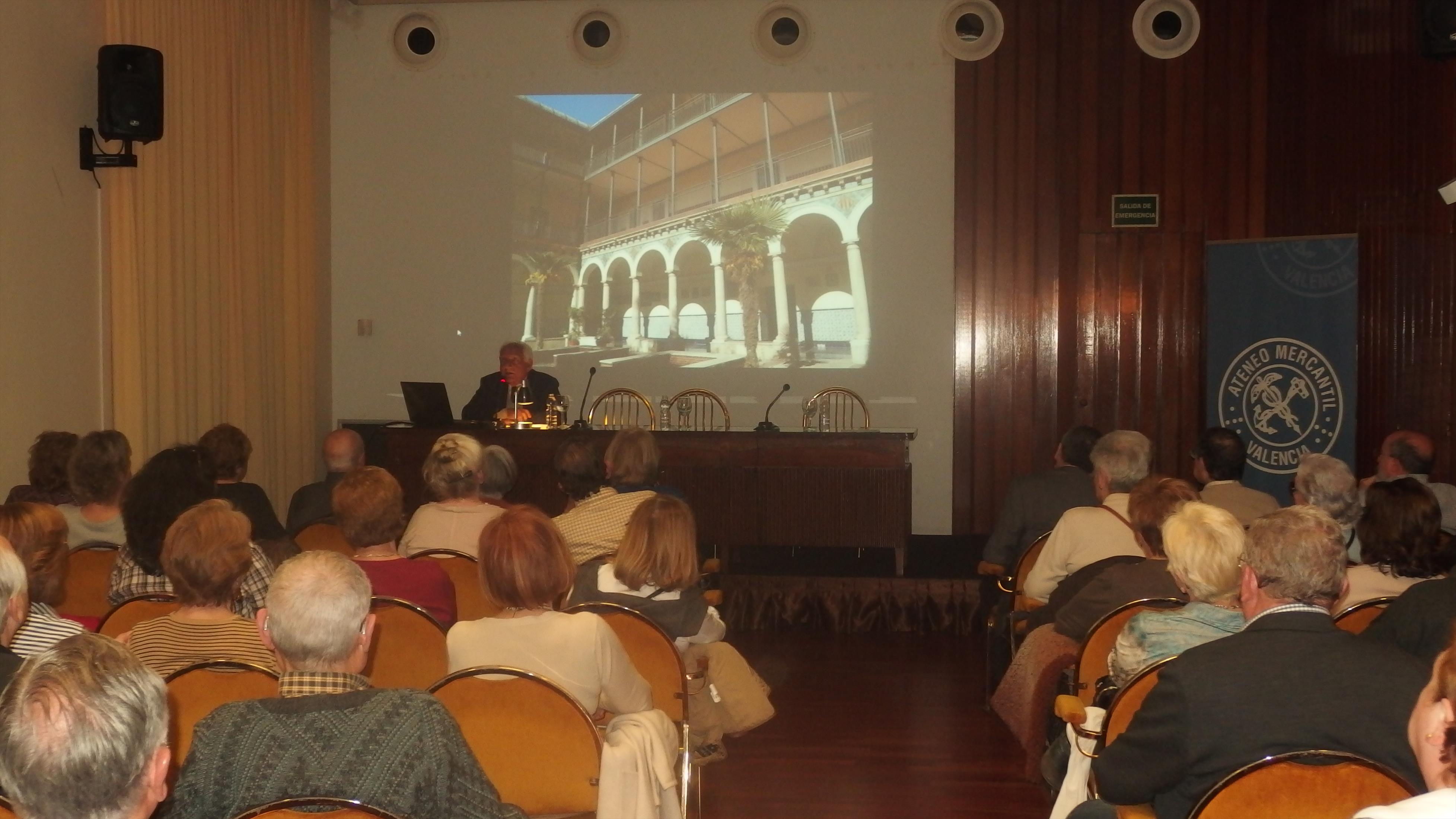 El profesor D. Amando García nos recreó su paseo virtual por el Barrio de San Francisco, en el centro histórico, apoyado en fotografías personales o cedidas, en el que destacó la presencia de numerosos edificios de gran interés arquitectónico o histórico, entre los que, entre otros, se encuentran el Instituto Luis Vives, la Estación Central de RENFE, el desaparecido convento de San Francisco, que da nombre a este barrio, el Colegio del Patriarca, el Ayuntamiento de la ciudad, el Banco de Valencia y. por supuesto, nuestra Sede del Ateneo Mercantil, todo ello contado de forma que consigue captar toda la atención de los asistentes a estas conferencias.