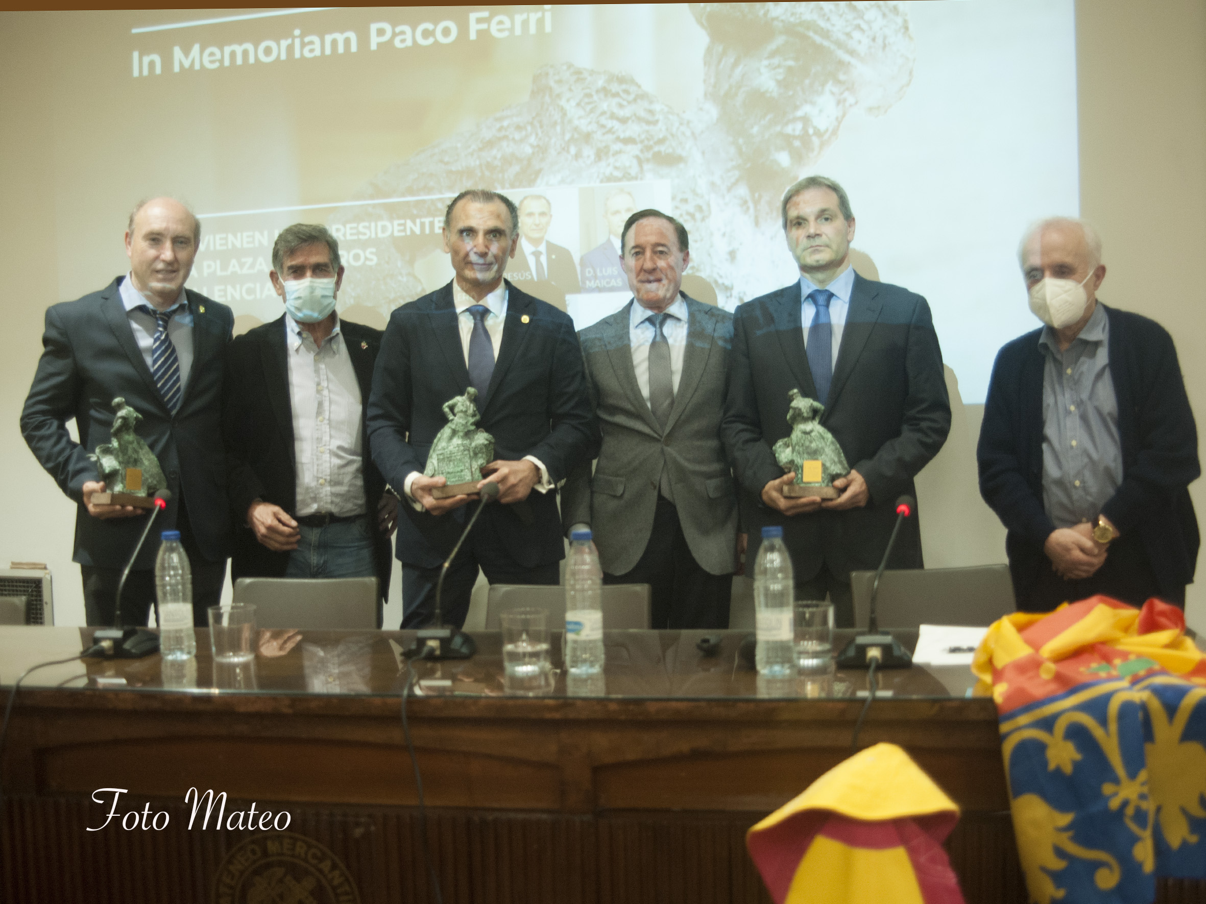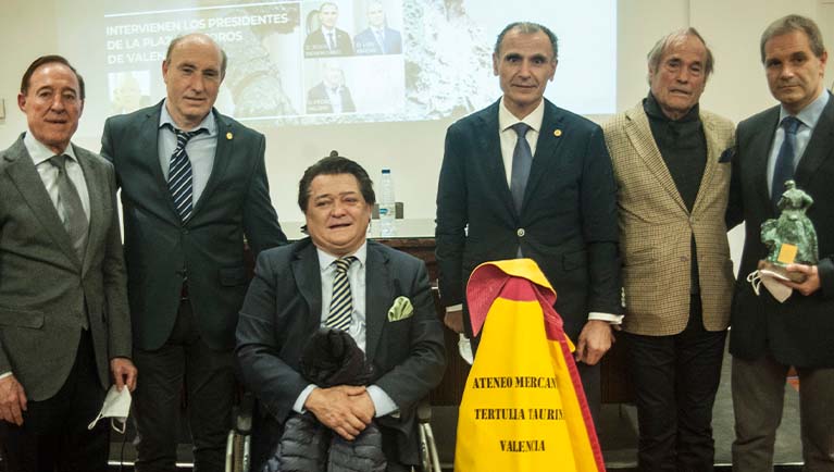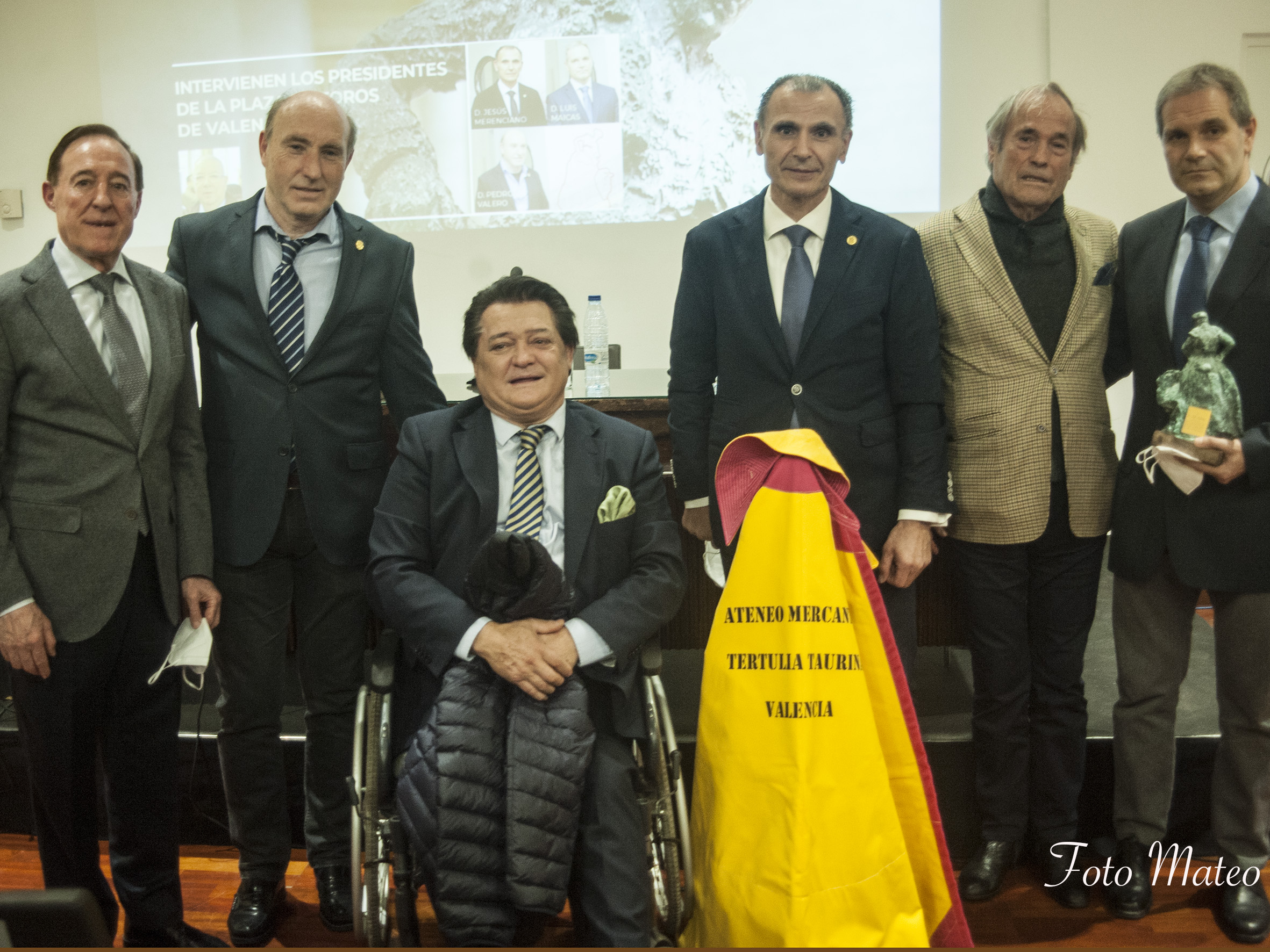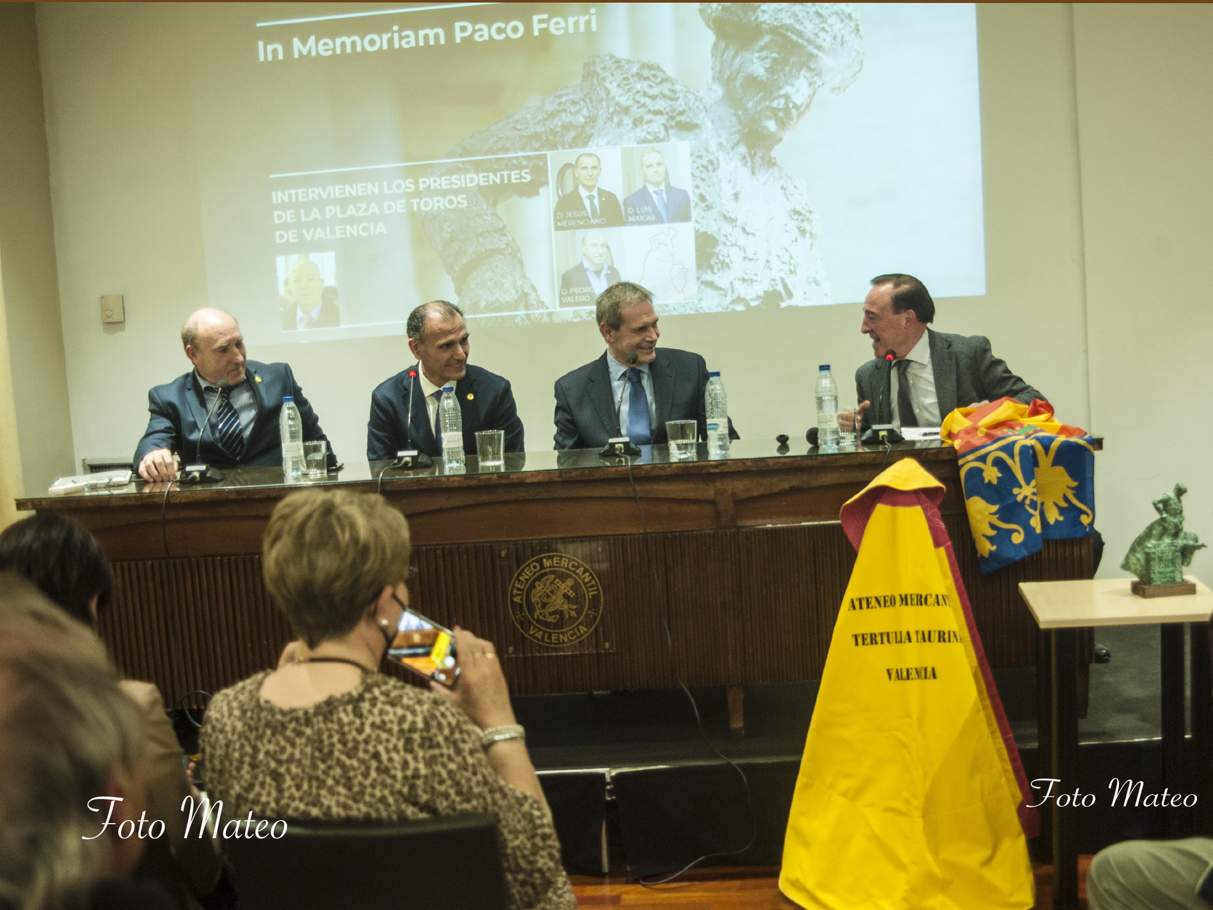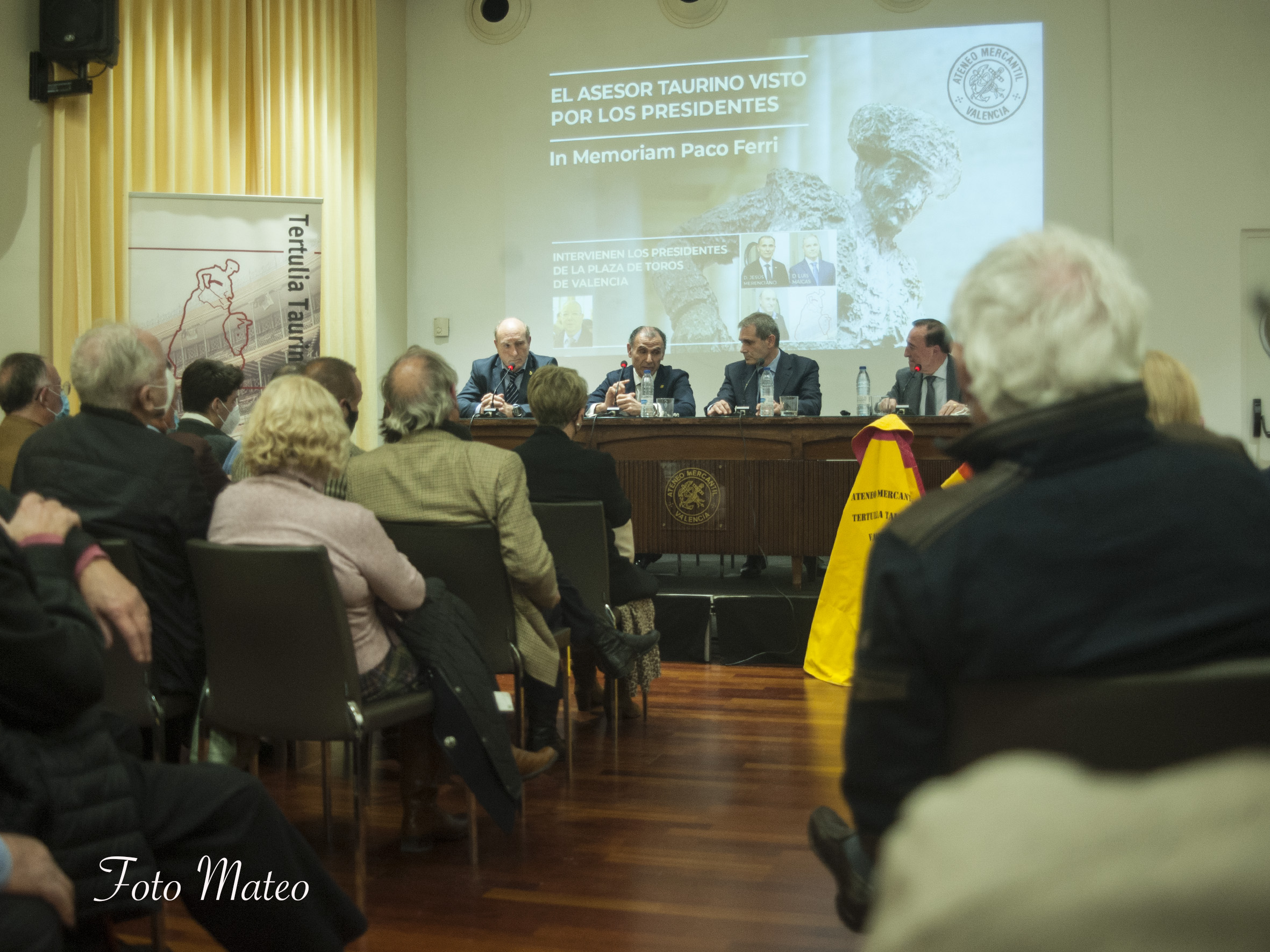 Después de un breve video en el que Paco Ferri, asesor taurino, tertuliano y amigo, fallecido el 7 de febrero, explica cómo la afición a los toros fue decisiva para superar los graves problemas de su vida, ocuparon la mesa presidencial Jesús Merenciano, Luis Maicas y Pedro Valero, presidentes de la Plaza de Toros de Valencia, y Paco Roger, portavoz y coordinador de la Tertulia Taurina del Ateneo Mercantil de Valencia.