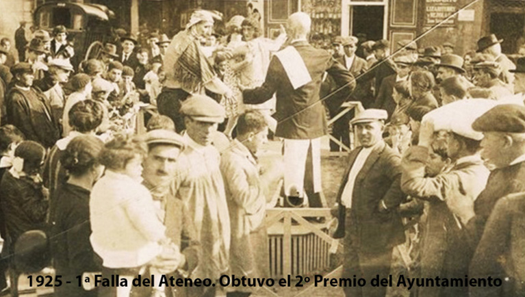 En los Años 20, tras la Primera Guerra Mundial, se produce un crecimiento económico y hay un incremento de la población del 35% en la capital del Turia y con él, también hay una expansión de las Fallas. La relación entre el consistorio y el Ateneo siempre ha sido constante e iba en aumento cada año, hasta que en 1925 nuestra entidad se vio con fuerzas de participar directamente de la fiesta y presenta en sociedad el primer monumento ateneísta, por cierto, una falla que fue galardonada con el segundo premio.