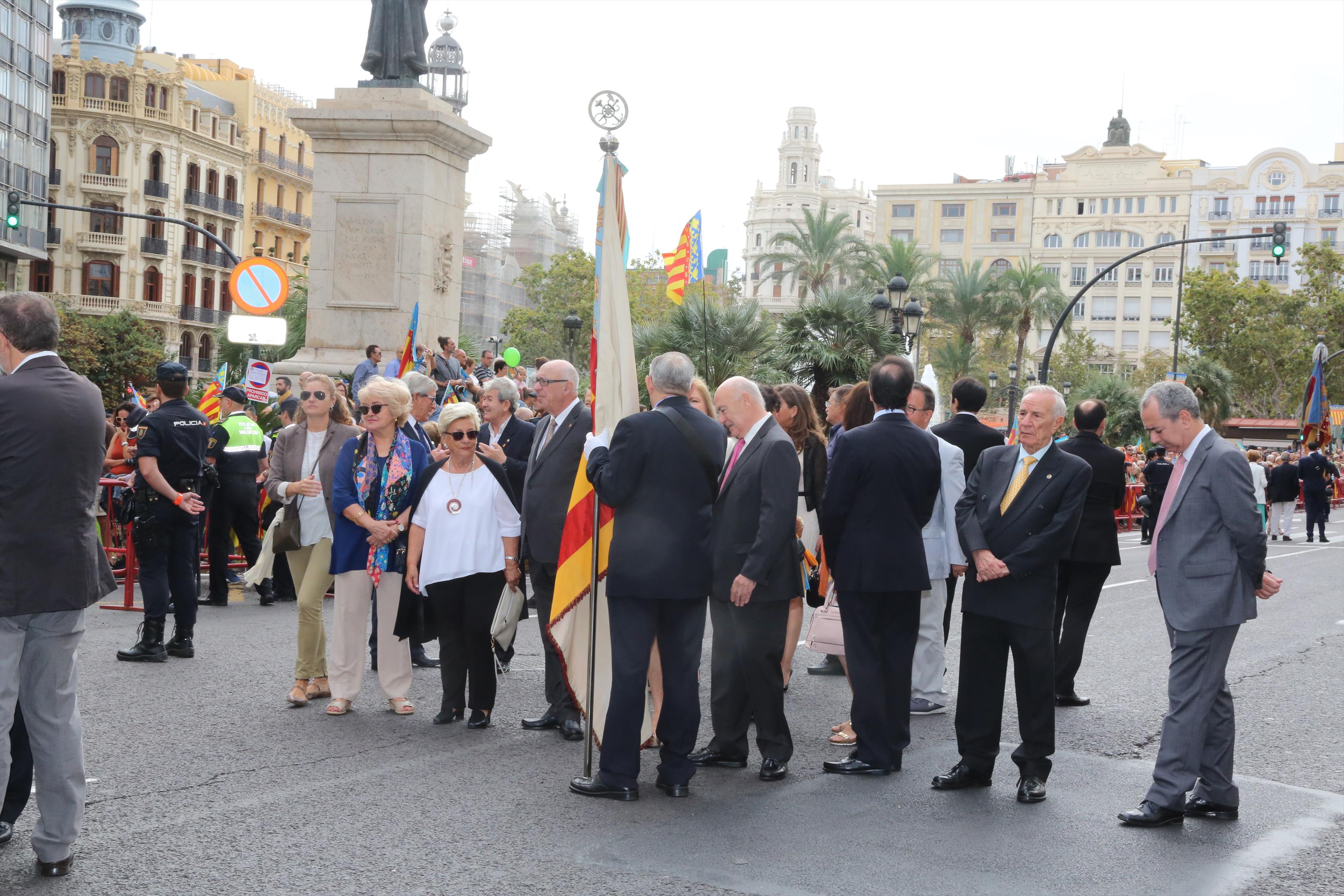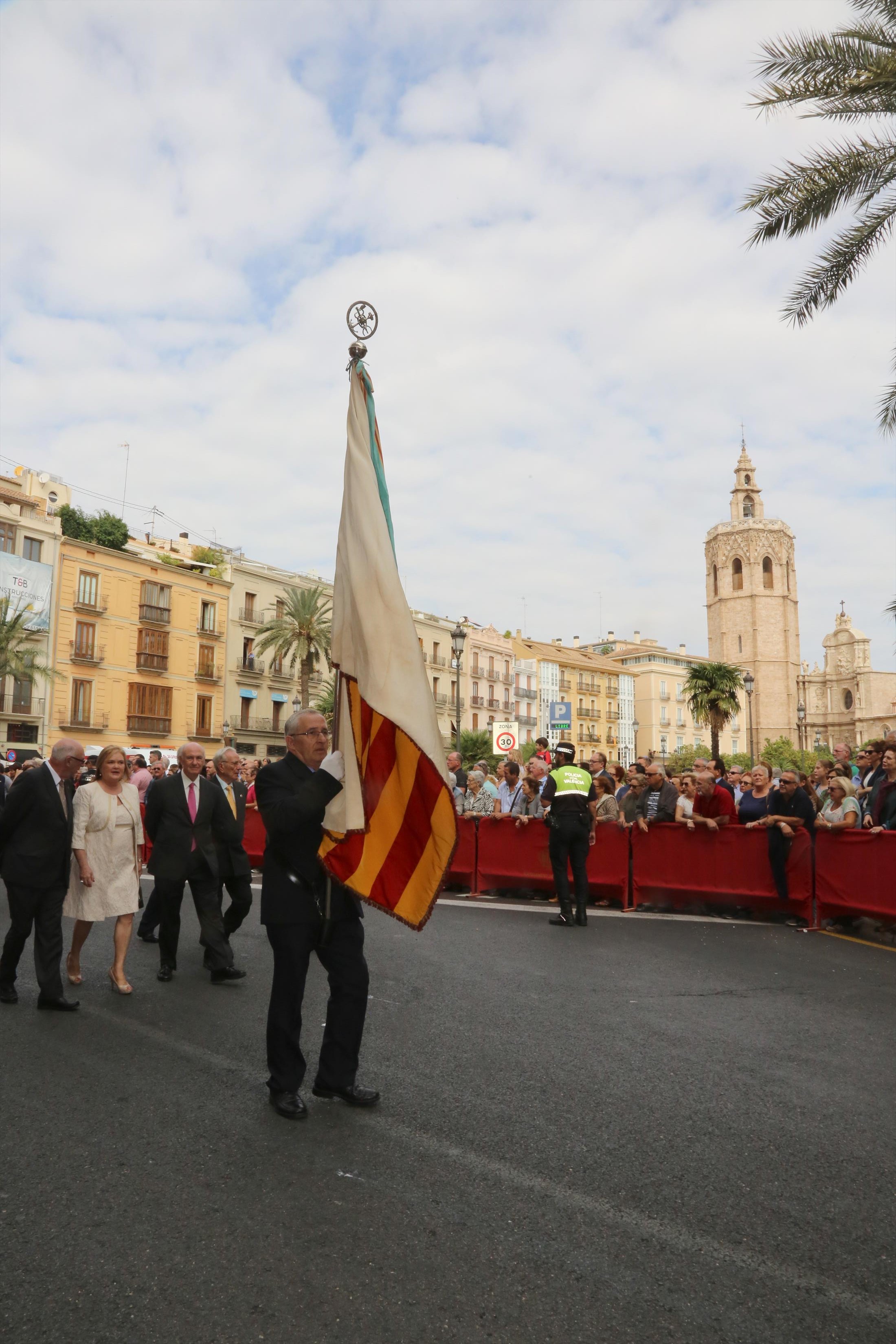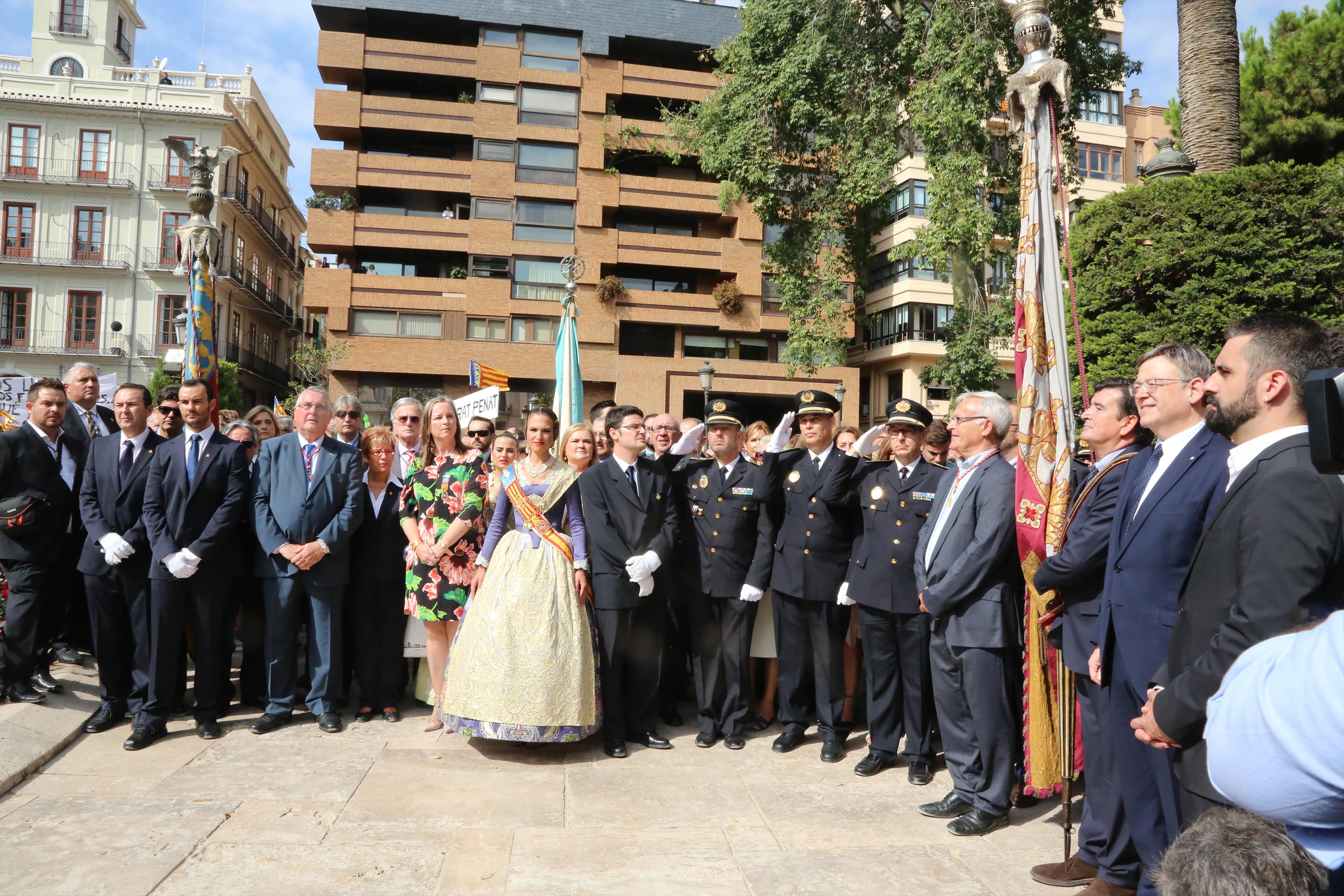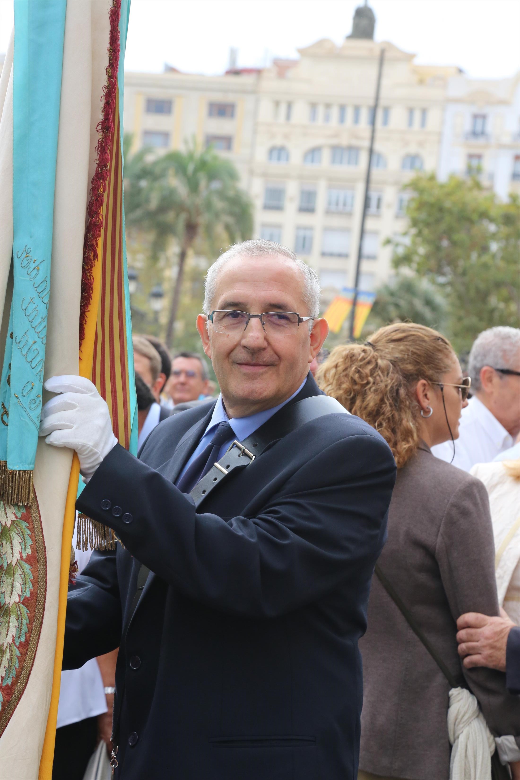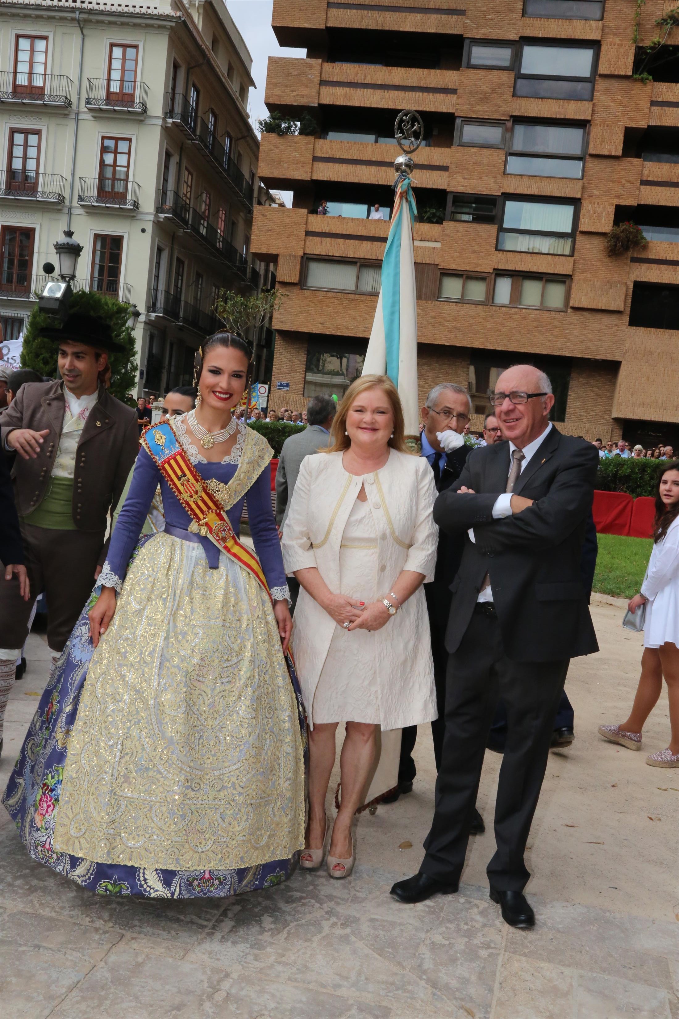 El abanderado de este año fue el portavoz de Ciudadanos, Fernando Giner, que agarró el mastil de la Real Senyera que salió del Archivo Histórico Municipal. No faltó a la cita la fallera mayor de Valencia, Alicia Moreno, y su corte de honor. Se emocionó en la víspera del final de su reinado, dado que un día después, el 10 de octubre se conoció el nombre de su sucesora.