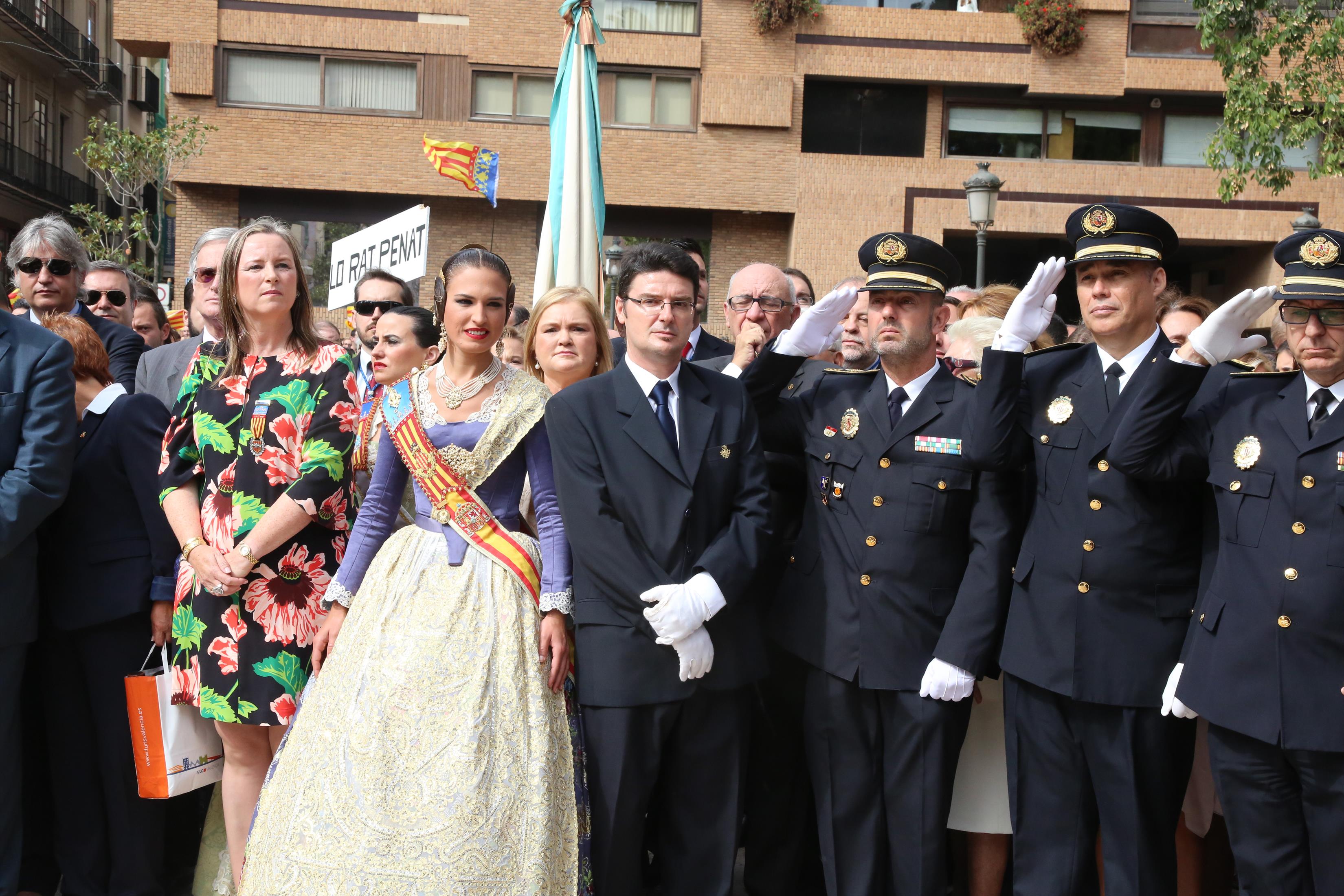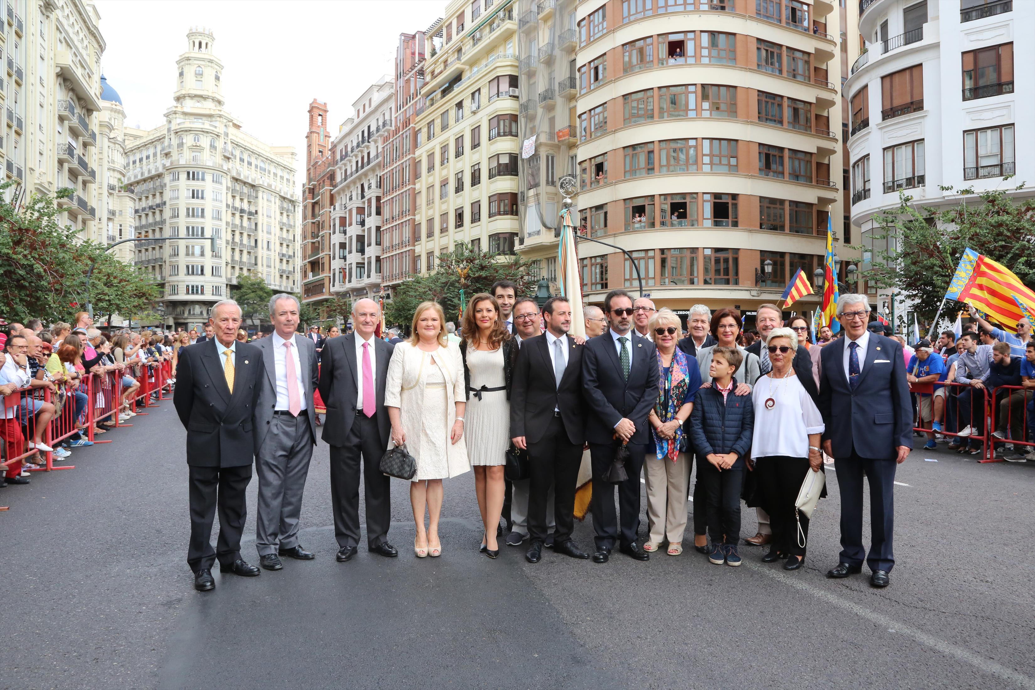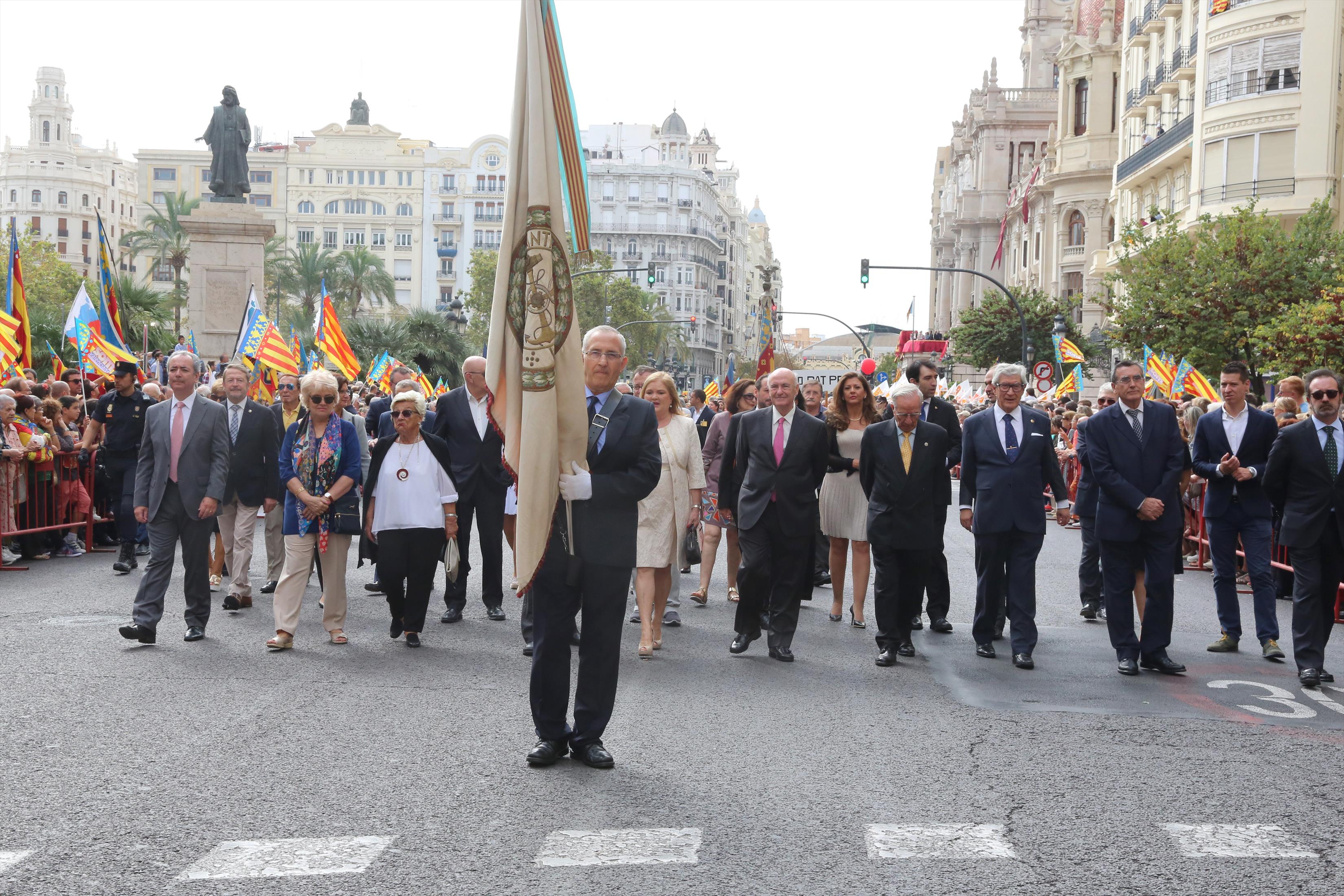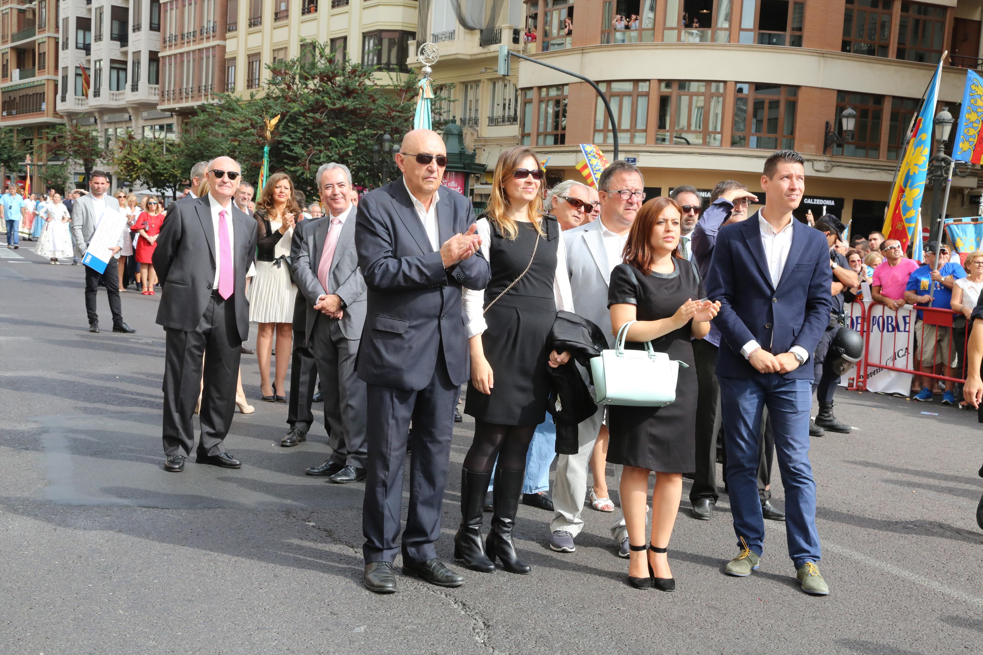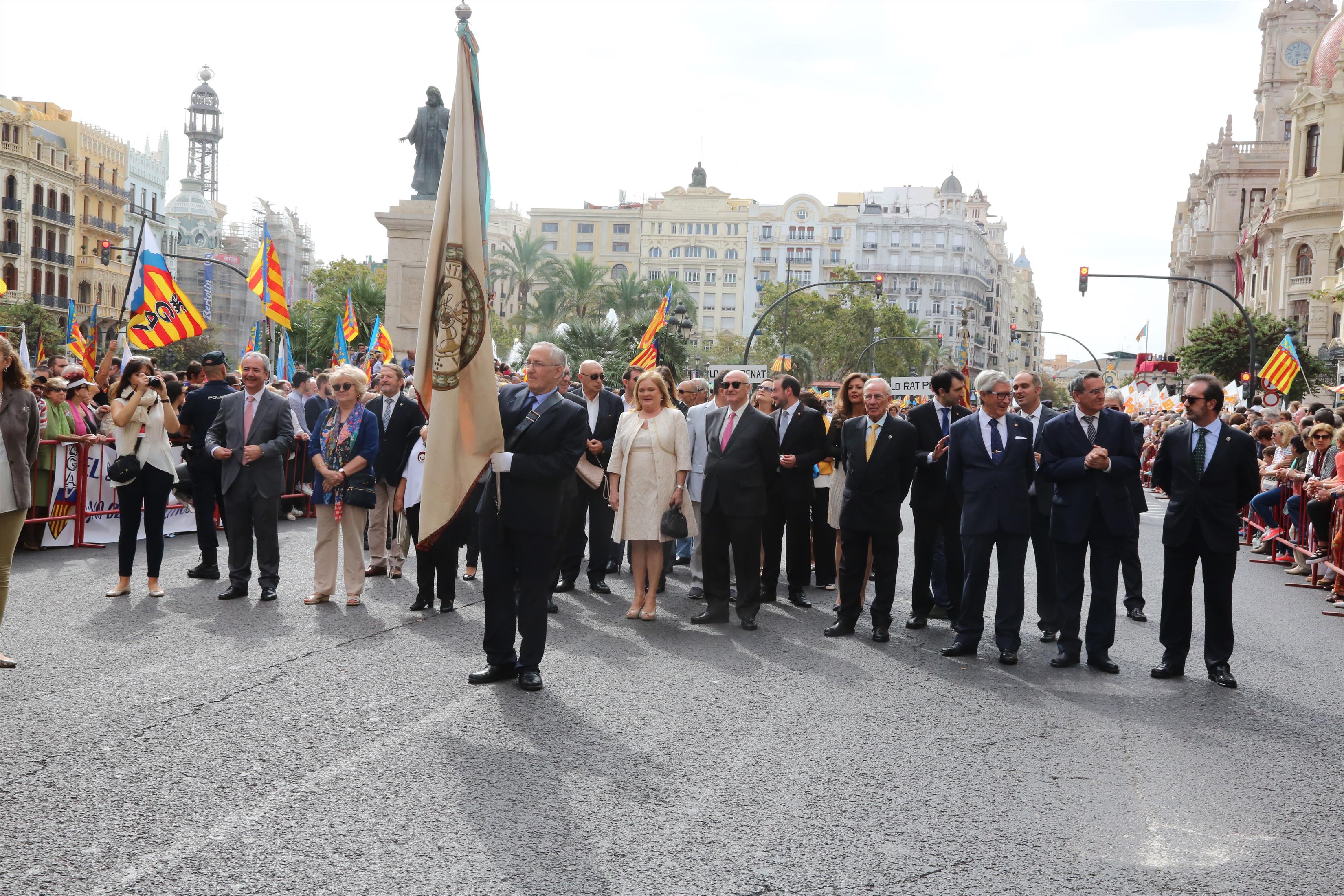 El abanderado de este año fue el portavoz de Ciudadanos, Fernando Giner, que agarró el mastil de la Real Senyera que salió del Archivo Histórico Municipal. No faltó a la cita la fallera mayor de Valencia, Alicia Moreno, y su corte de honor. Se emocionó en la víspera del final de su reinado, dado que un día después, el 10 de octubre se conoció el nombre de su sucesora.