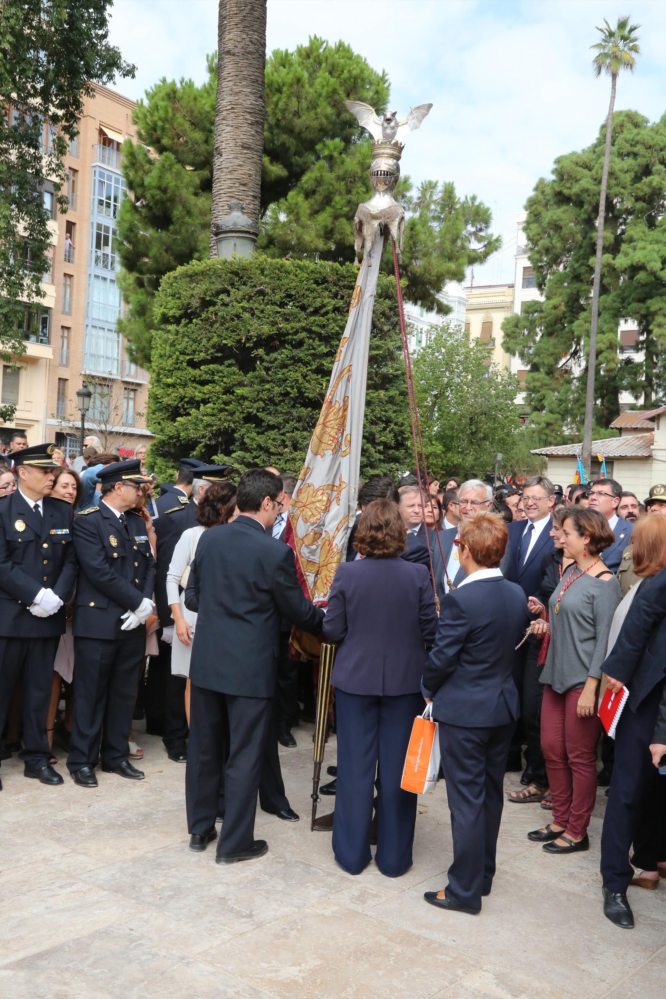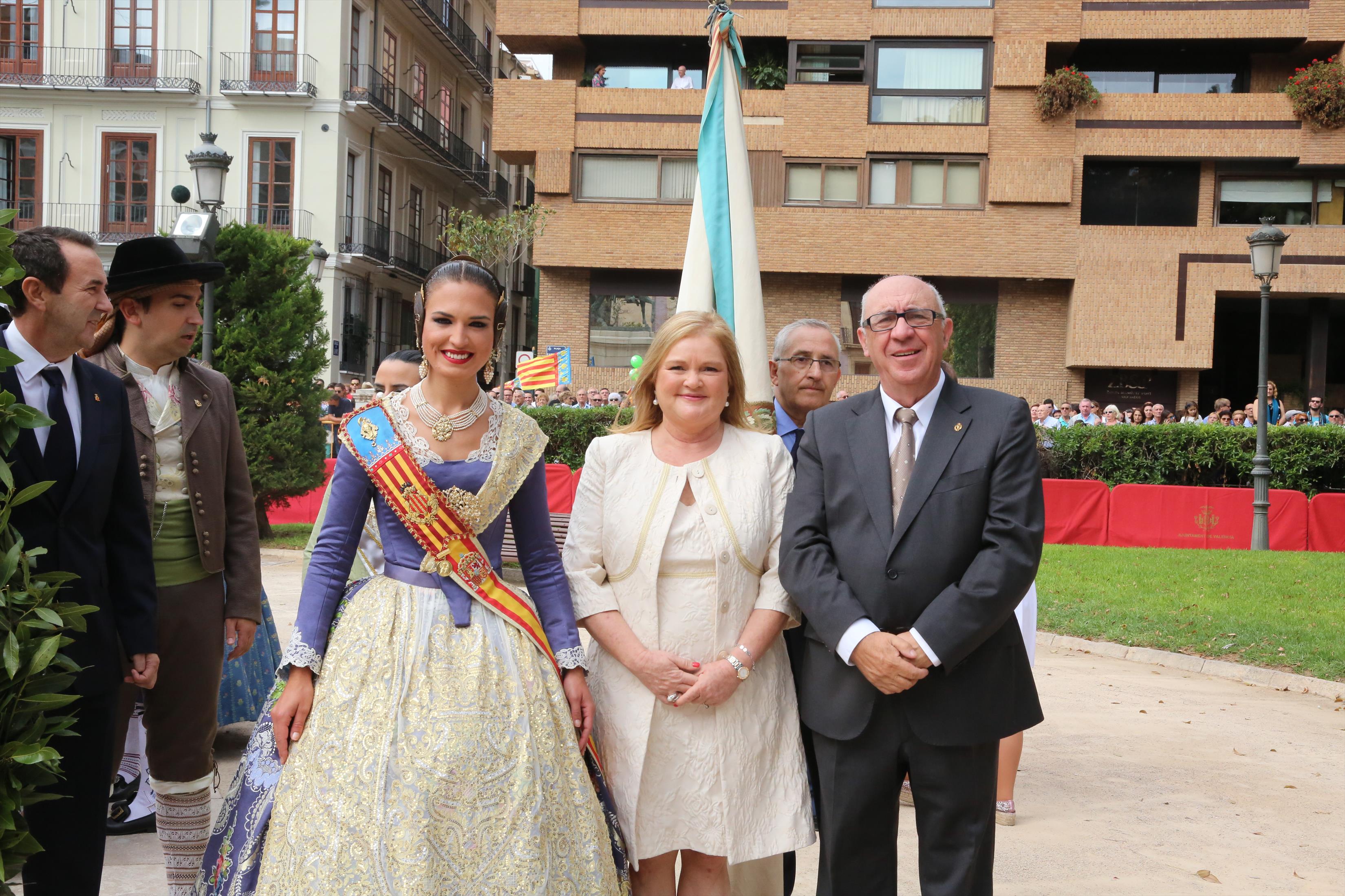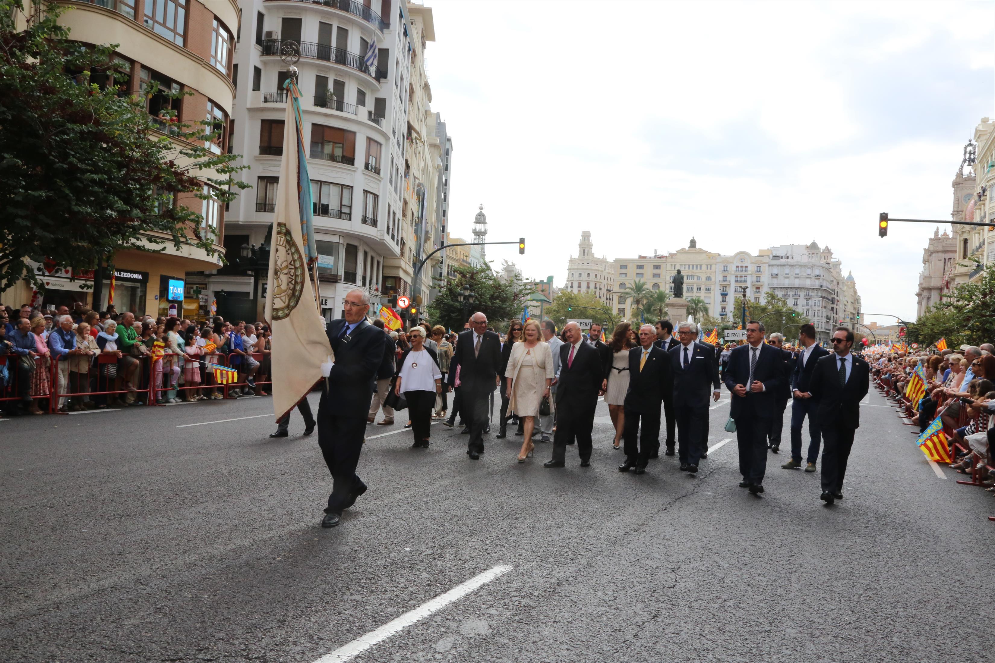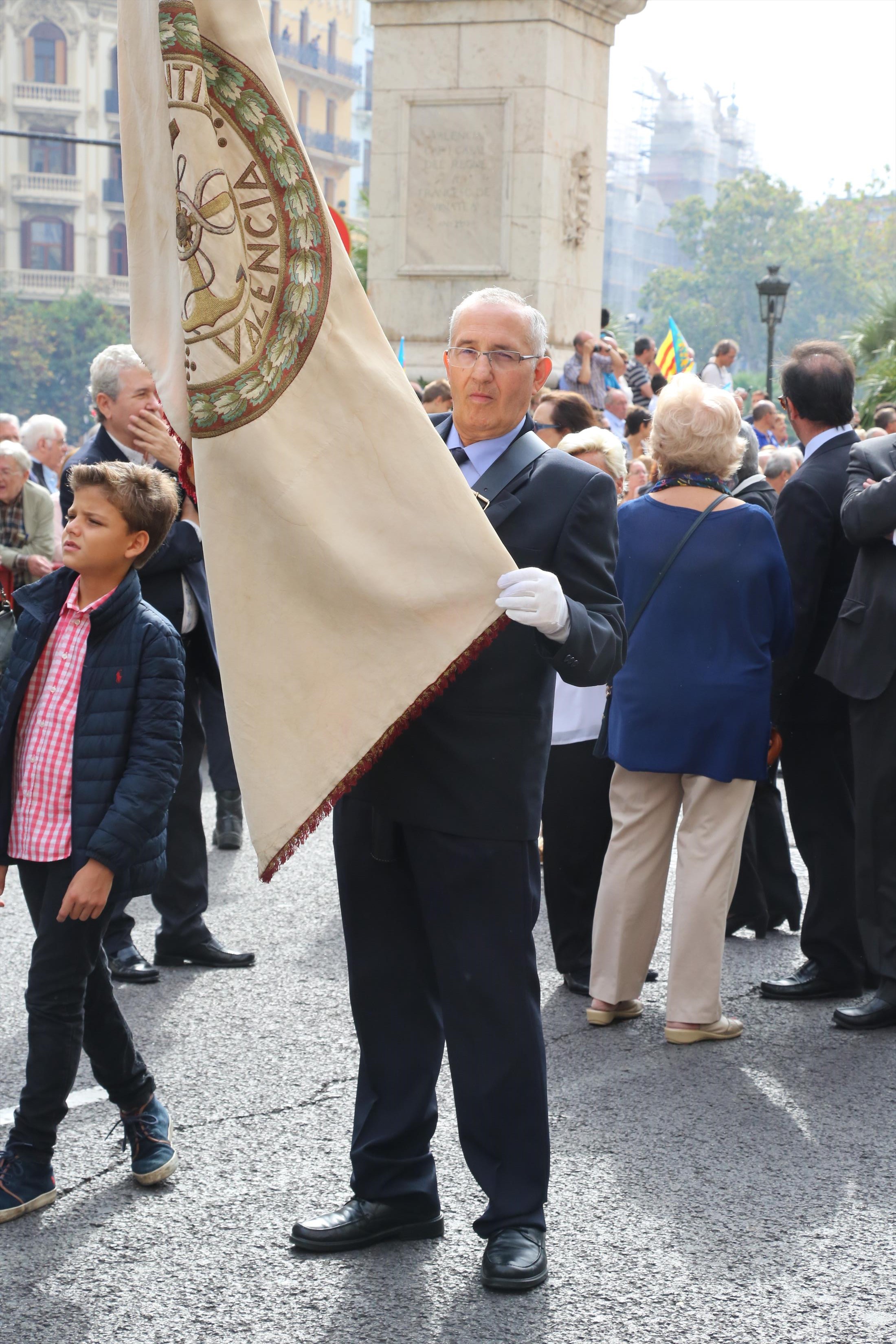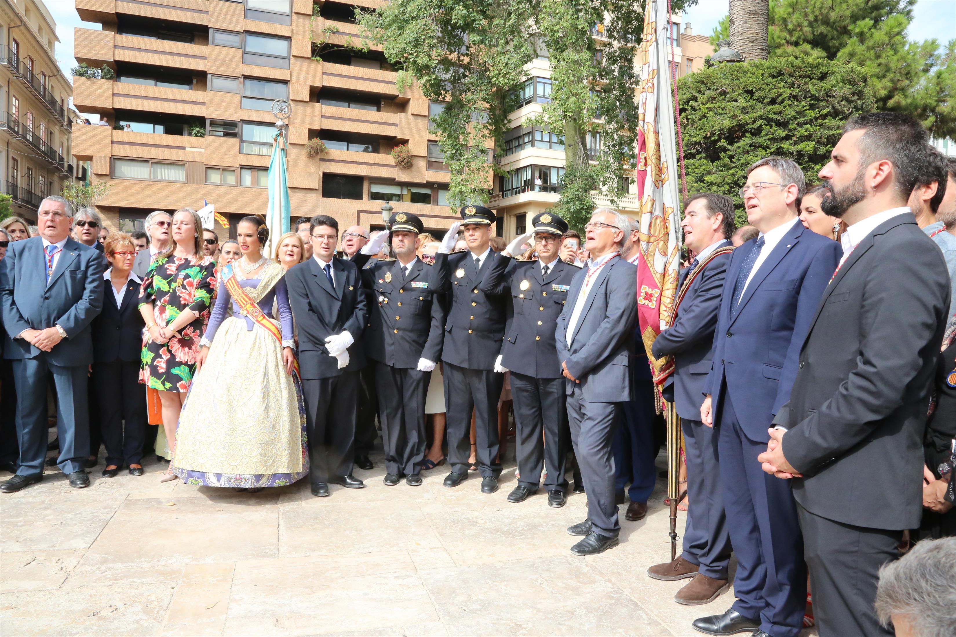 El abanderado de este año fue el portavoz de Ciudadanos, Fernando Giner, que agarró el mastil de la Real Senyera que salió del Archivo Histórico Municipal. No faltó a la cita la fallera mayor de Valencia, Alicia Moreno, y su corte de honor. Se emocionó en la víspera del final de su reinado, dado que un día después, el 10 de octubre se conoció el nombre de su sucesora.