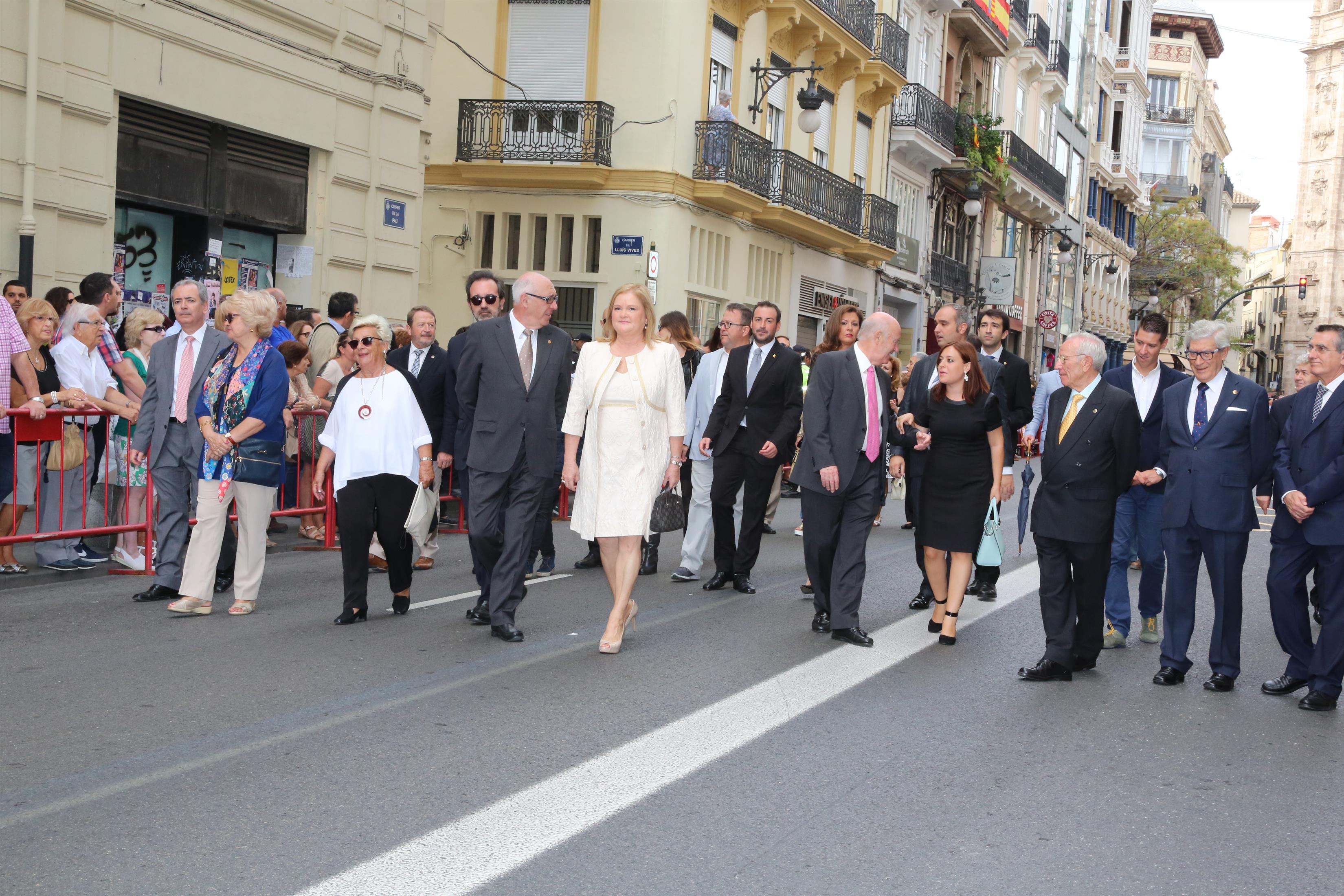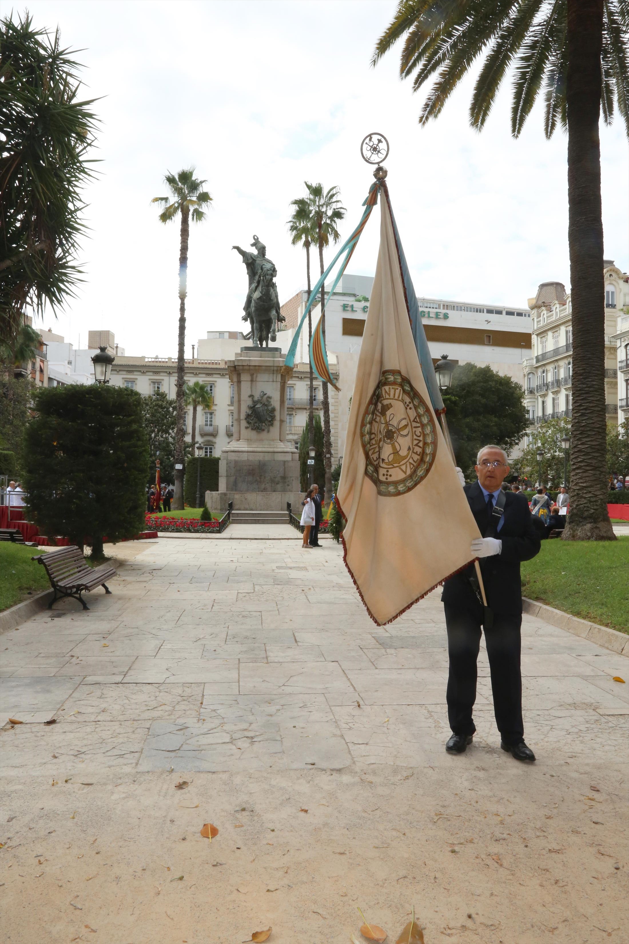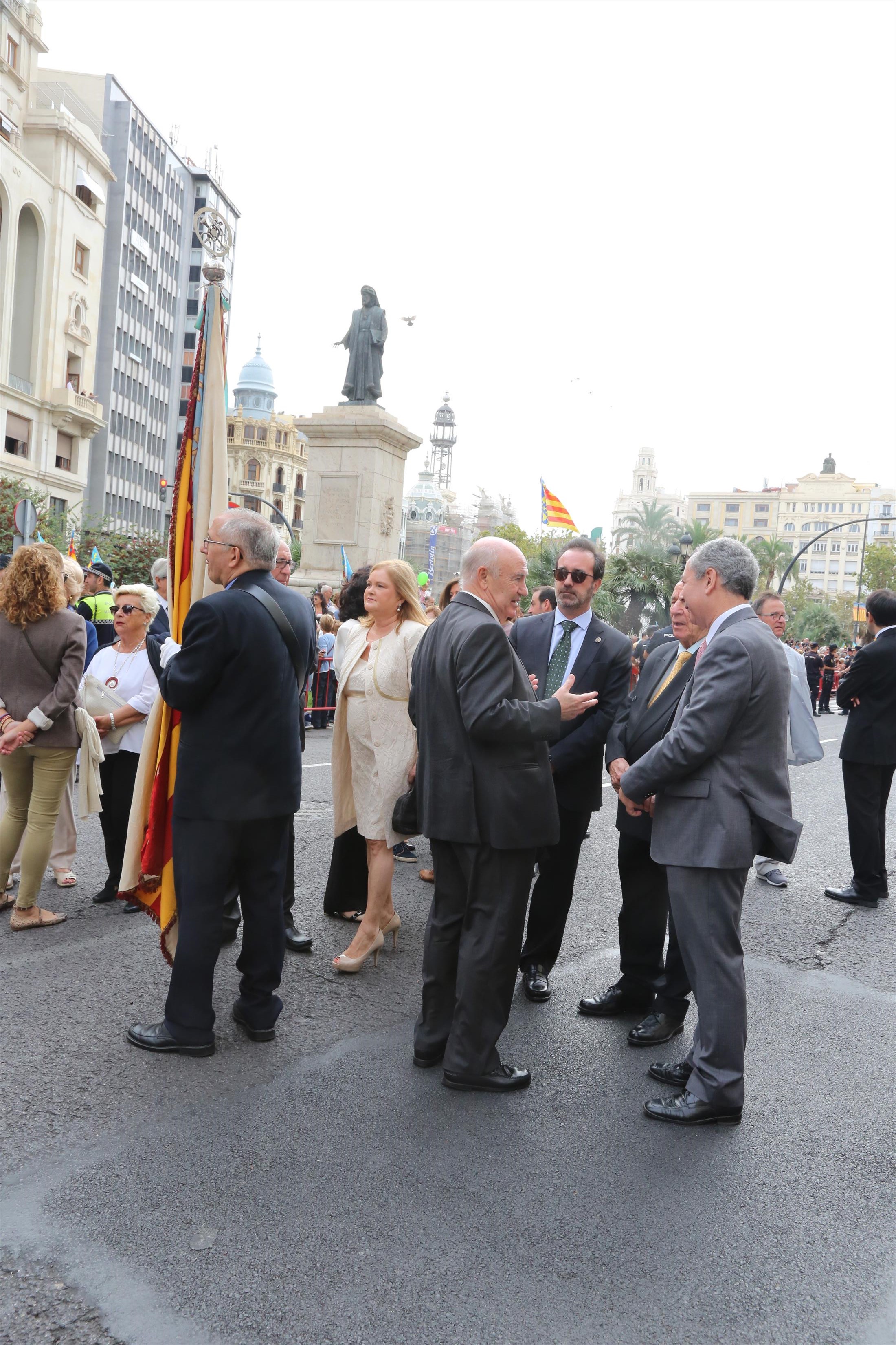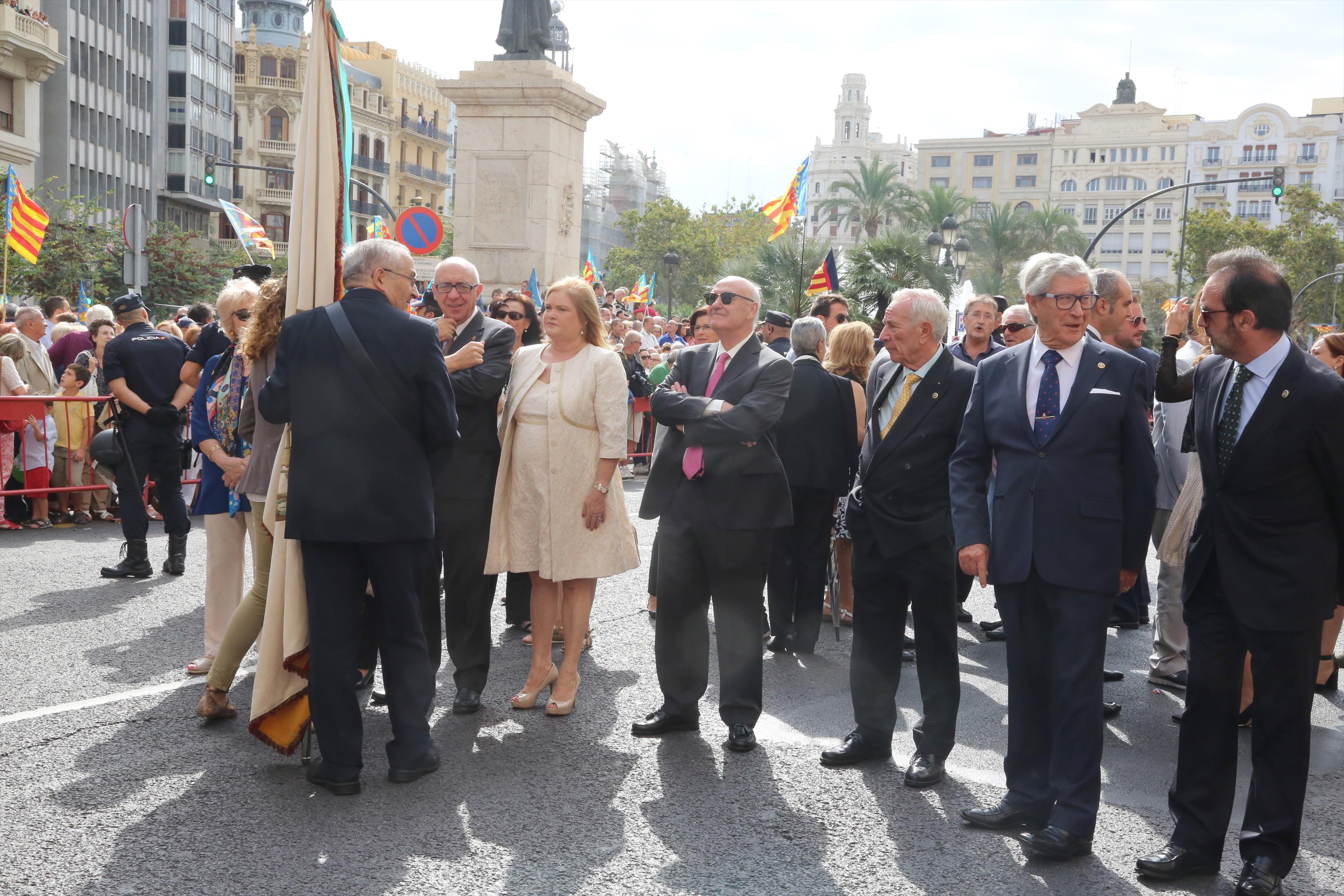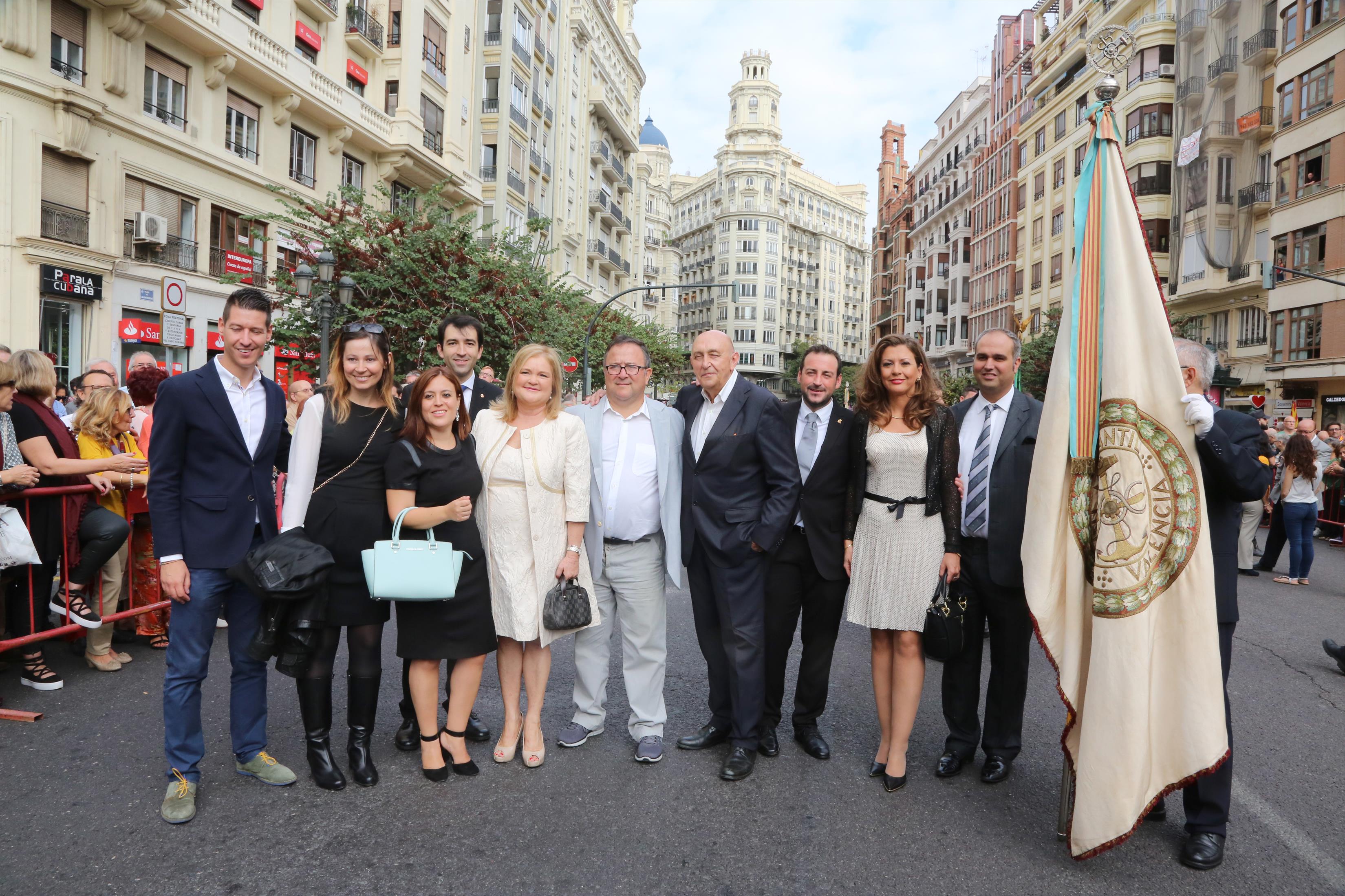 El abanderado de este año fue el portavoz de Ciudadanos, Fernando Giner, que agarró el mastil de la Real Senyera que salió del Archivo Histórico Municipal. No faltó a la cita la fallera mayor de Valencia, Alicia Moreno, y su corte de honor. Se emocionó en la víspera del final de su reinado, dado que un día después, el 10 de octubre se conoció el nombre de su sucesora.