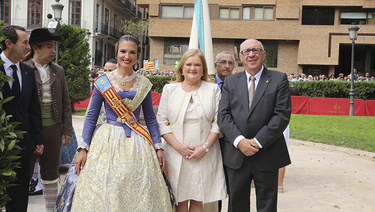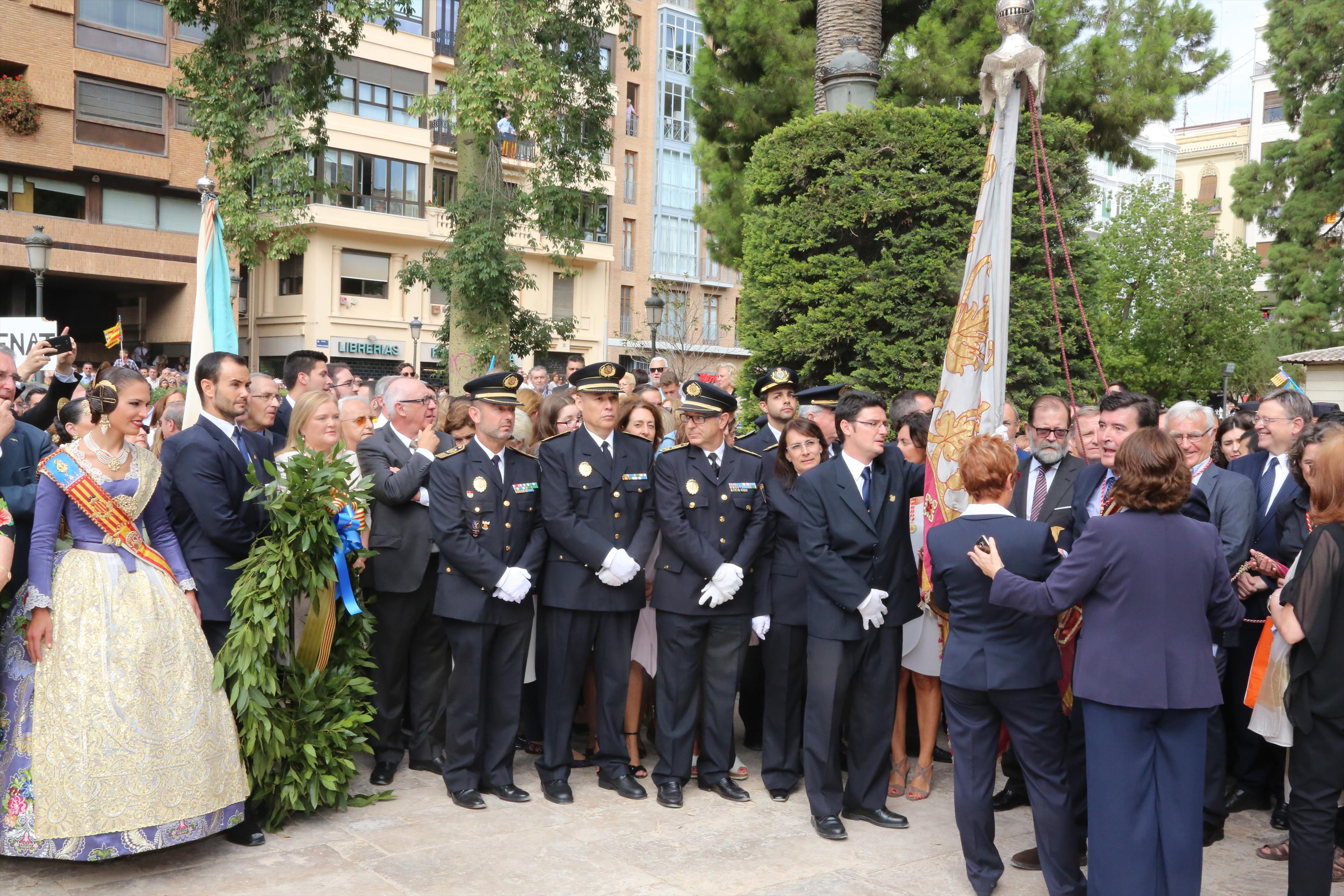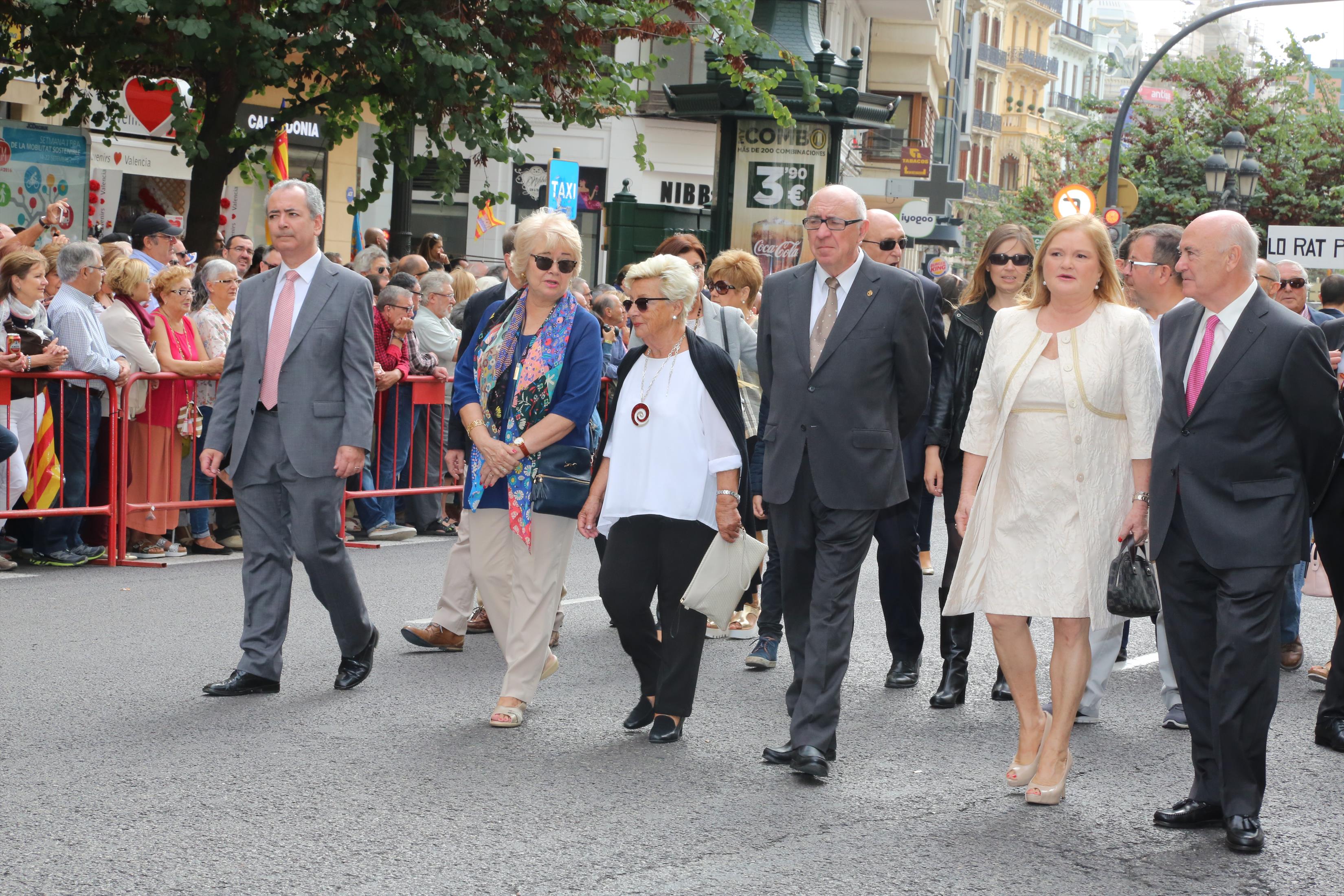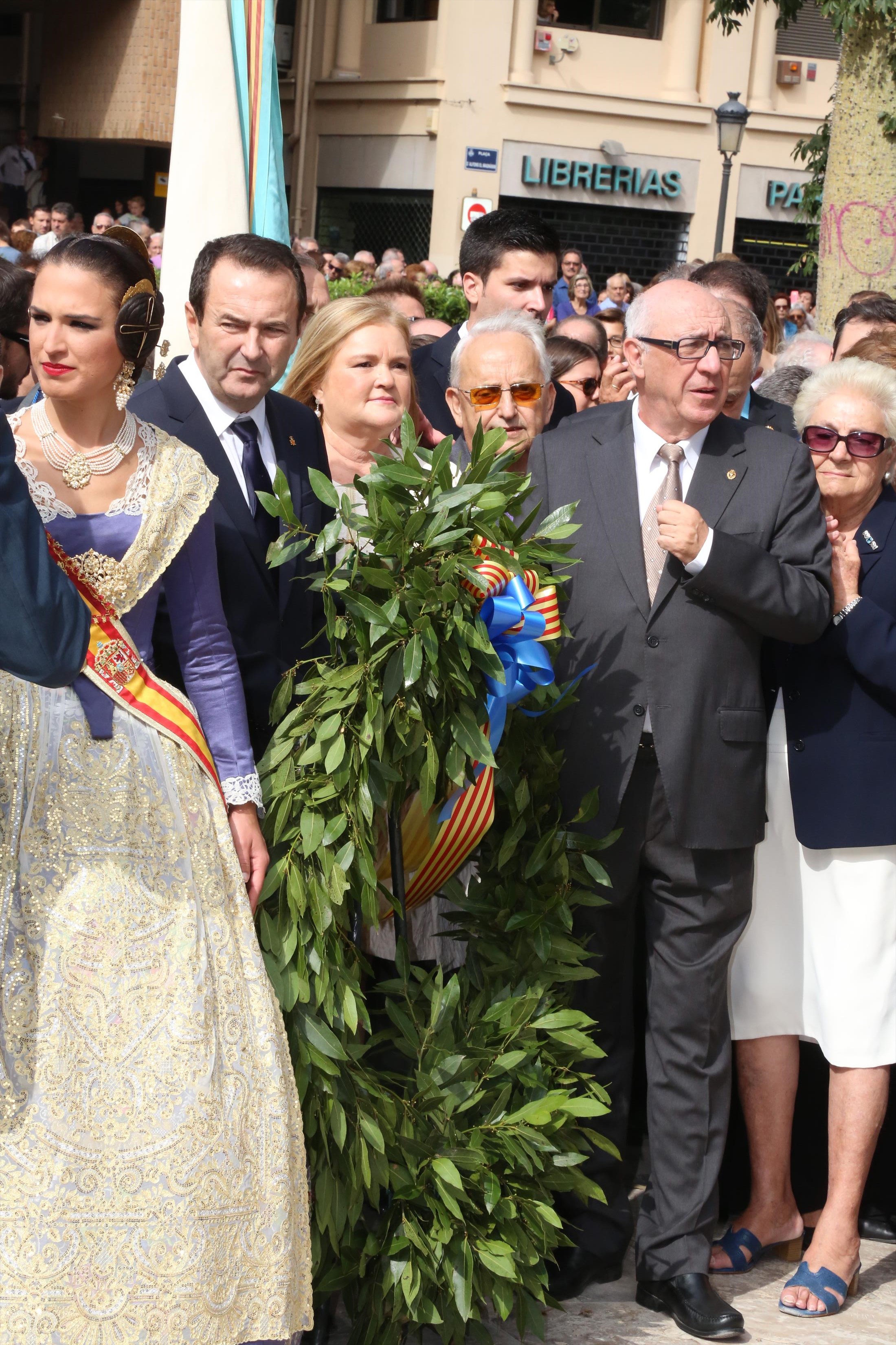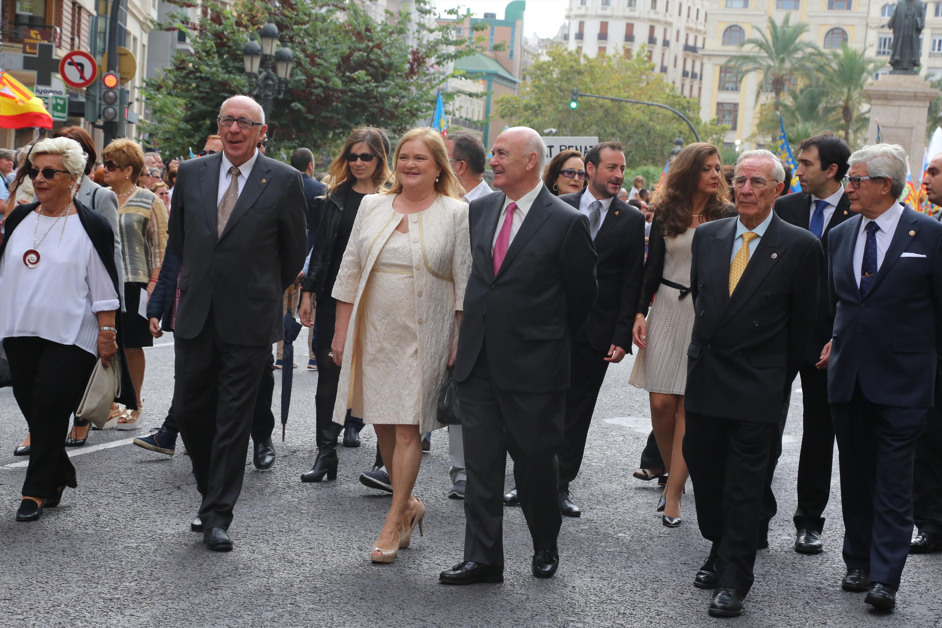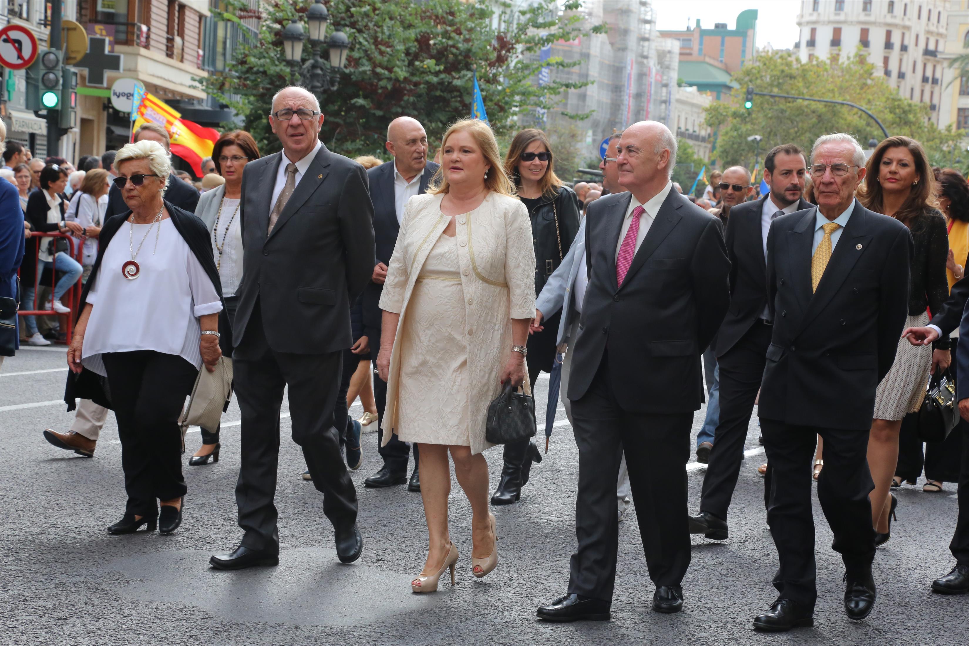 El abanderado de este año fue el portavoz de Ciudadanos, Fernando Giner, que agarró el mastil de la Real Senyera que salió del Archivo Histórico Municipal. No faltó a la cita la fallera mayor de Valencia, Alicia Moreno, y su corte de honor. Se emocionó en la víspera del final de su reinado, dado que un día después, el 10 de octubre se conoció el nombre de su sucesora.