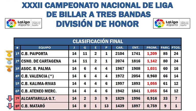 La medalla de Bronce ha sido para el A.B. Palma, equipo formado por Daniel Sánchez, Carlos Crespo, Jordi Garriga, Miguel Gelabert, Sebastian Bordoy, Bartolomé Morey, Jerome Barbeillon y Alfonso Bellido. El CB Valencia, último campeón se clasificó en cuarto lugar. Kalima Rivas  ha quedado en quinta posición seguido por nuestro club del Ateneo Mercantil, que lleva desde 2014 de manera consecutiva en la elite del billar en España. Los dos equipos que descienden de categoría fueron Alcantarilla y Mataró.
