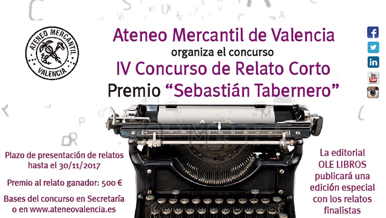 El Ateneo Mercantil de Valencia ha convocado el IV Concurso de Relato Corto 'Ateneo Mercantil de Valencia' que pasará a llamarse desde esta cuarta edición Concurso Relato Corto 'Ateneo Mercantil de Valencia' Premio 'Sebastián Tabernero 2018' en homenaje al escritor y directivo de esta casa que falleció hace unos meses. Una decisión que fue votada a favor por la Junta Directiva en la última reunión ordinaria que se ha llevado a cabo antes de las vacaciones de verano.