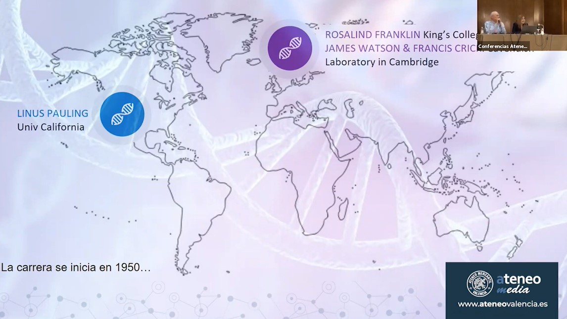 La Dra. Eloisa Jantus Lewintre, la jefa del laboratorio de Oncología Molecular de la Fundación del Hospital General Universitario de Valencia, trajo al Ateneo Mercantil una conferencia bajo el título "Qué es y qué representa para la actual medicina la famosa fotografía 51 del DNA (doble hélice)", coordinada por el Dr. Carlos Camps Herrero, Jefe de Servicio de Oncología Médica del Hospital General de Valencia y Coordinador de la Escuela de Salud del Ateneo Mercantil.