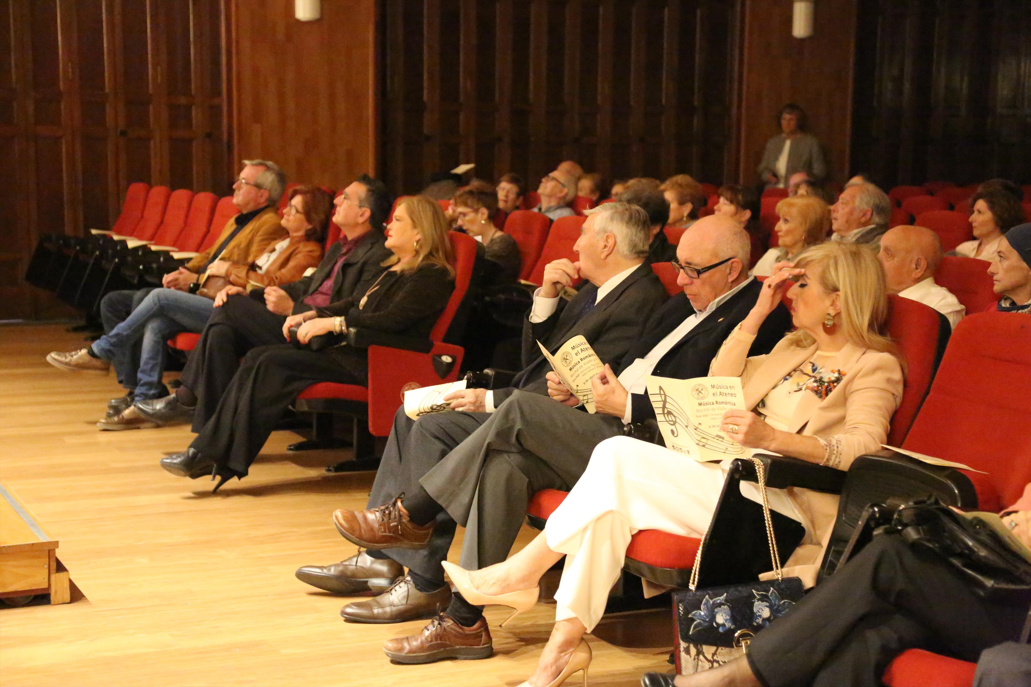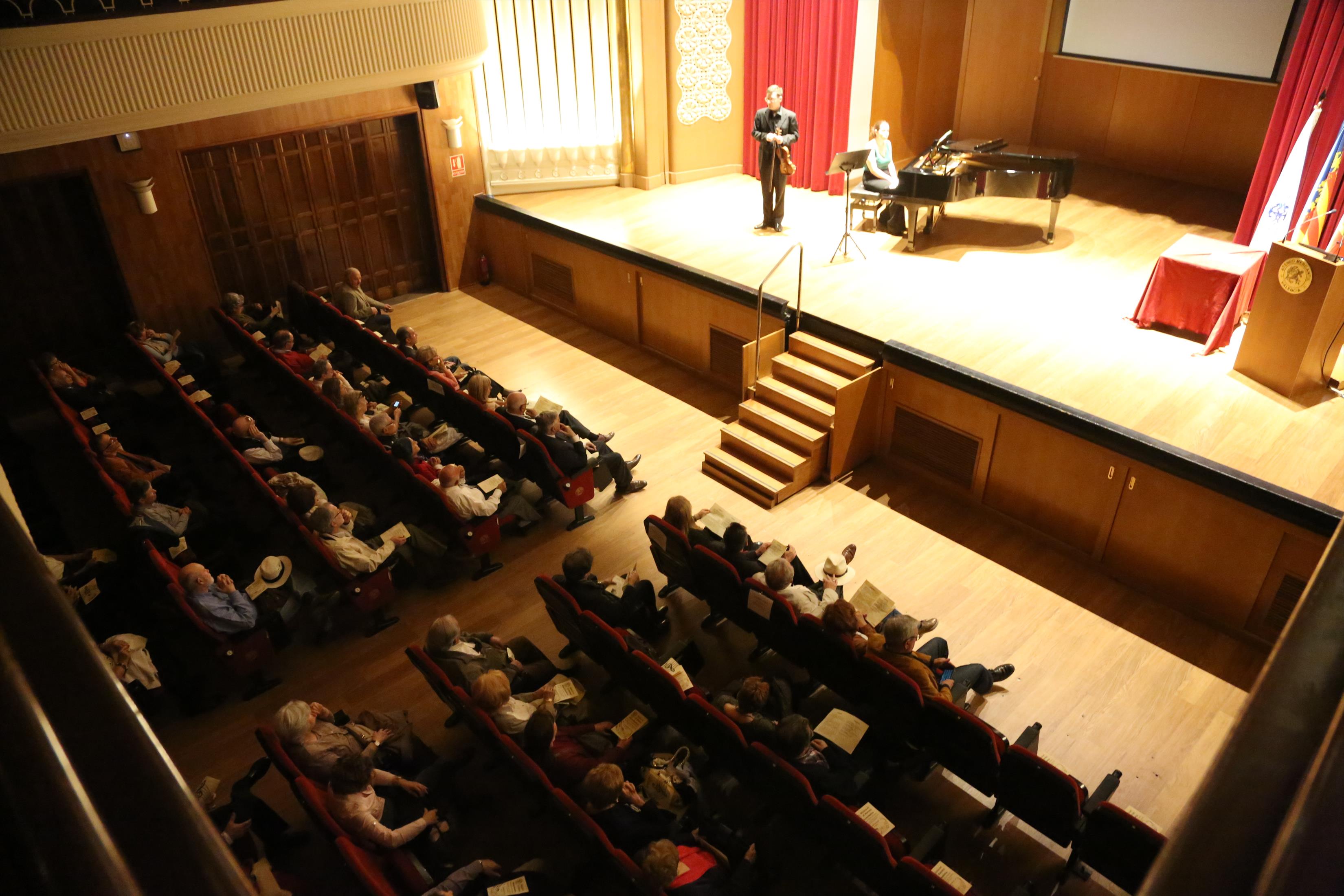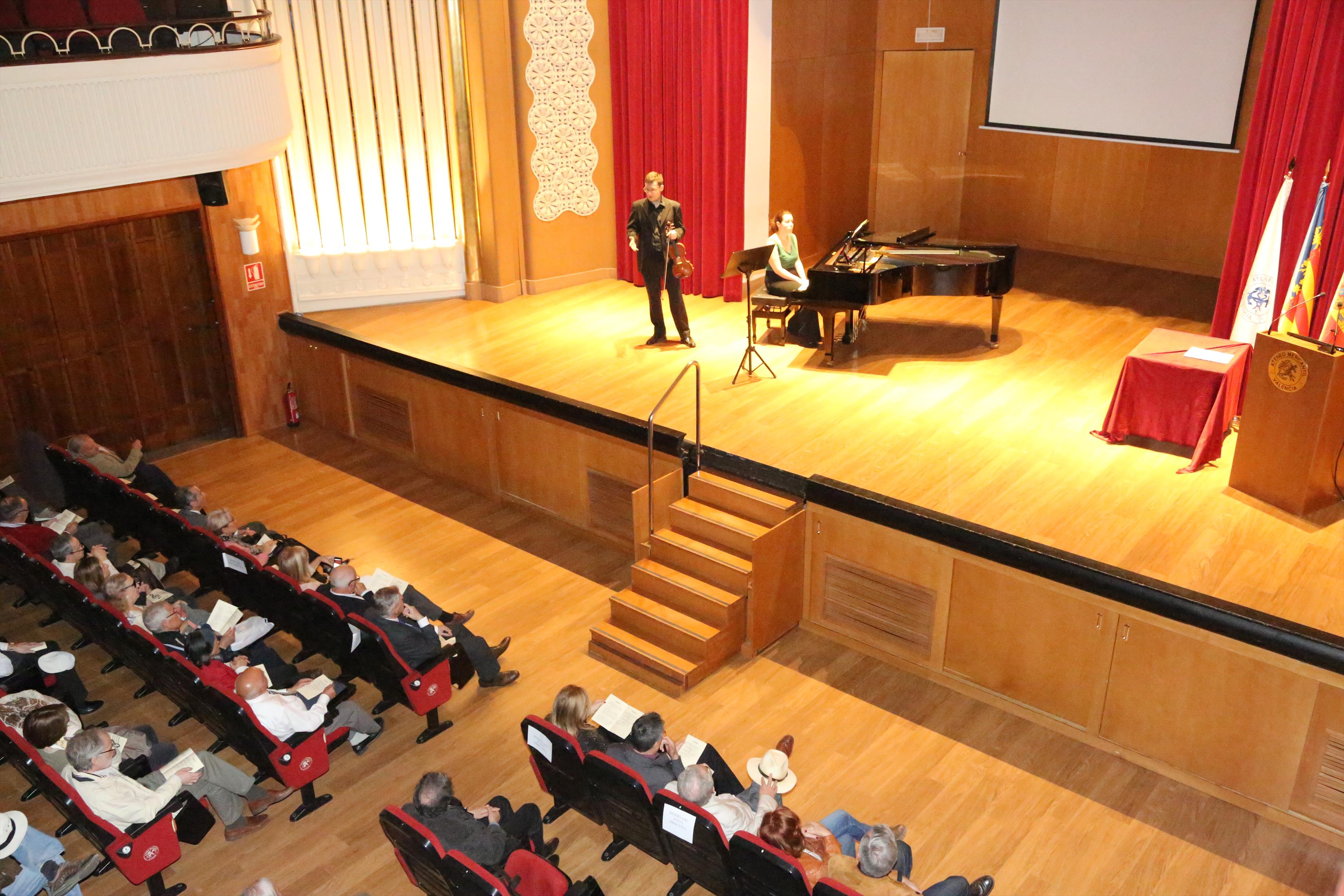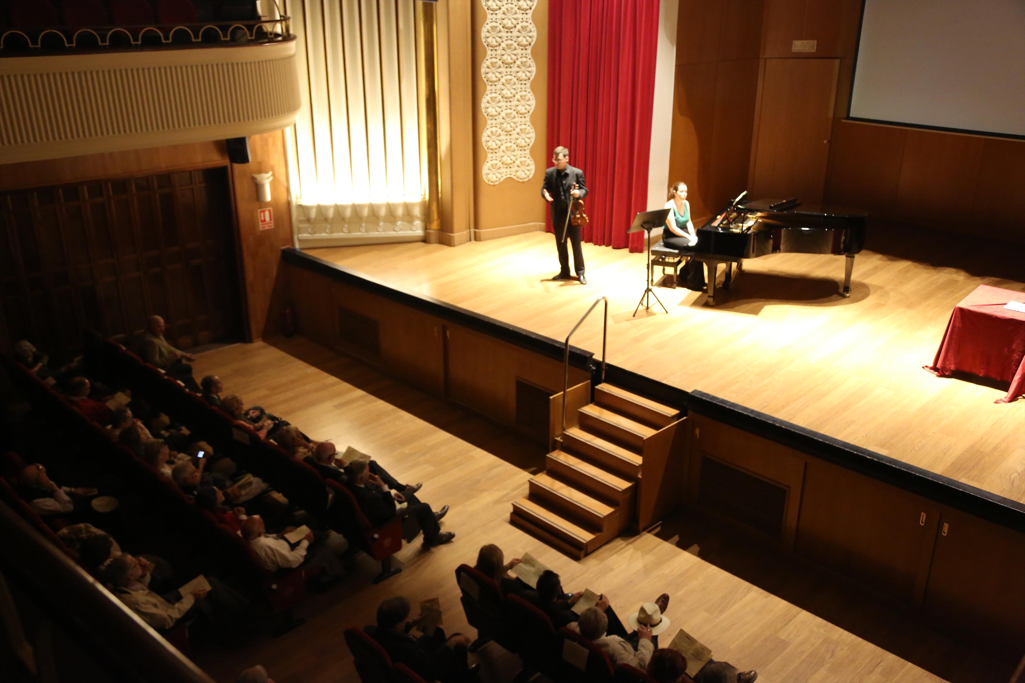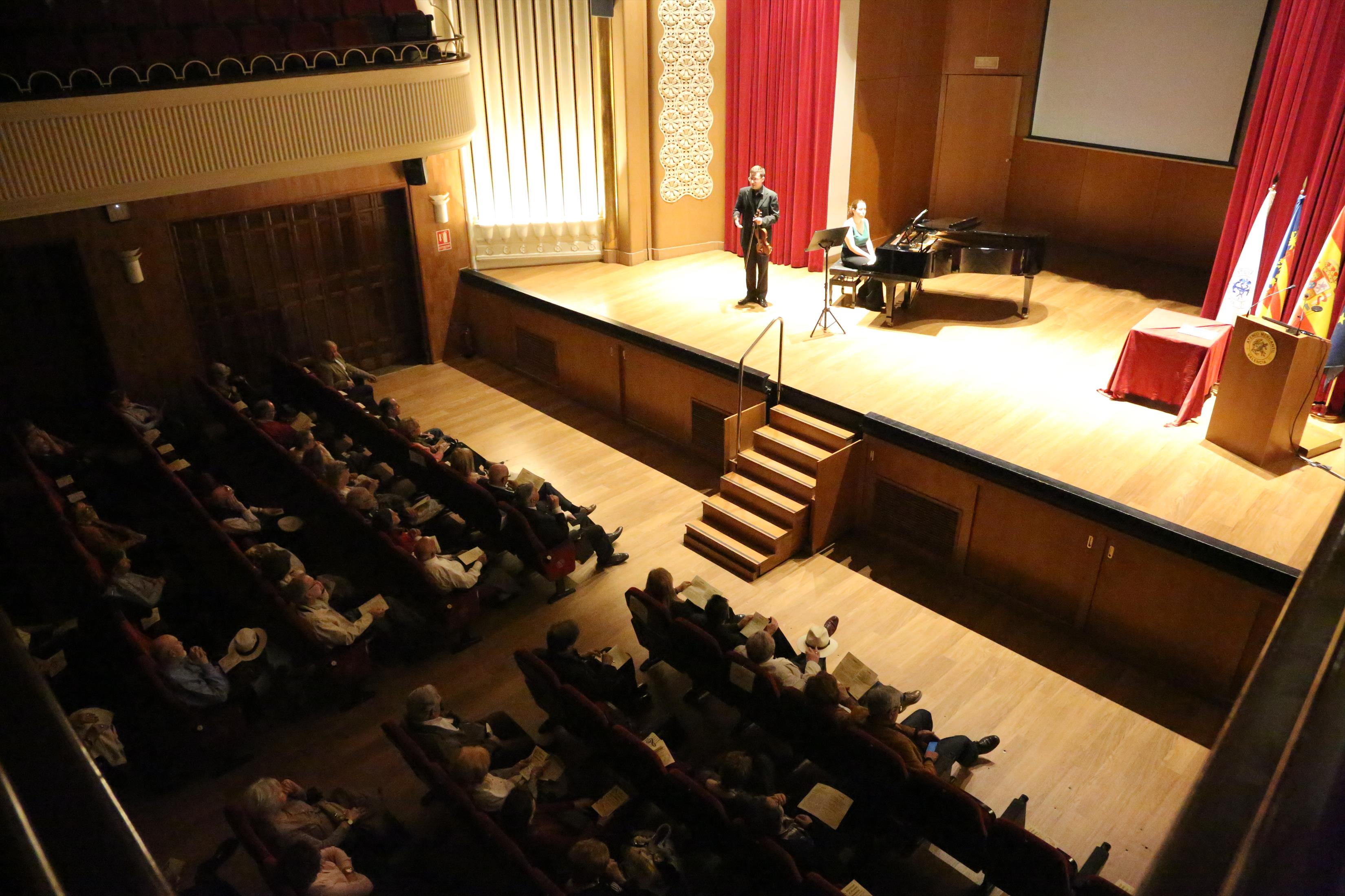 La primera actuación del Dúo Dalí trajo hasta el teatro de nuestra institución la música romántica. D. Fernando Pascual (violín) y Dña. Aída Velert (piano) hicieron las delicias del auditorio y ofrecieron un recital de música romántica en el que tocaron entre otras piezas: