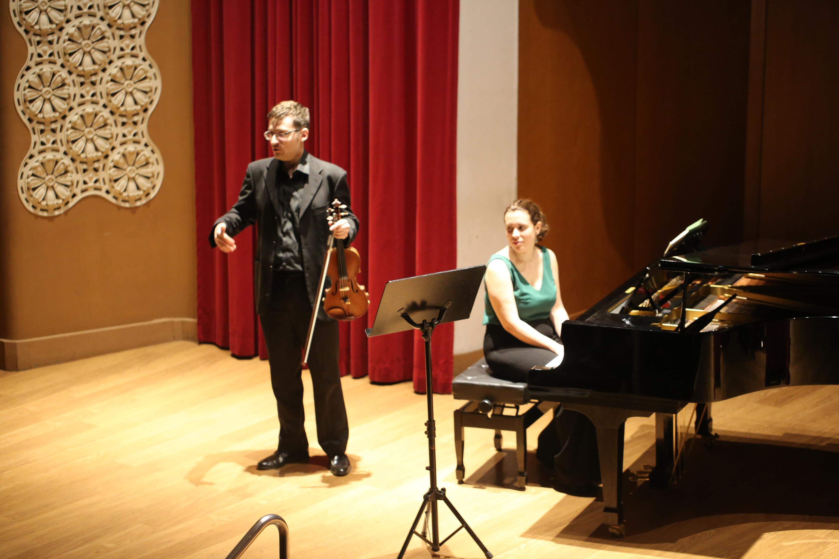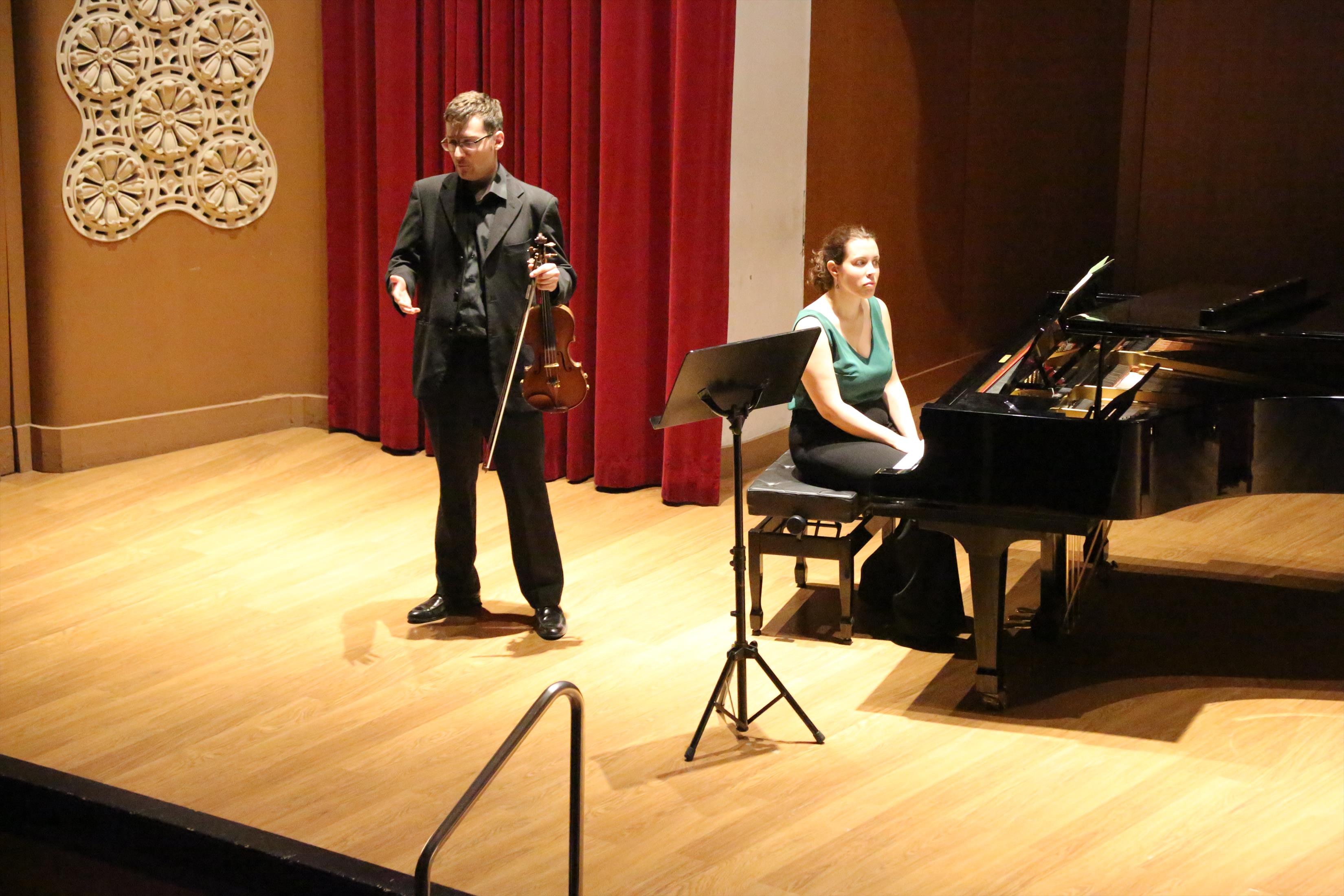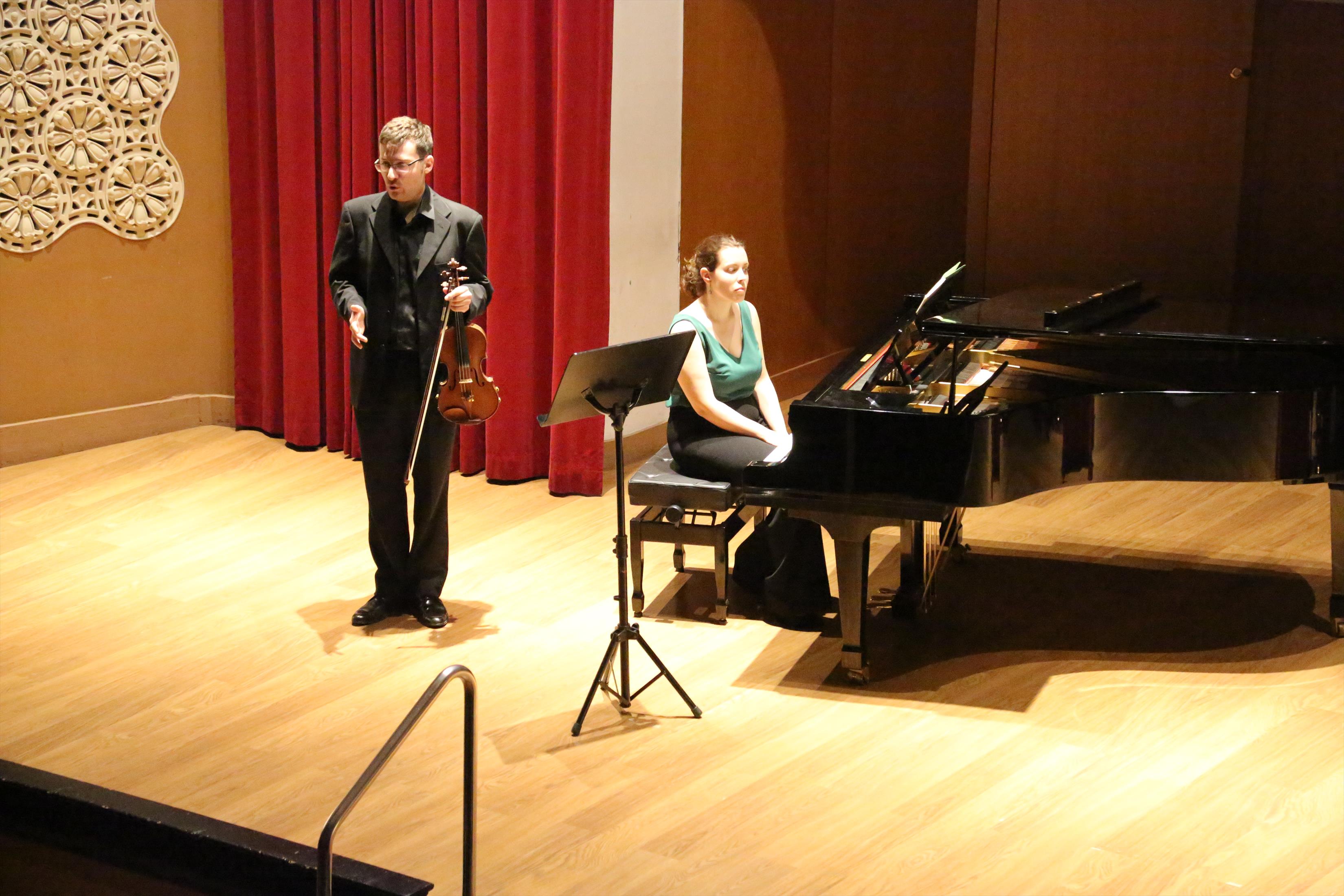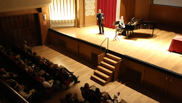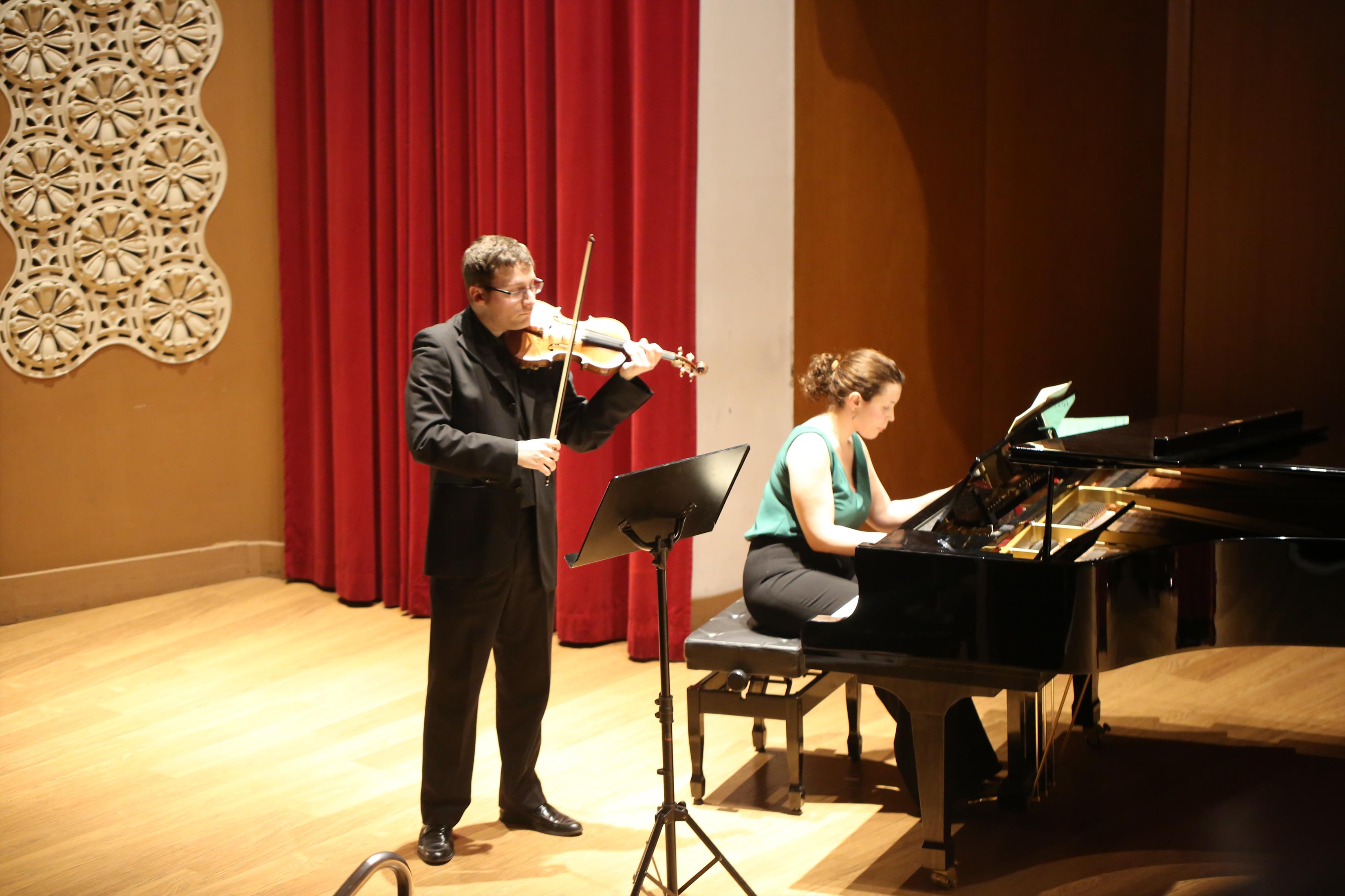La primera actuación del Dúo Dalí trajo hasta el teatro de nuestra institución la música romántica. D. Fernando Pascual (violín) y Dña. Aída Velert (piano) hicieron las delicias del auditorio y ofrecieron un recital de música romántica en el que tocaron entre otras piezas: