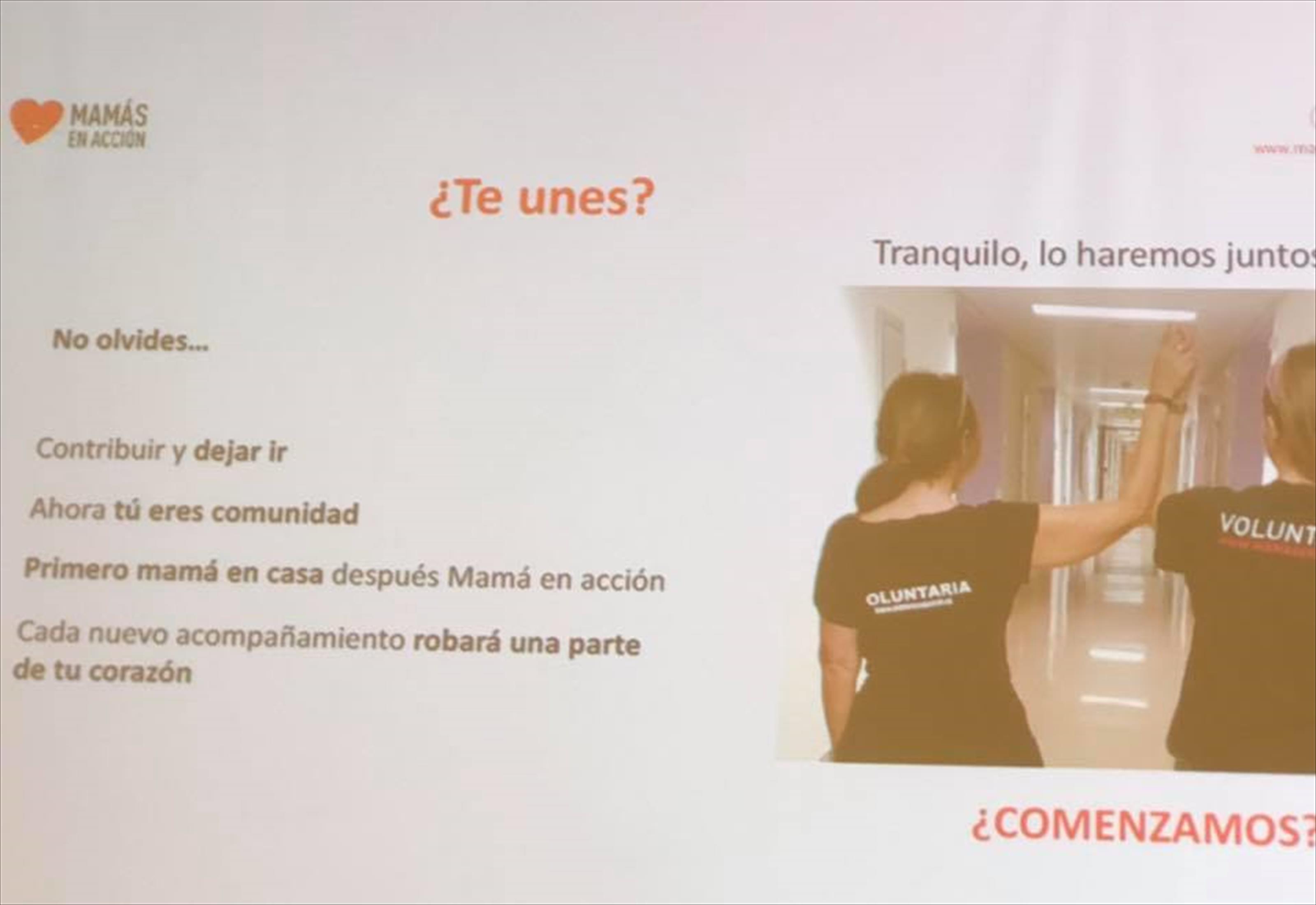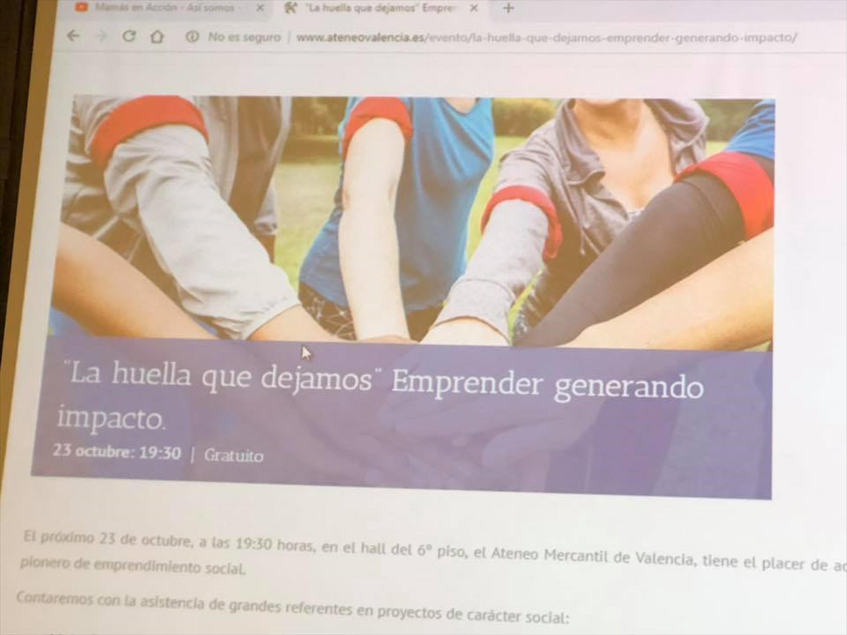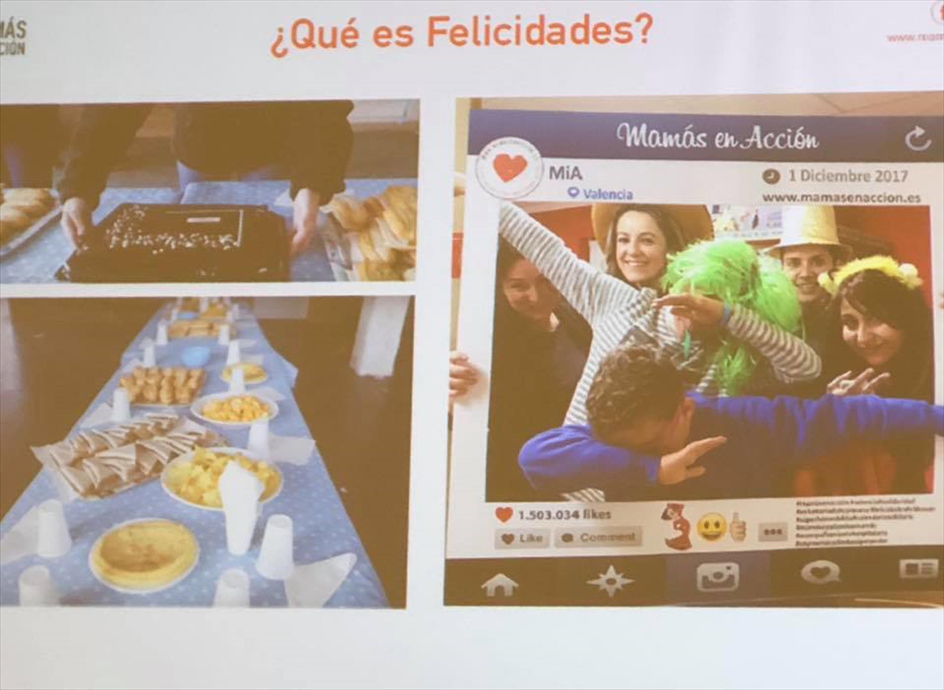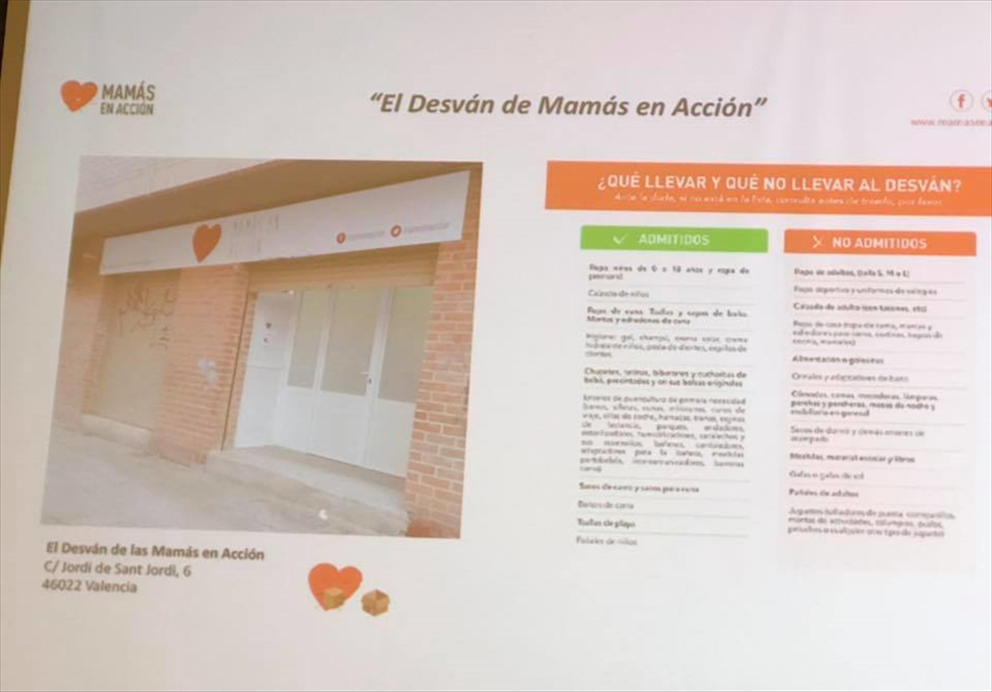 Los ponentes explicaron sus proyectos y respondieron las preguntas de los asistentes. Estsas fueron algunas de sus intervenciones: Majo Gimeno: "Un ejemplo de la labor que hacemos desde Mamas en Acción es la de un bebé en desamparo que está en la incubadora en el Hospital La Fe, que pesa 900 gramos, y gracias a los achuches de las voluntarias de Mamas en Acción está engordando y pesa ya 1,5 kilogramos".