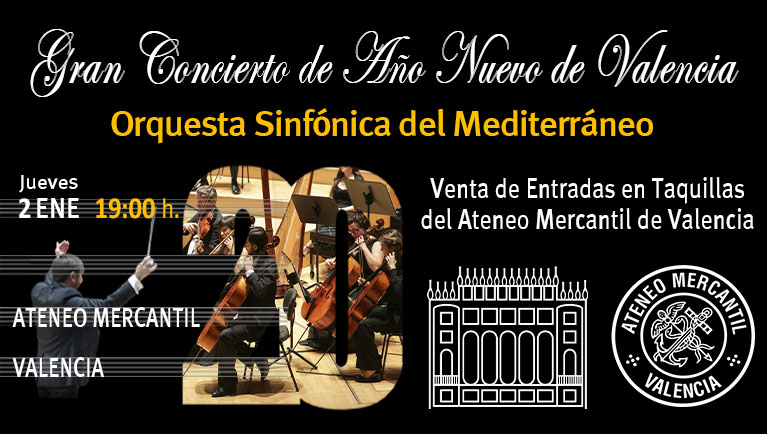 El Ateneo Mercantil de Valencia ha logrado que el tradicional Gran Concierto de Año Nuevo de Valencia llegue hasta nuestro Salón de Actos el próximo jueves 2 de enero a las 19 horas. El mejor concierto estas Navidades vendrá de nuevo al centro de Valencia, a la Plaza del Ayuntamiento. Un evento que contará con la prestigiosa Orquesta Sinfónica del Mediterráneo dirigida por Juan Antonio Ramírez que ofrecerá un concierto único con un repertorio innovador, en el que habrá baile clásico y varias sorpresas que iremos desvelando poco a poco.