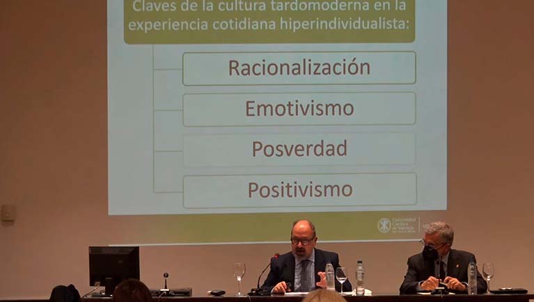 Una conferencia en la que se trató las dificultades del hombre contemporáneo para entenderse a sí mismo, para conocer su telos y para ejercer su libertad. En la Gaia Ciencia, Nietzsche profetizó un escenario sin Dios (en el que la noche es más noche y el futuro se agranda, y hace falta encender las linternas en pleno día). Nos preguntaremos si se ha cumplido su profecía, intentando explicar las claves de la cultura tardomoderna en nuestra experiencia cotidiana (racionalización, emotivismo, existencialismo y posverdad); y cómo la pérdida de los asideros que fijaban nuestra relación con el mundo (familia, trabajo y religión) nos ha dejado ayunos de sentido y expuestos a la manipulación.
