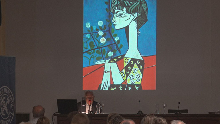 Rafael Sancio que tiene madonas y obras religiosas de gran calidad, pero tiene un retrato de una calidad excepcional Baltasar Castiglione, un hombre acomnodado, un mercader, y lo significativo del cuadro es que auque el fondo es neutro, es más claro que el traje y da profundidad. Atención al rostro y a sus ojos. Con Tizino de Celio, nos encontramos en el Marienismo. La conferencia va desgranando épocas y siglos hasta llegar al siglo XX con el Autorretrato de Frida Kahlo o con los retratos de Pablo Picasso con Retrato de Jacqueline Roque con flores.