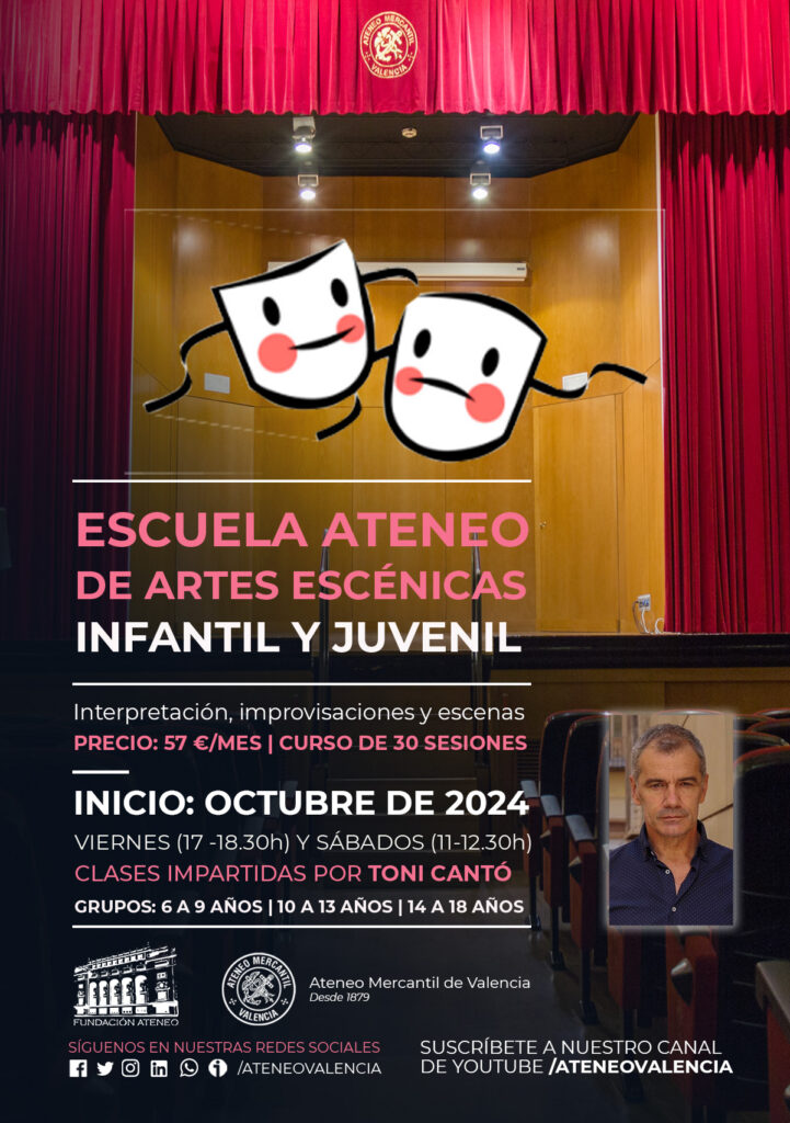 La Fundación del Ateneo Mercantil de la CV estrena un nuevo curso de teatro de la mano de la Escuela Ateneo de Artes Escénicas para los más jóvenes. Un curso destinado para el público infantil y juvenil en el que contarán con 30 sesiones de trabajo de la mano de un actor profesional como es Toni Cantó.