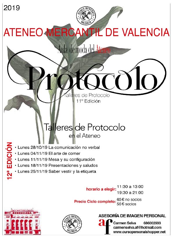 Duodécima edición de los Talleres de Protocolo del Aula de Moda del Ateneo que organiza la Asesoría de Imagen Personal de Carmen Selva. Hoy lunes 25 de noviembre arranca la quinta y última de la clases con el "Saber vestir y la etiqueta". En la Sala Multiusos - Tertulia Taurina.
