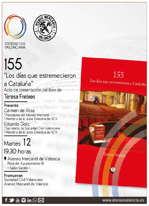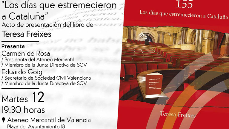 La Catedrática de Derecho Constitucional en la Universidad Autónoma de Barcelona, Dª. Teresa Freixes, presenta este martes 12 de marzo, a las 19 horas, en el Salón Sorolla del Ateneo Mercantil de Valencia su libro "155. Los días que estremecieron a Cataluña". Un acto organizado por Sociedad Civil Valenciana y en el que colabora el Ateneo Mercantil de Valencia. A Teresa Freixes como a tantos otros catalanes, los partidos secesionistas insisten en decirles lo que tienen que hacer y pensar. Así lo relata en su último libro en que, además de su experiencia personal, analiza al detalle el "procés", más allá de lo que la profesora denomina "los plenos de la vergüenza" celebrados en el Parlamento catalán en septiembre del 2017.