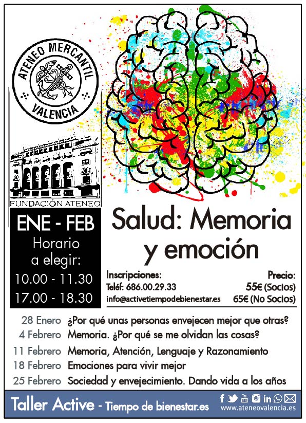 El Ateneo Mercantil acoge un taller sobre la Salud que abarcará la memoria y sus emociones y que organiza la Fundación Ateneo Mercantil y Active - Tiempo de bienestar.es. El taller consta de cinco sesiones y se llevará a cabo durante el mes de enero y de febrero. La quinta y última de las sesiones será el martes 25 de febrero y llega bajo el título "Sociedad y envejecimiento. Dando vida a los años".