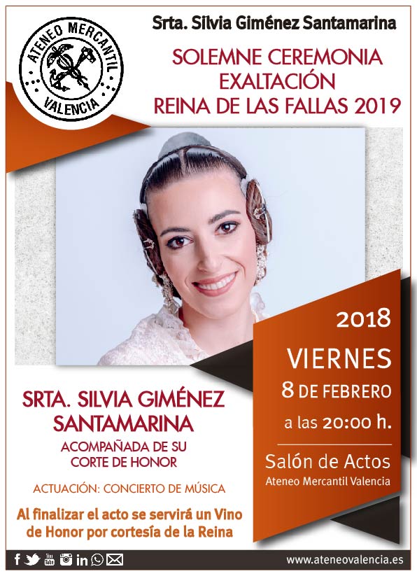 Un año más, se acercan la Fiestas Josefinas y en el Ateneo iniciamos los actos falleros con la exaltación de la Reina del Ateneo 2019 en el Salón de Actos. Una ceremonia en la que se presenta en sociedad a la Srta. Silvia Giménez Santamarina y su Corte de Honor. Ya han confirmado su presencia varias comisiones falleras que quieren darle la bienvenida a nuestra Reina del Ateneo 2019. Además, se celebrará un Concierto de Música y al finalizar el acto se servirá un vino de honor cortesía de nuestra Reina Fallera.