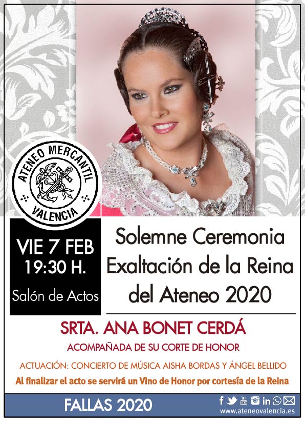 Un año más, se acercan la Fiestas de Fallas y en el Ateneo Mercantil iniciamos los actos con la solemne celebración de la Exaltación de la Reina del Ateneo 2020 en el Salón de Actos. Una ceremonia en la que se presenta en sociedad a la Srta. Ana Bonet Cerdá y su Corte de Honor: las Srtas. Mónica Bascuñan Morell, Marta Parra Herrero, Irene Carreras Jiménez, Elena Albo Jiménez, Pepa Falomir Esteve y Julia Falomir Esteve.