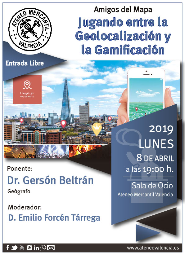 Nueva conferencia de Amigos del Mapa, en el que D. Gersón Beltran nos introducirá en el mundo de la Geolocalización y la Gamificación. La cita tendrá lugar el lunes 8 de abril, a las 19:00 horas en la Sala de Ocio del Ateneo Mercantil.