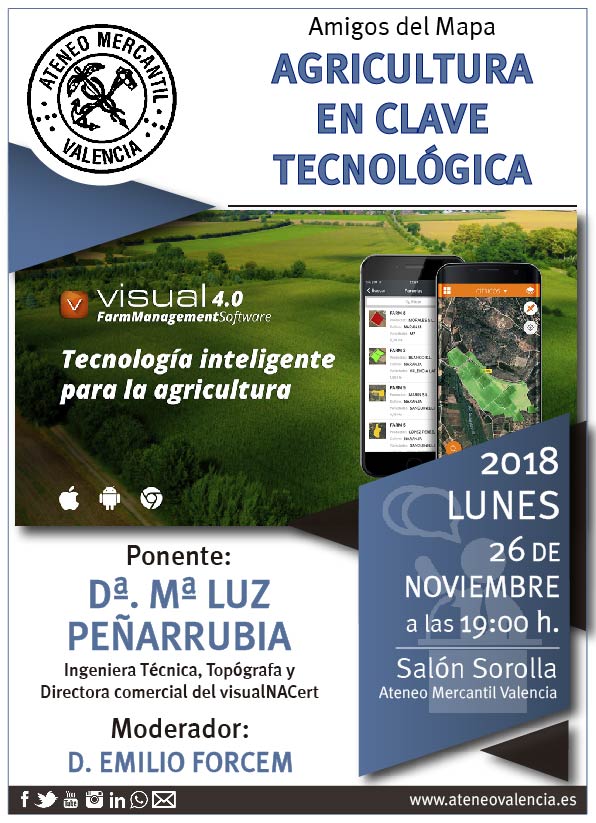Los Amigos del Mapa traen hasta el Ateneo Mercantil una nueva conferencia en la que se hablará largo y tendido sobre las nuevas tecnologías aplicadas a la agricultura. La conferencia llega bajo el título "Agricultura en clave tecnológica" y la ponente será la Ingeniera Técnica, Topógrafa y Directora comercial del visualNACert, Dª. Mari Luz Peñarrubia.