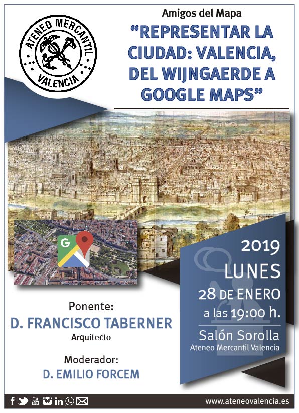 Los Amigos del Mapa regresan en este 2019 con una gran conferencia sobre la representación de la ciudad de Valencia. El arquitecto valenciano, D. Francisco Taberner, hará una conferencia que se titula "Representar la ciudad: Valencia, del Wijngaerde al Google Maps". Wijngaerde viajó desde Barcelona, por la línea litoral, y Anthonie dibujó Sagunto (Morvedre), Valencia, La Albufera y Xátiva. Fue el geógrafo investigador Vicenç M. Rosselló quien descubrió, en 1986, la existencia de estas imágenes de parajes valencianos en la Österrreischische Nationalbibliothek de Viena. Gracias a este descubrimiento vio la luz el libro «Les Vistes Valencianes d’Anthonie van del Wijngaerde», editado por la Conselleria de Cultura, Educació i Ciència de Valencia, (1990) y firmado por el propio Vicenç y otros 8 investigadores más.