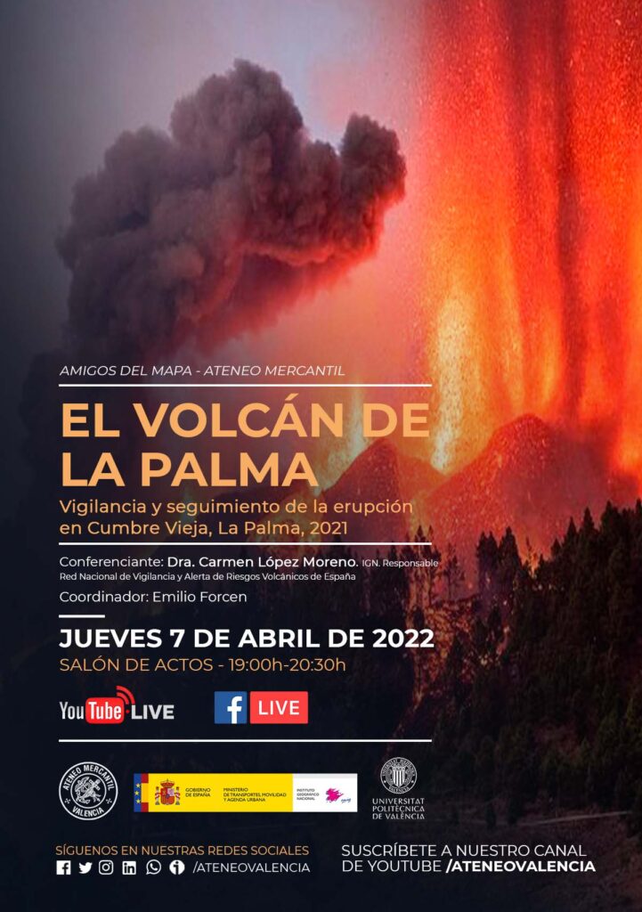 Así, el próximo jueves 7 de abril, a las 19 horas y en el Salón de Actos del Ateneo Mercantil de Valencia, en colaboración con el Instituto Geográfico Nacional y la Universidad Politécnica de Valencia, arrancan con la conferencia "Vigilancia y seguimiento de la erupción en Cumbre Vieja, La Palma, 2021" y lo harán conversando con la Dra. Carmen López Moreno, Doctora en Ciencias de la Tierra por la Universidad de Barcelona, funcionaria del MITMA y responsable de la Unidad de Vigilancia volcánica del IGN desde 2005. Ellas es una de las expertas más cualificadas en materia de vulcanologia y sismos, quien ha vivido desde el primer momento el tema de la erupción volcánica en La Palma.