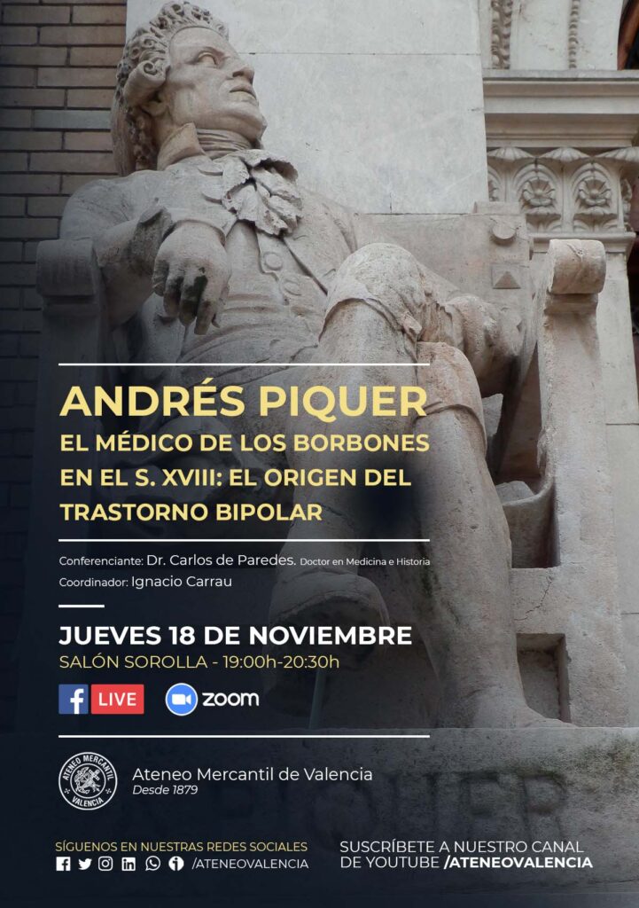 El Ciclo de Conferencias llega el próximo jueves 18 de noviembre a las 19 horas en el Salón Sorolla con la ponencia "Andrés Piquer, el médico de los Borbones en el s. XVIII: el origen del trastorno bipolar" y que ofrecerá el médico e historiador D. Carlos De Paredes Cencillo, que es Doctor en Medicina y en Historia Moderna.