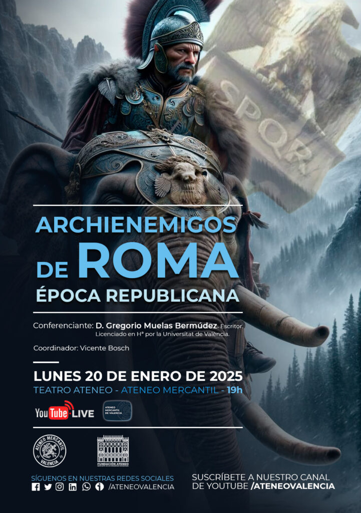 Gregorio Muelas nos desgranará a los grandes archienemigos de Roma, los mayores rivales a los que se enfrentaron los romanos a lo largo de la historia de la República. Europa, como es lógico, aporta la mayor parte de archienemigos. De Hispania, de Britania, de la Galia, también de la propia Italia. También de Grecia, los pueblos germánicos, alamanes, tervingios, burgundios, godos, vándalos, hérulos...