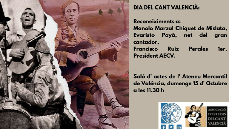 Enguany l’ AECV celebra el Dia del Cant Valencià recordant la figura de Manuel Marzal Barberà (Chiquet de Mislata) 1918 – 1993. Un dels grans cantadors del moment que a més a més fon un gran versador d’improvís. Creant escola de cant, Marzal fon mestre de cantaors de la talla de Marineta, Victorieta, Chiquet del Túria, Mª José de Pinedo, o Marisé per posar alguns eixemples. Va promoure, a través de la rondalla que dirigia Felicià Sousa, la transposició de tonalitats per a possibilitar l’interpretació del cant valencià a persones que disposant de qualitats melòdiques interessants no posseïen el registre agut que se demandava. Igualment va compilar els materials per a una antologia del cant valencià que posteriorment es publicaria de la mà de l’investigador Carles Pitarch Alfonso. El Chiquet de Mislata ha segut i és un referent en l’interpretació del cant valencià, referent que volem ressenyar en el trenta aniversari de la seua desaparició.
