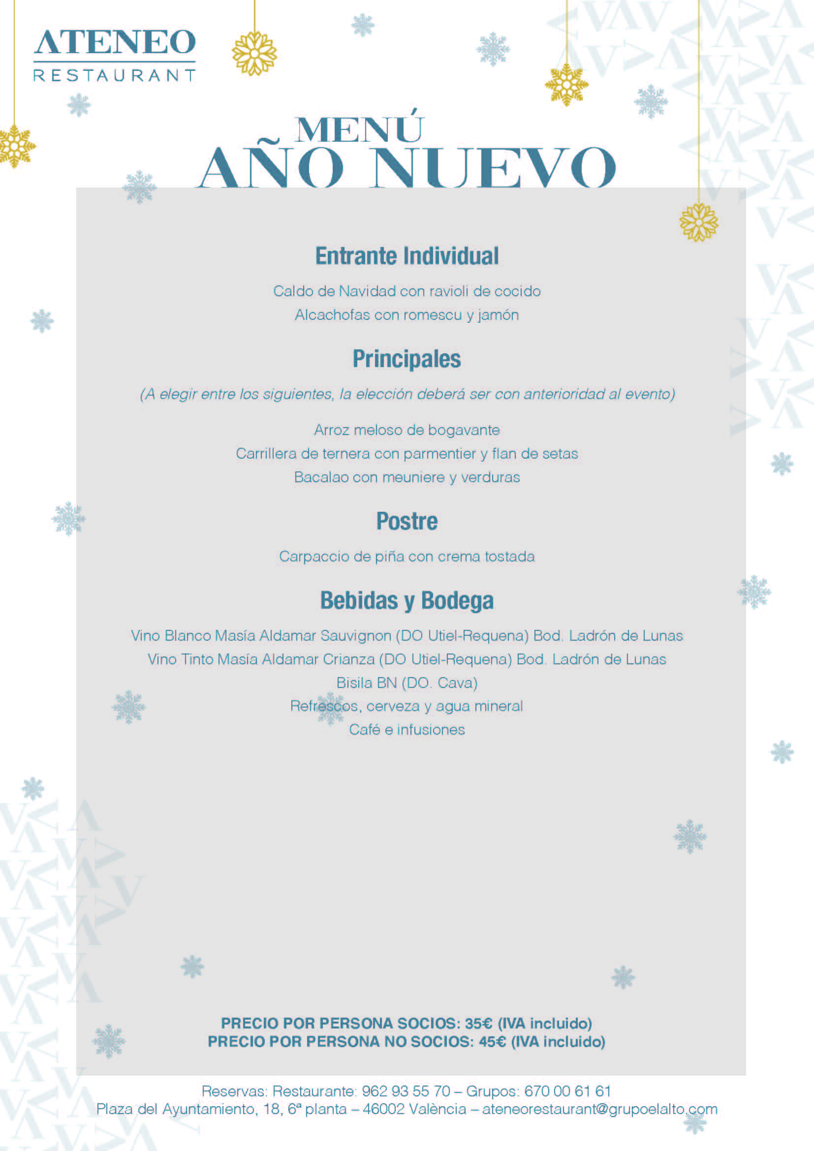 Recuerda que en todas nuestras instalaciones se cumple las medidas sanitarias y de seguridad que marca la normativa Covid19 estipulada por la Conselleria de Sanitat. El Grupo El Alto ha dado a conocer el menú que ofrecerá en la comida de Año Nuevo que consta de un entrante individual, se deberá elegir un plato entre los principales y postre. Recuerda que ya puedes reservar tu plaza en el Ateneo rMercantil para comer el 1 de enero. Las reservas se pueden hacer en el propio Restaurante (sexta planta del edificio) o bien reservando en el teléfono 96.293.55.70 y 670.00.61.61.